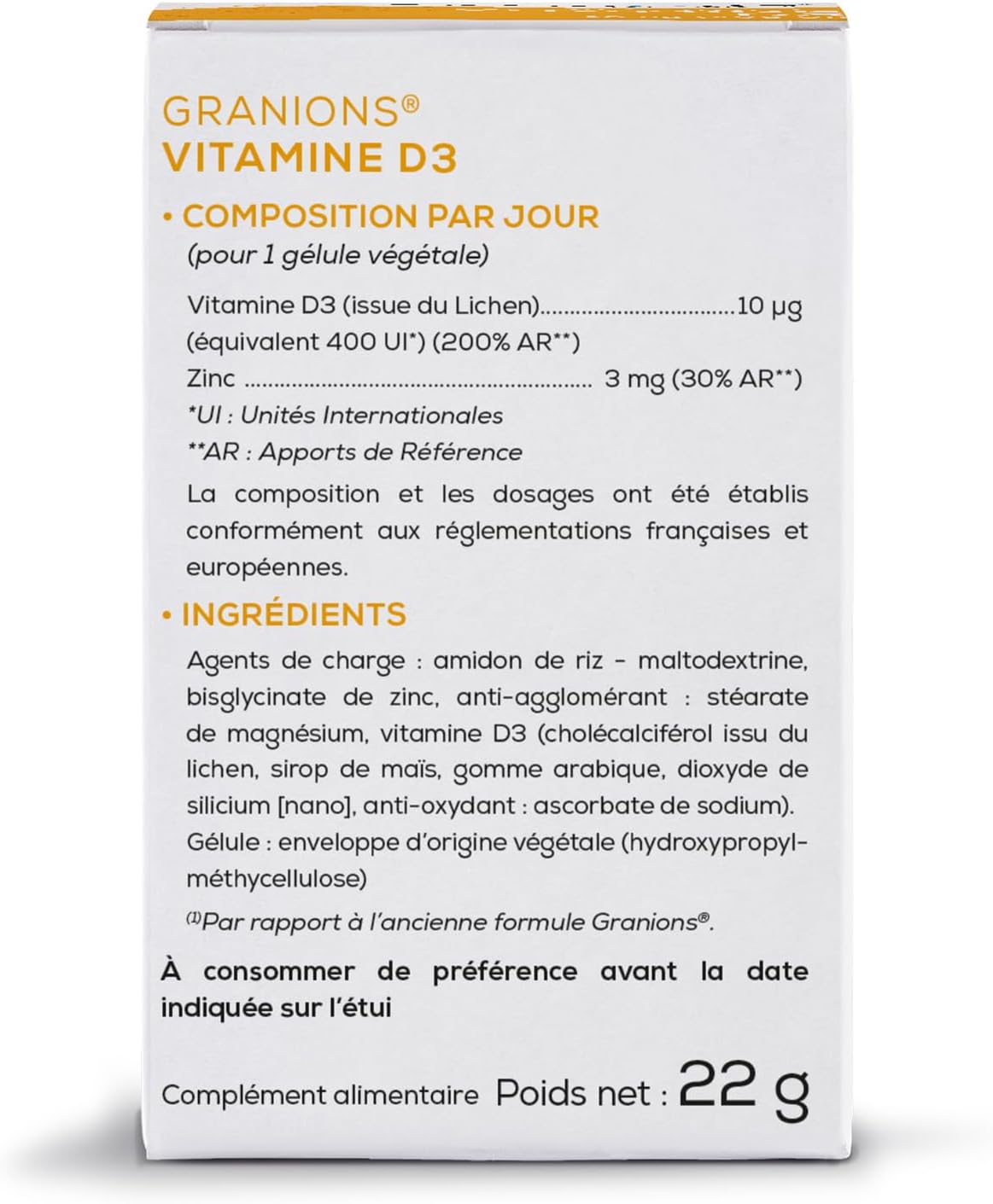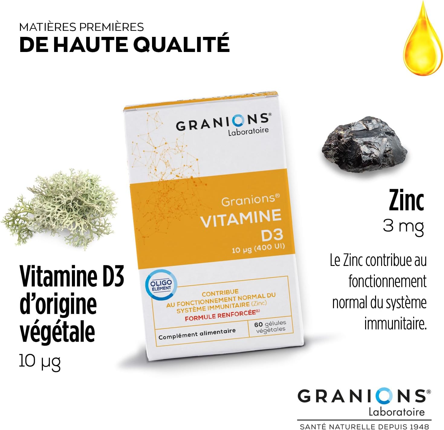 VITAMIN D3 + ZINC – Our dietary supplement, Vitamin D3 400 IU (10 µg), combines the power of Vitamin D3 and zinc bisglycinate to optimize your immune defenses and your overall well-being.
