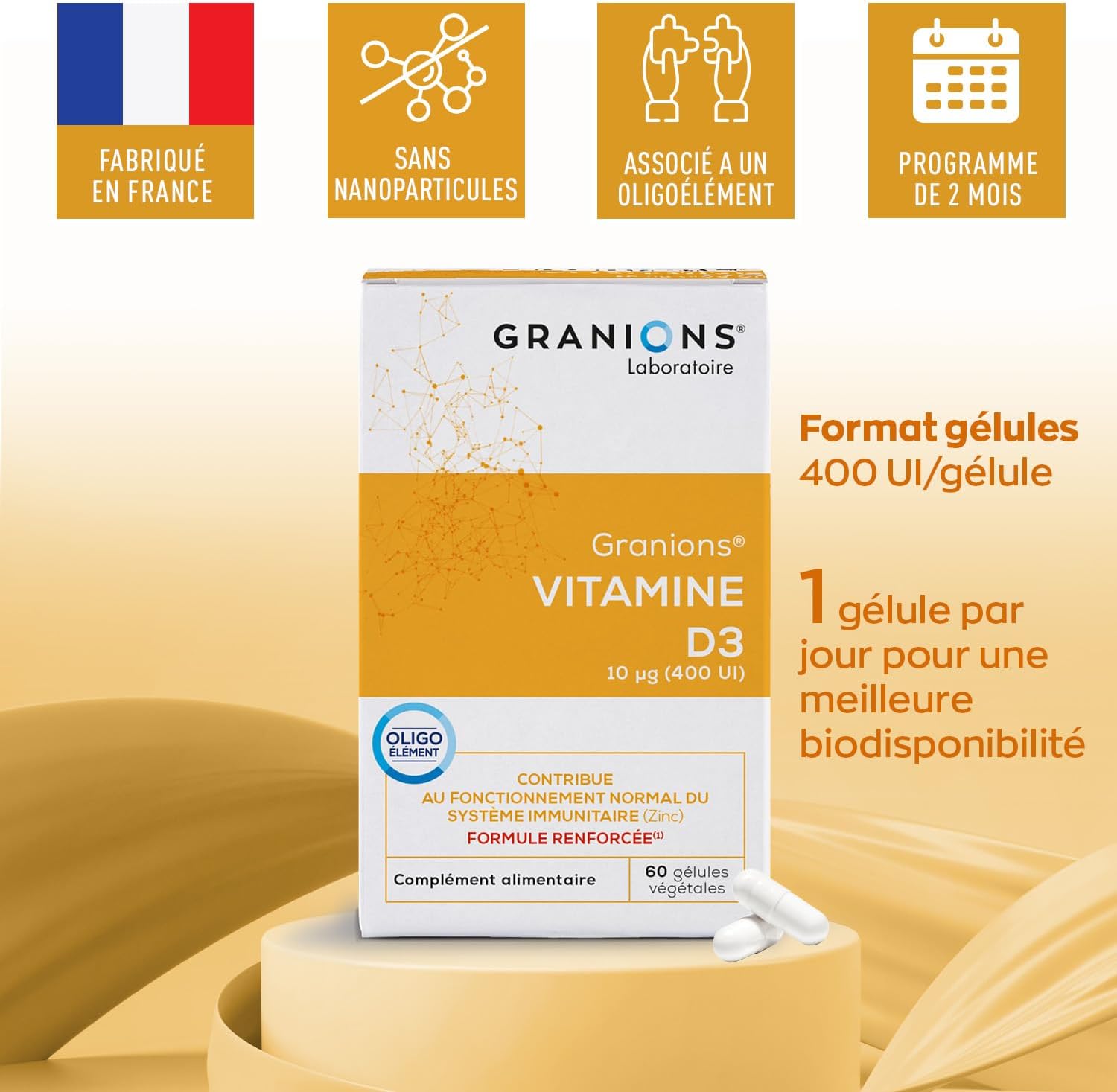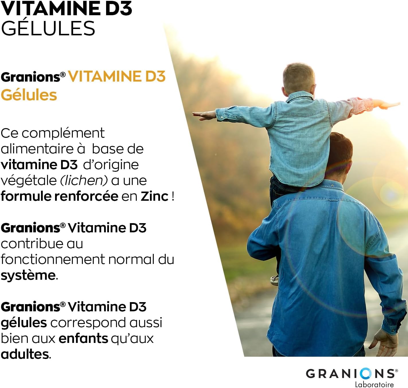 Discover Granions Vitamin D3 10 µg (400 IU), a dietary supplement designed to meet the needs of vitamins, minerals and supplements. Formulated with Vitamin D3 derived from lichen and zinc bisglycinate, this product supports adult immunity while contributing to adult immune defense and maintenance of strong bone capital. Ideal for adult vitamins, it offers a practical and effective solution thanks to its vegetable capsules suitable for daily consumption. Vitamin D3 promotes calcium absorption and supports muscle health, while zinc boosts immune functions for optimal well-being. Each capsule provides 200% of the recommended intake of Vitamin D3, guaranteeing maximum effectiveness for your natural defenses. This gluten-free food supplement is recommended for adults, pregnant women and young children. With a capacity of 60 capsules for two months of use, it fits easily into your daily routine. Made in France by Laboratoires Granions, experts in vitamins and minerals, this product combines quality, innovation and efficiency. Boost your immune defenses and take care of your bone capital with Granions Vitamin D3, an essential ally for sustainable health.