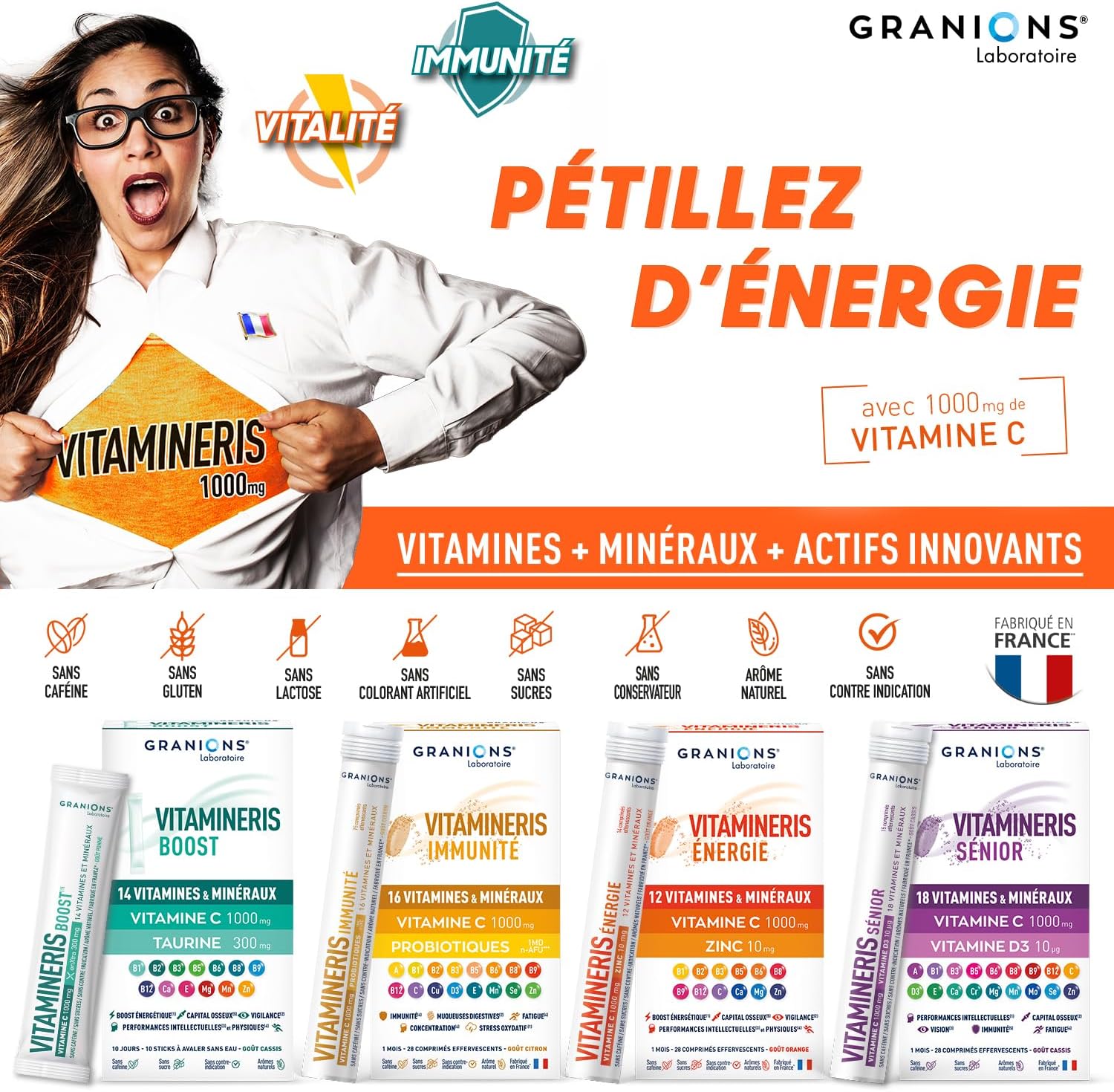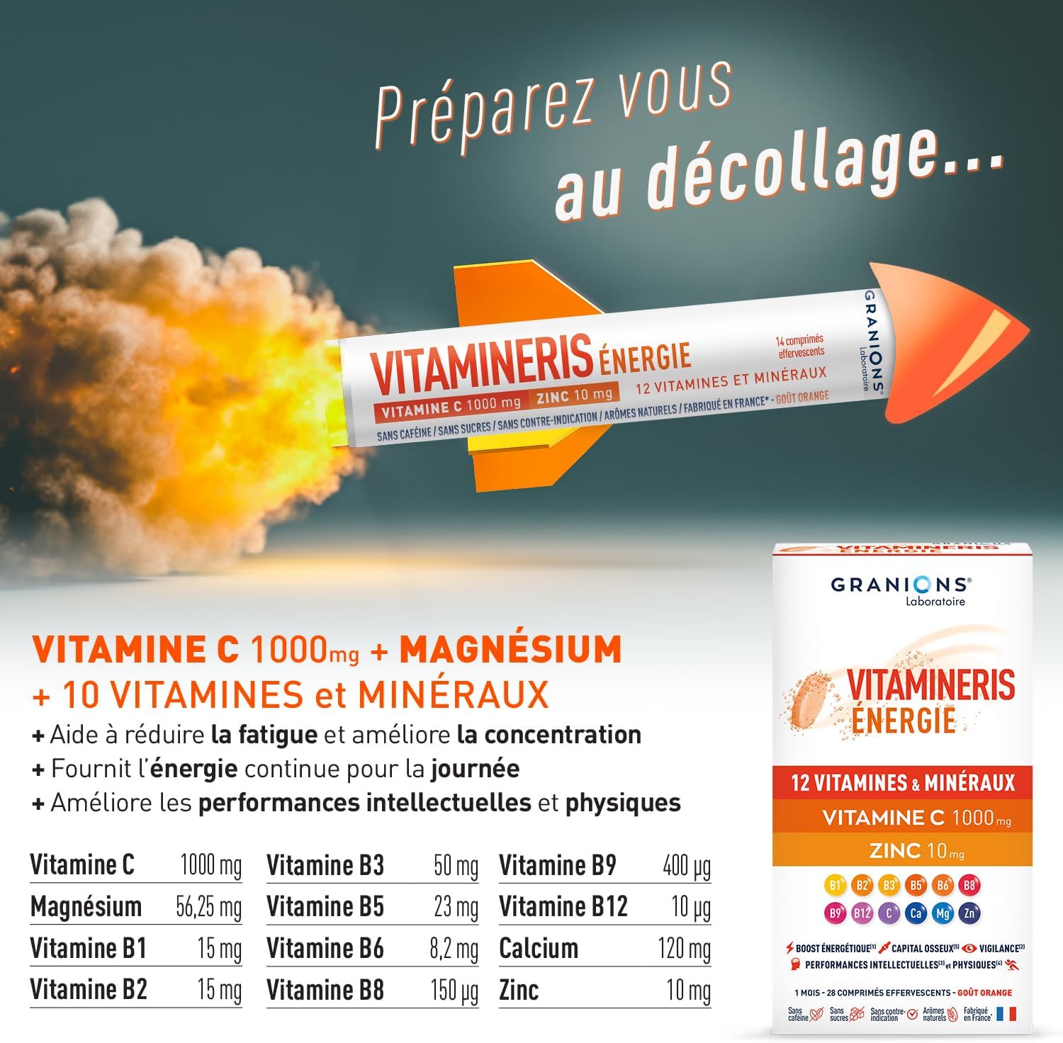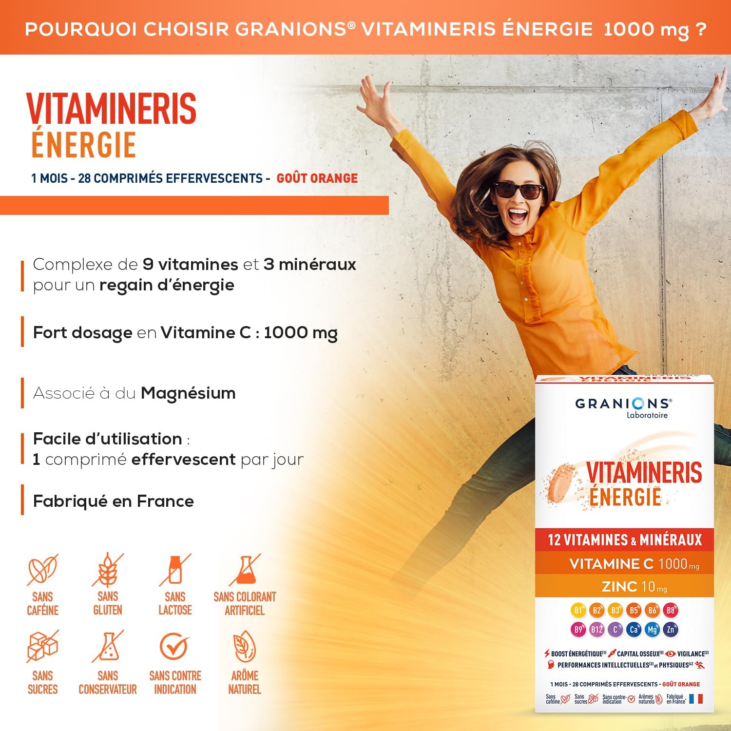 In certain periods of life, environmental factors such as cold, stress, lack of sleep, recovery phases or intense physical activity can stress and weaken the body. Vitamins and minerals are essential to protect it from these external aggressions. To stimulate the essential functions of your body and preserve your health capital, the Laboratoire des Granions has developed VITAMINERIS Energy 1000mg, a concentrate of 9 vitamins and 3 minerals. This unique combination supports your physical and mental fitness on a daily basis. It contains 1000 mg of Vitamin Ce Magnesium, which contributes to energy metabolism and help reduce fatigue. (1)Vitamin C helps reduce fatigue and normal energy metabolism. It helps in the normal functioning of the nervous system and combating oxidative stress. (2)Zinc contributes to normal cognitive function as well as the fight against oxidative stress. Vitamin B5 contributes to normal intellectual performance and normal synthesis of neurotransmitters. Magnesium contributes to normal muscle function and the maintenance of normal psychological functions. (5) Calcium is necessary to maintain a normal bone. *Origin of EU/non-EU ingredients. IN WHAT CASES USED ENERGY 1000mg? + Fatigue+ Stress and overwork+ On physical and mental solicitation+ Change of season+ Recovery.