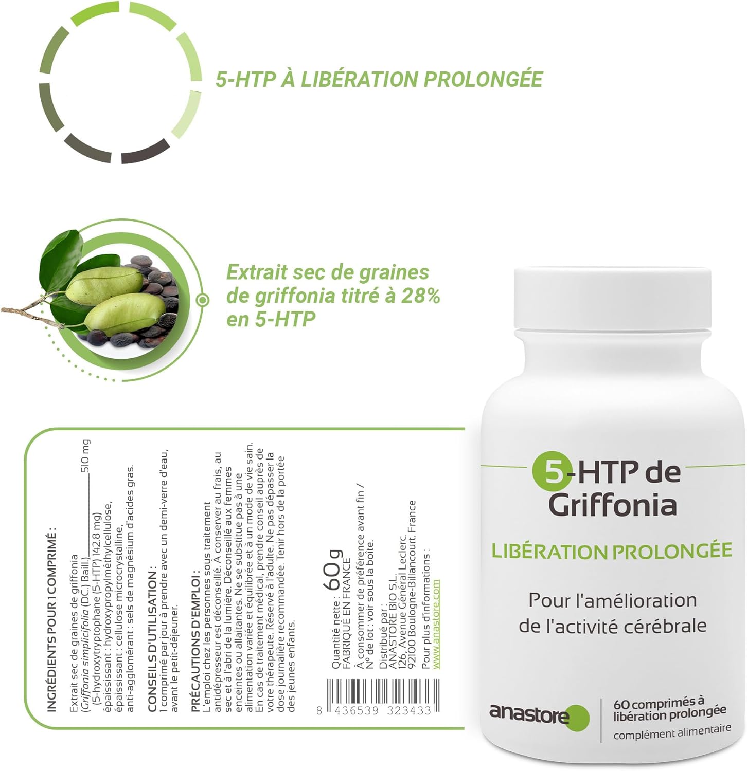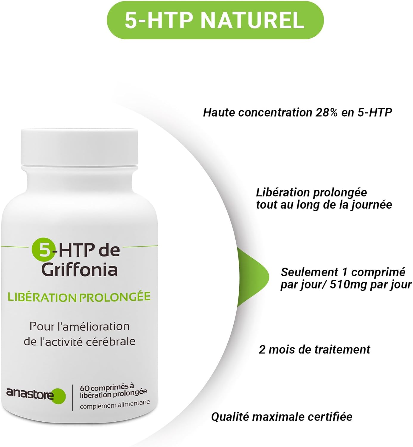 Anastore quality: Anastore Griffonia 5-HTP is designed according to GMP standards (Good Manufacturing Practices) and undergoes rigorous analysis to ensure quality. The result is a natural product without GMOs. This is a product developed by pharmaceutical experts and manufactured to strict quality and safety standards.