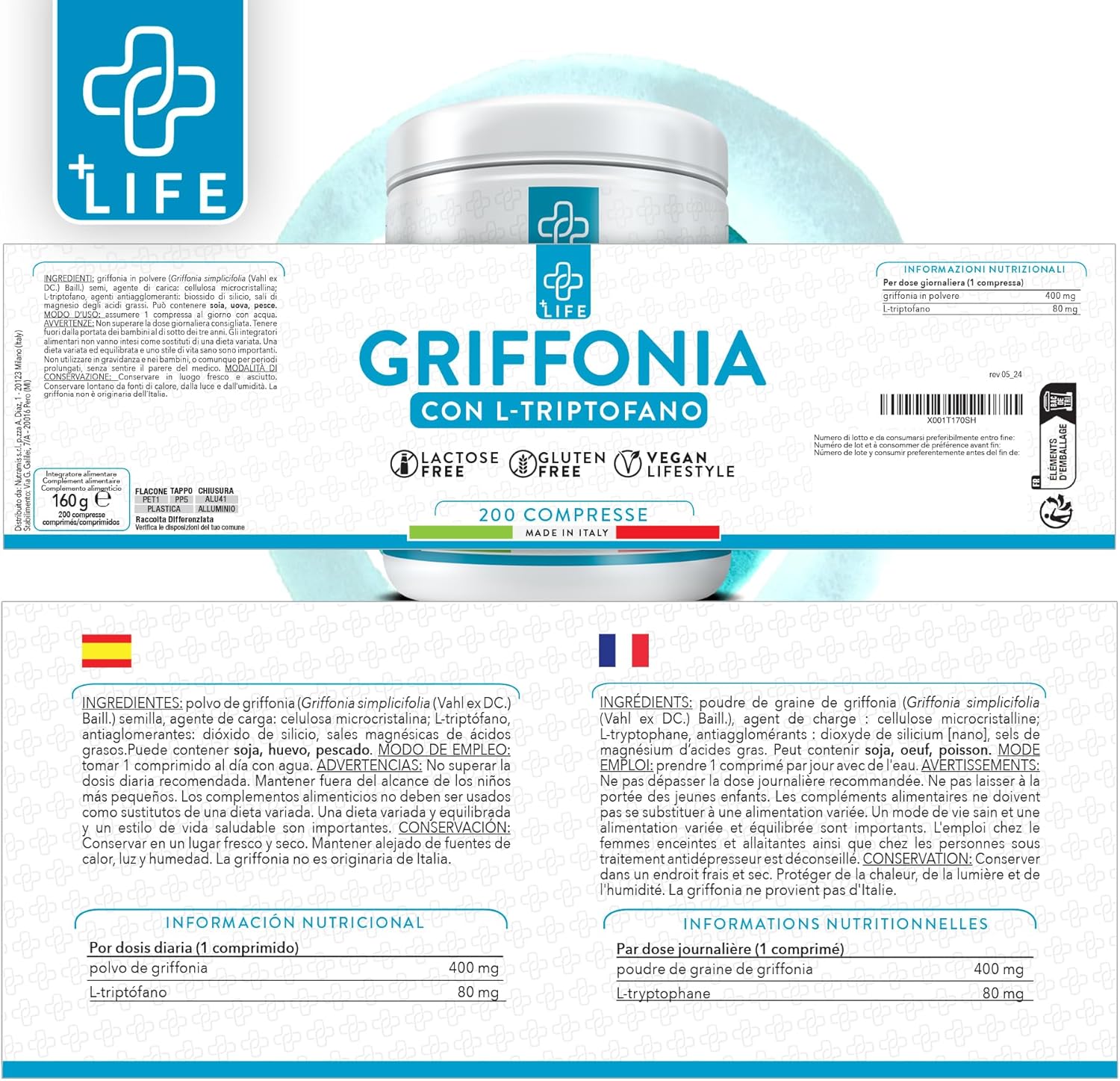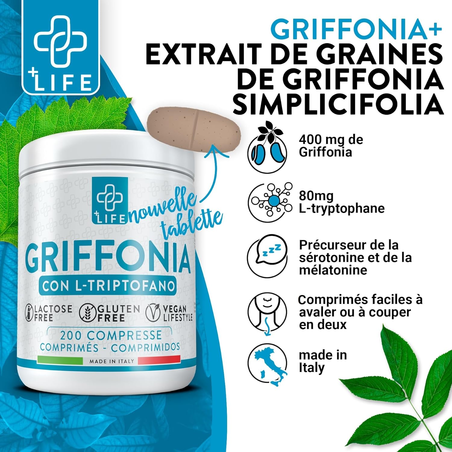 Griffonia Tryptophan High Dose PiùLife, 200 Tablets Of 400mg, Tryptophan Precursor Of Serotonin And Melatonin, For Better Sleep Natural, Good Mood, Anxiety And Stress