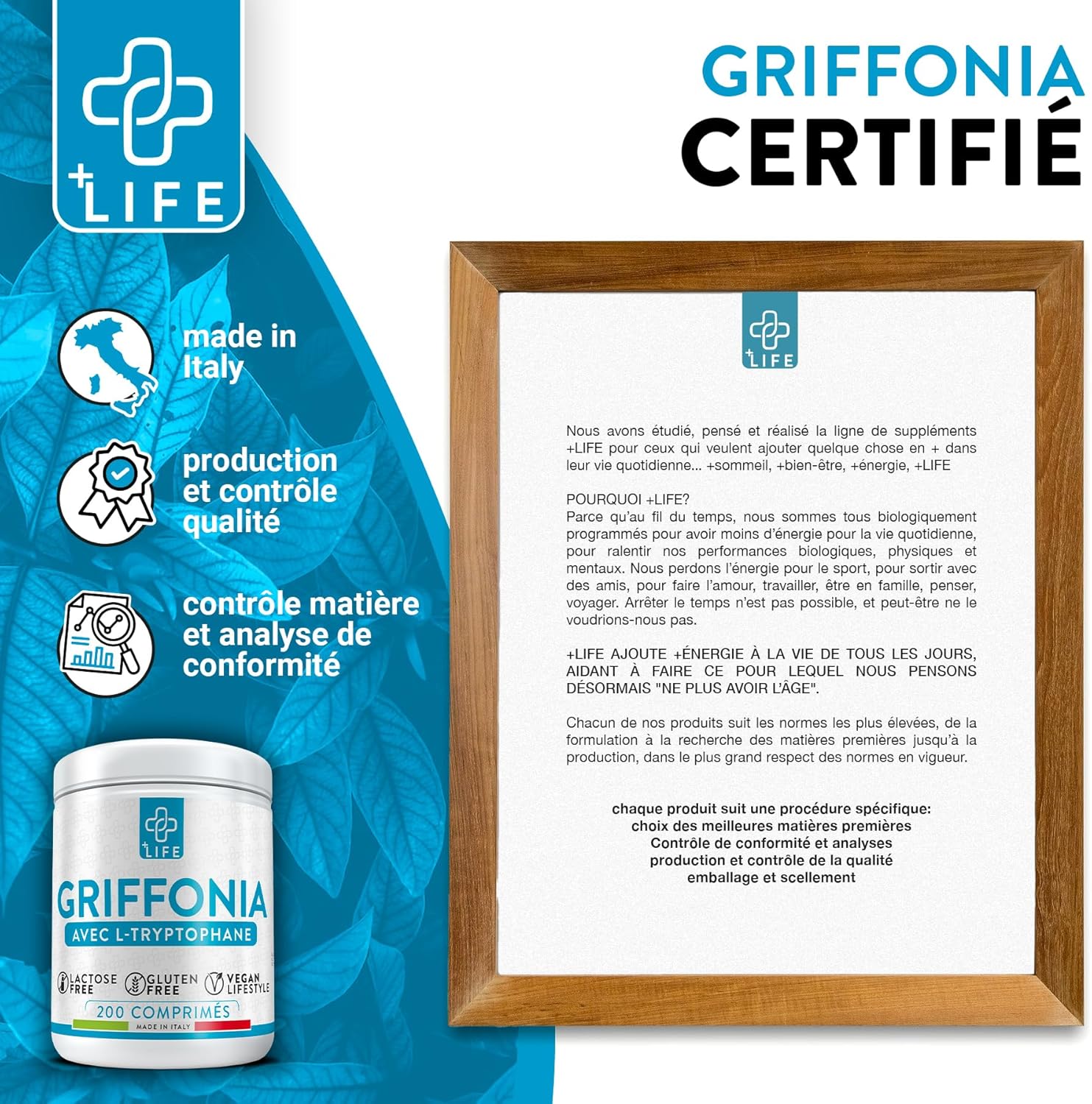 Griffonia Supplement – Tryptophan Supplement – Only From Plant Extracts: Griffonia Tablets PiùLife, can be used to naturally counteract lowering of mood tone (powerful serotonin), insomnia (stress stop) and excessive appetite!