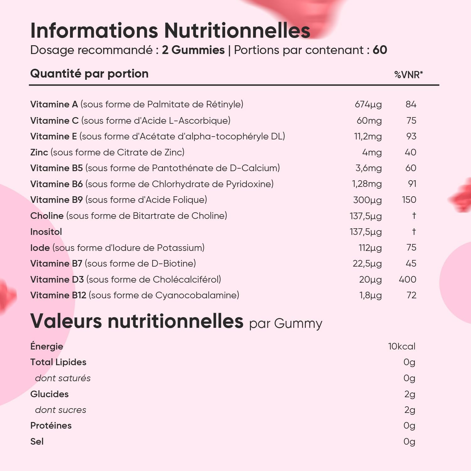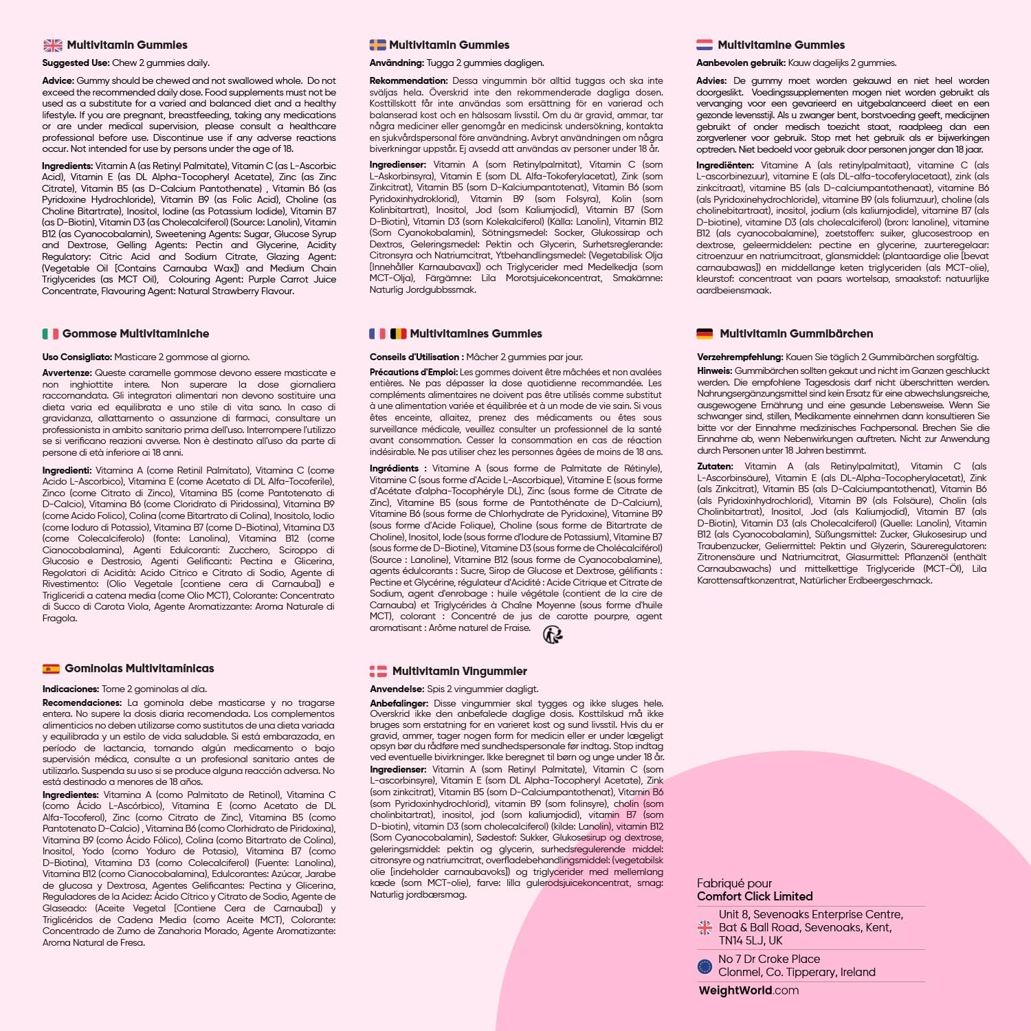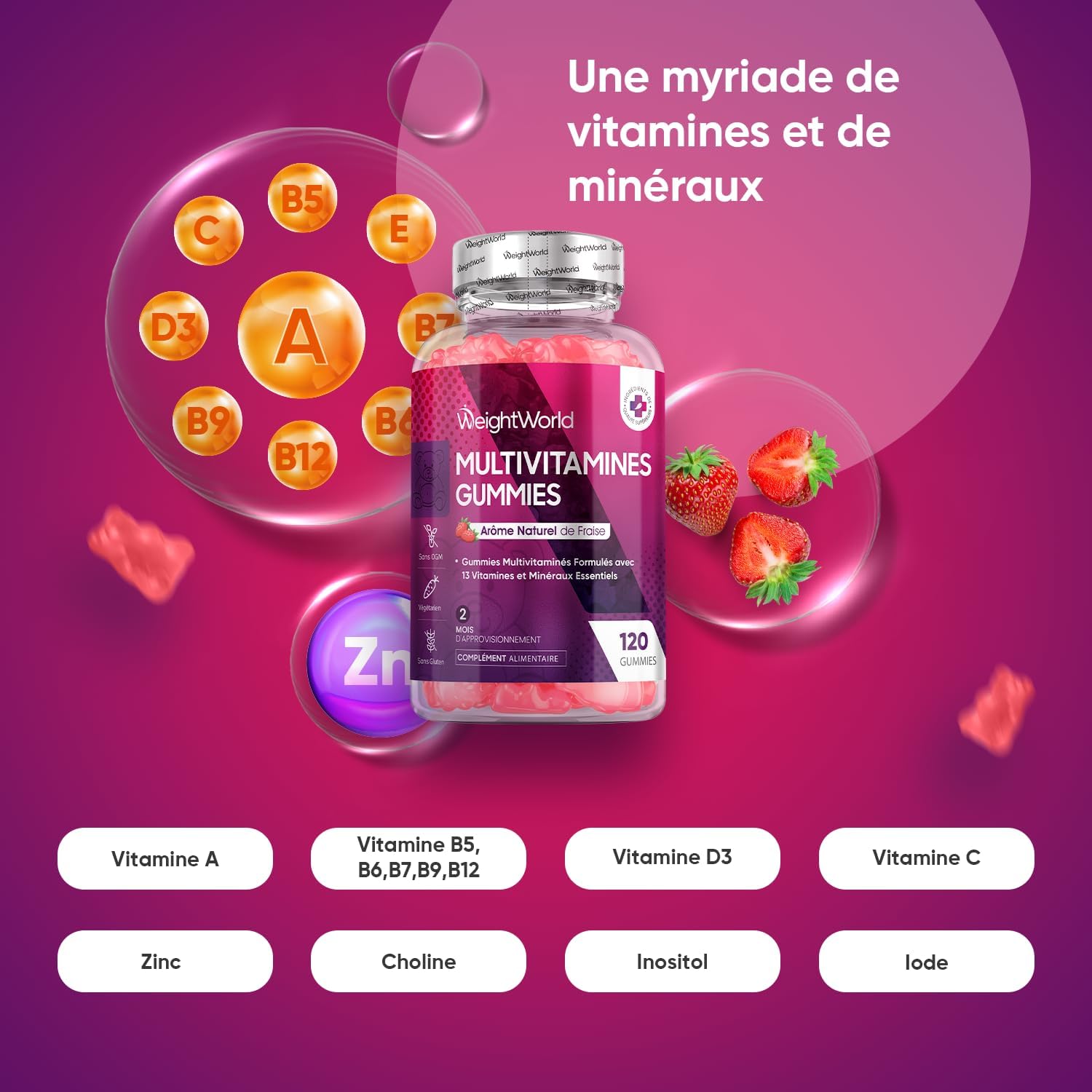 MULTIVITAMIN & MINERALS Gummies – Multivitamin & mineral chewing gums are formulated with 13 essential vitamins and minerals including Vitamin C, Vitamin D3, Vitamin B12, Zinc, Biotin Iodine, Vitamin A,E, Vitamin B6, B5, B9, Inositol and Choline. These 120 gummies with a delicious strawberry taste require only 2 gummies a day.