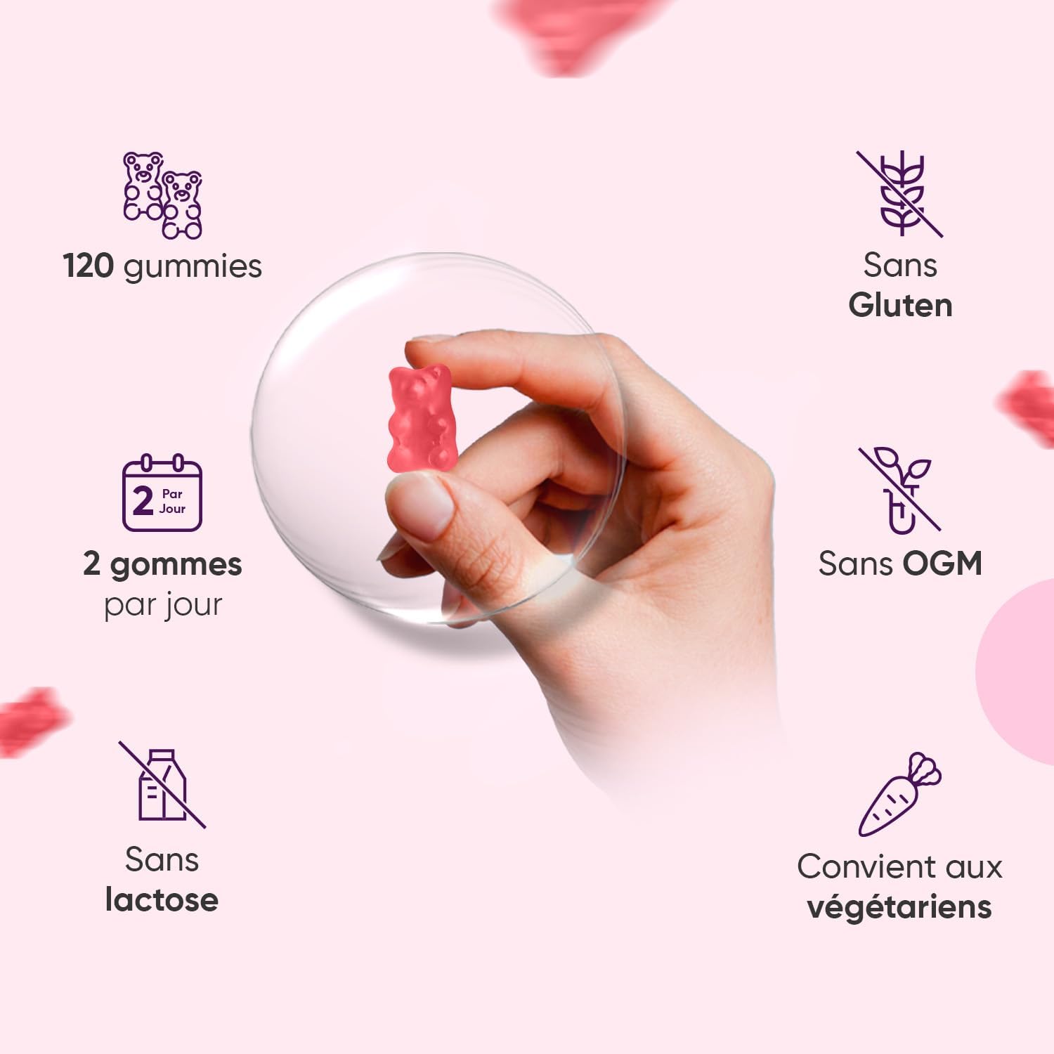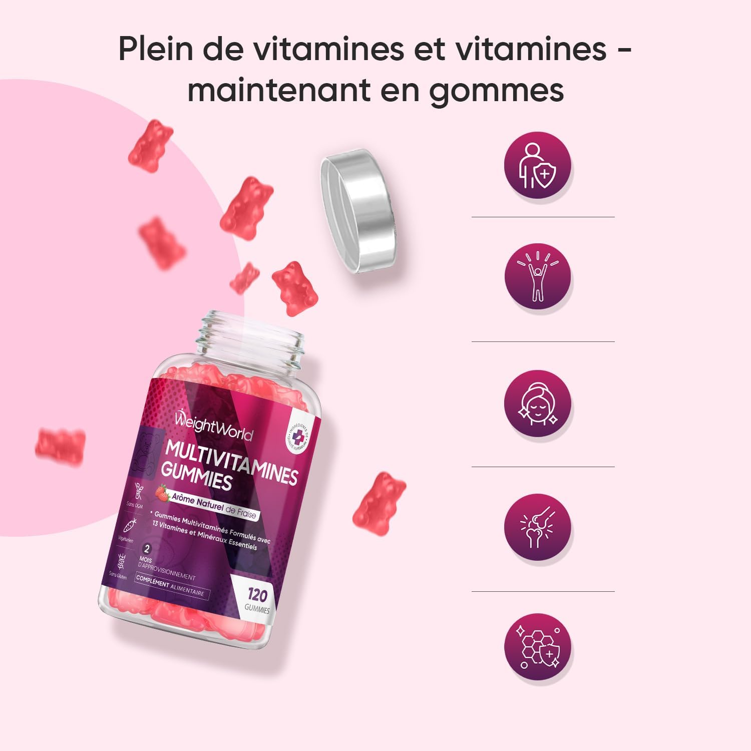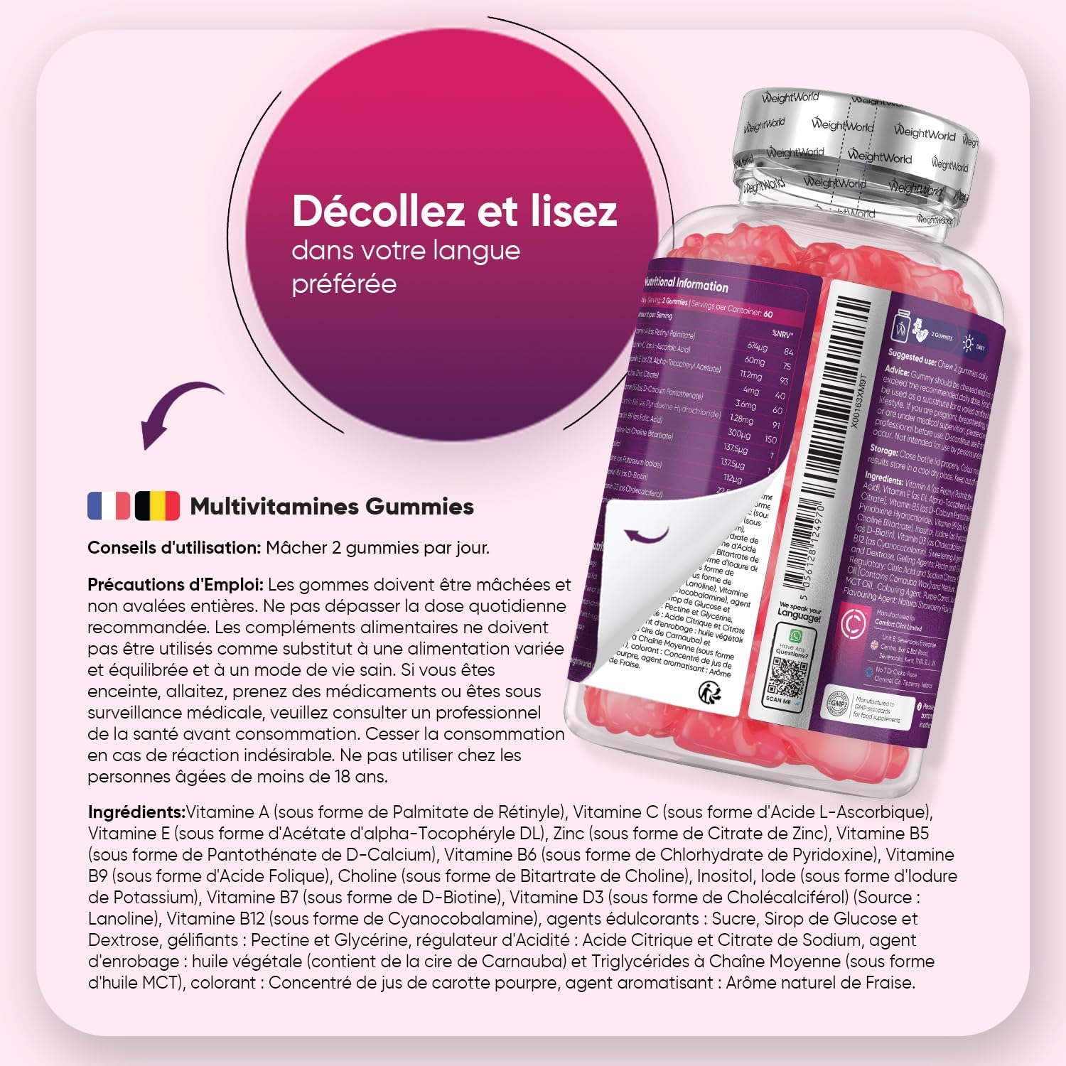 MULTIVITAMIN & MINERALS Gummies – Multivitamin & mineral chewing gums are formulated with 13 essential vitamins and minerals including Vitamin C, Vitamin D3, Vitamin B12, Zinc, Biotin Iodine, Vitamin A,E, Vitamin B6, B5, B9, Inositol and Choline. These 120 gummies with a delicious strawberry taste require only 2 gummies a day.