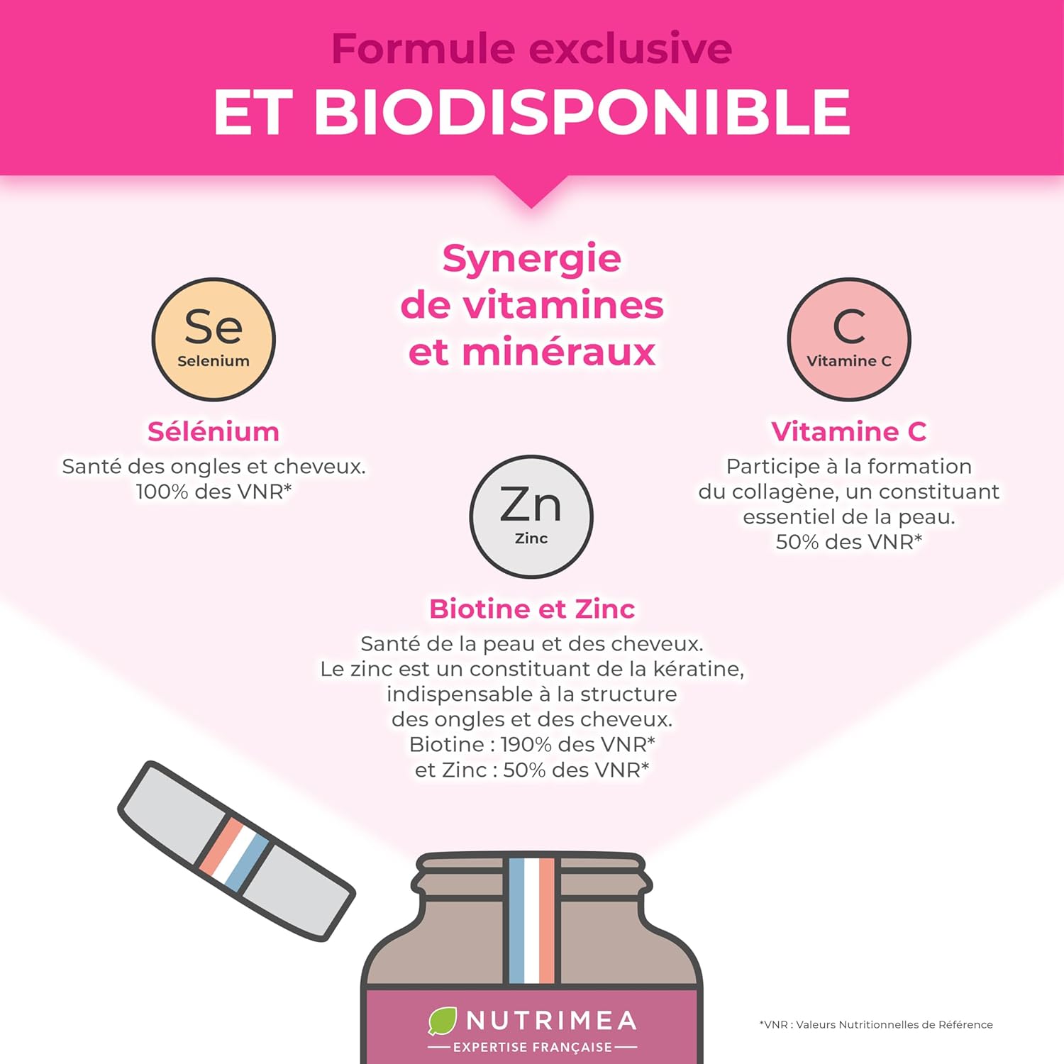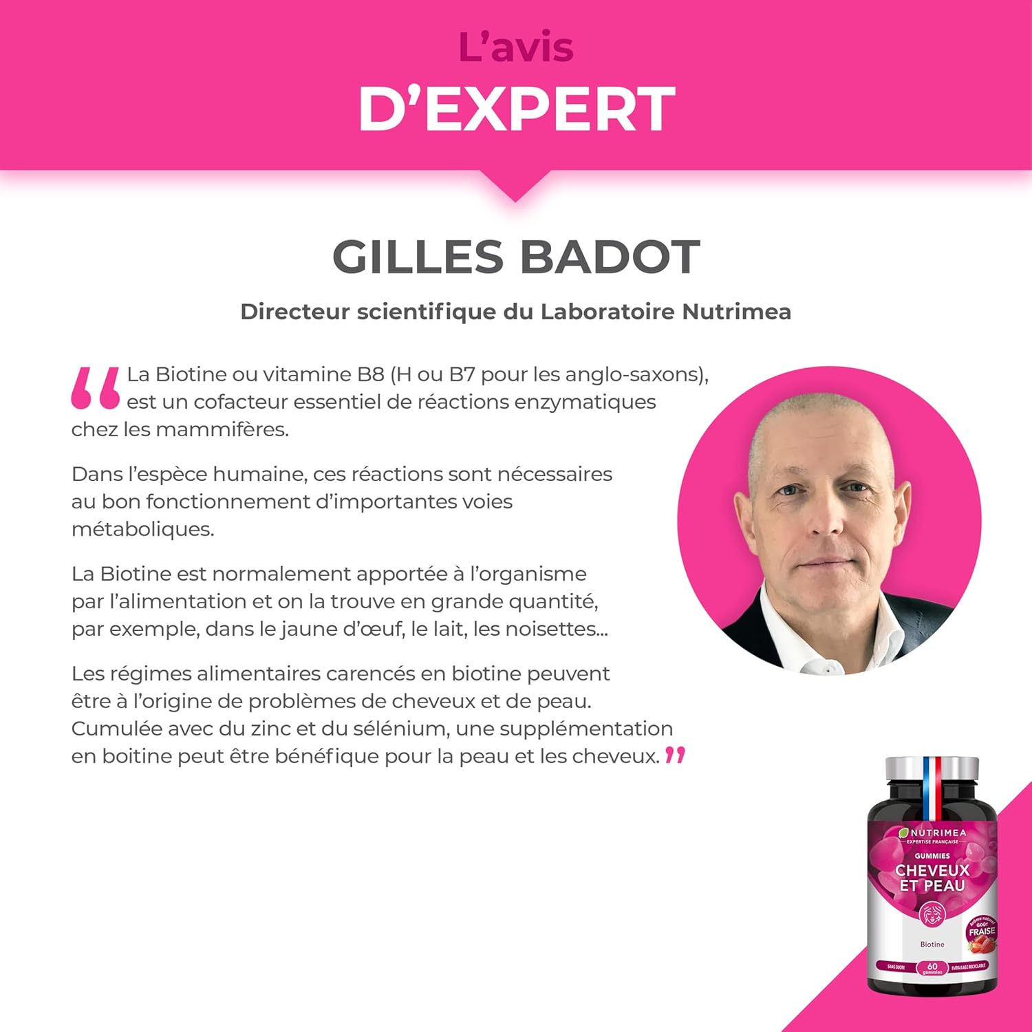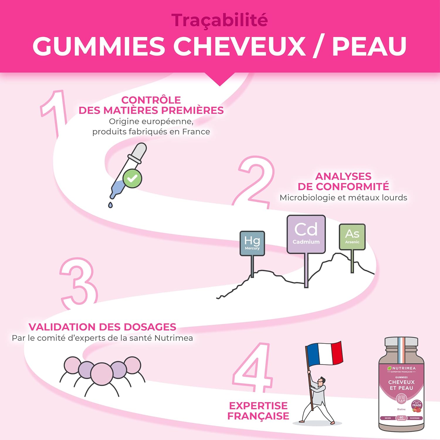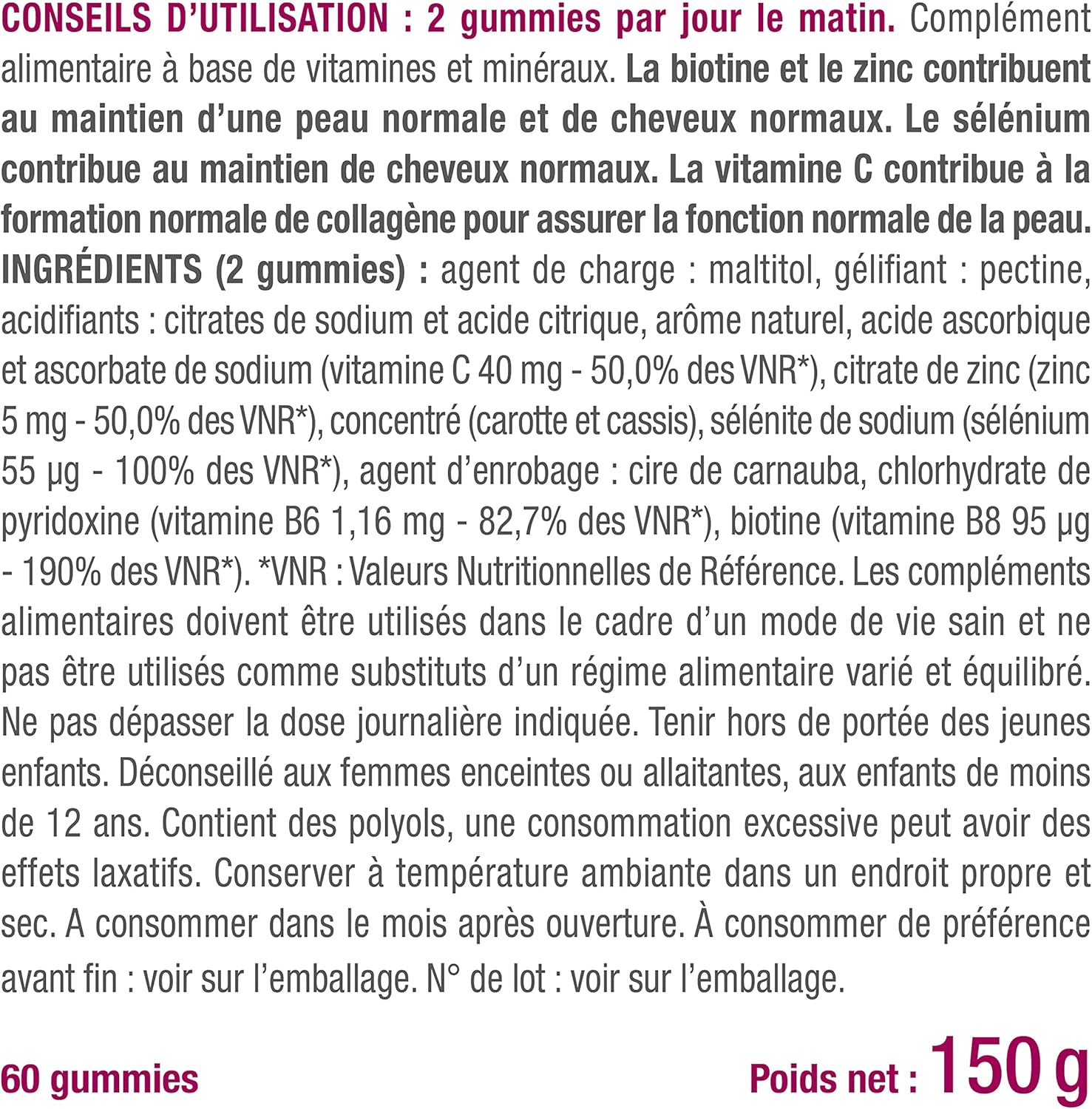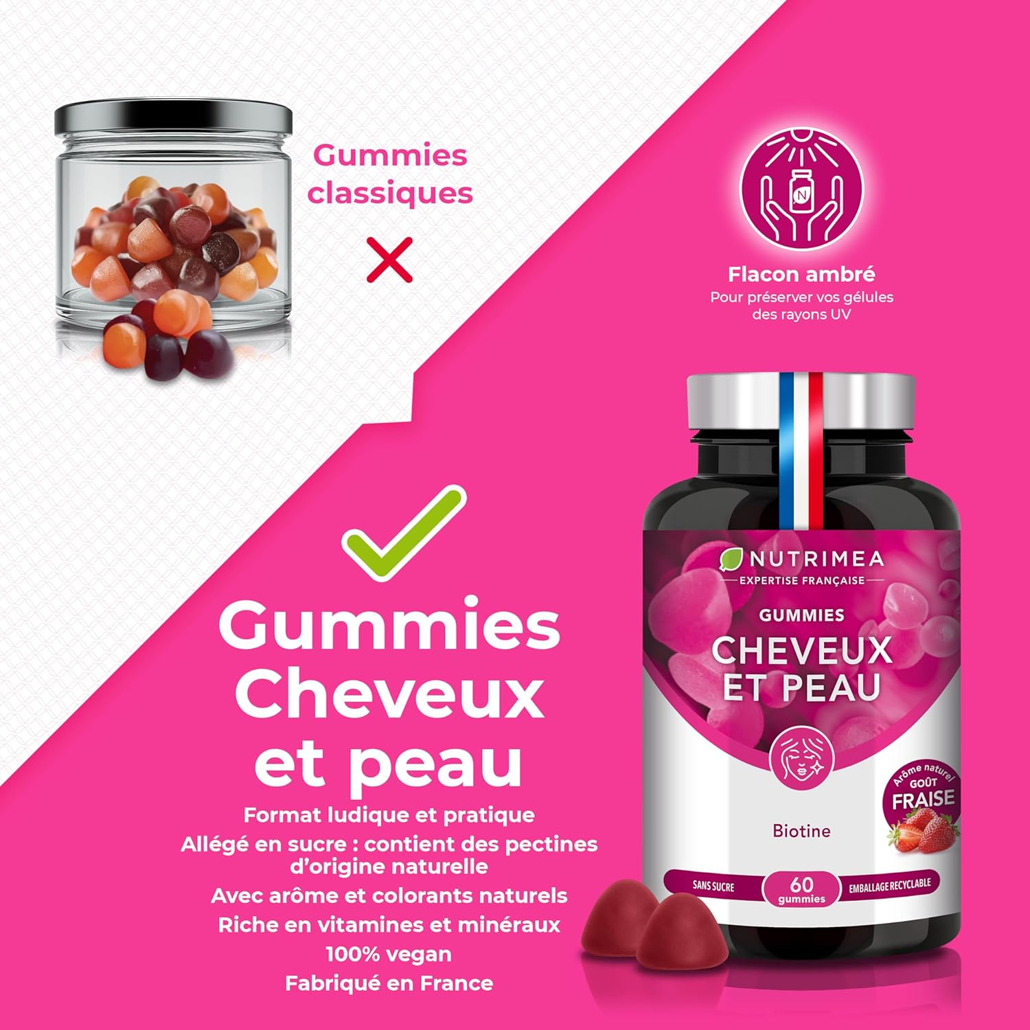 Hair Growth Gummies – Hair and Nail Growth – Skin Quality – With Biotin and Zinc and Selenium – 60 Vegan Gummies – Strawberry Flavour – Nutrimea – Made in France