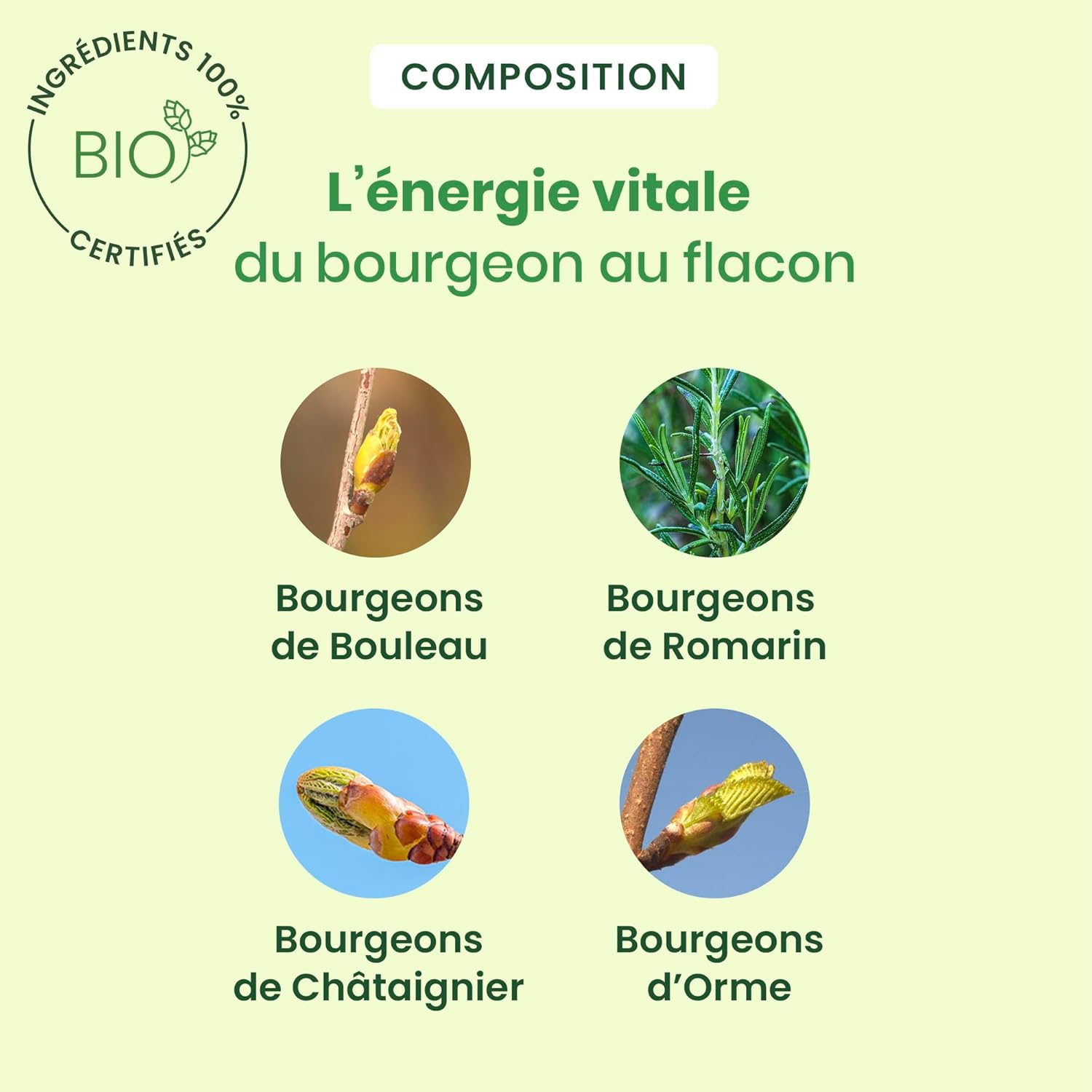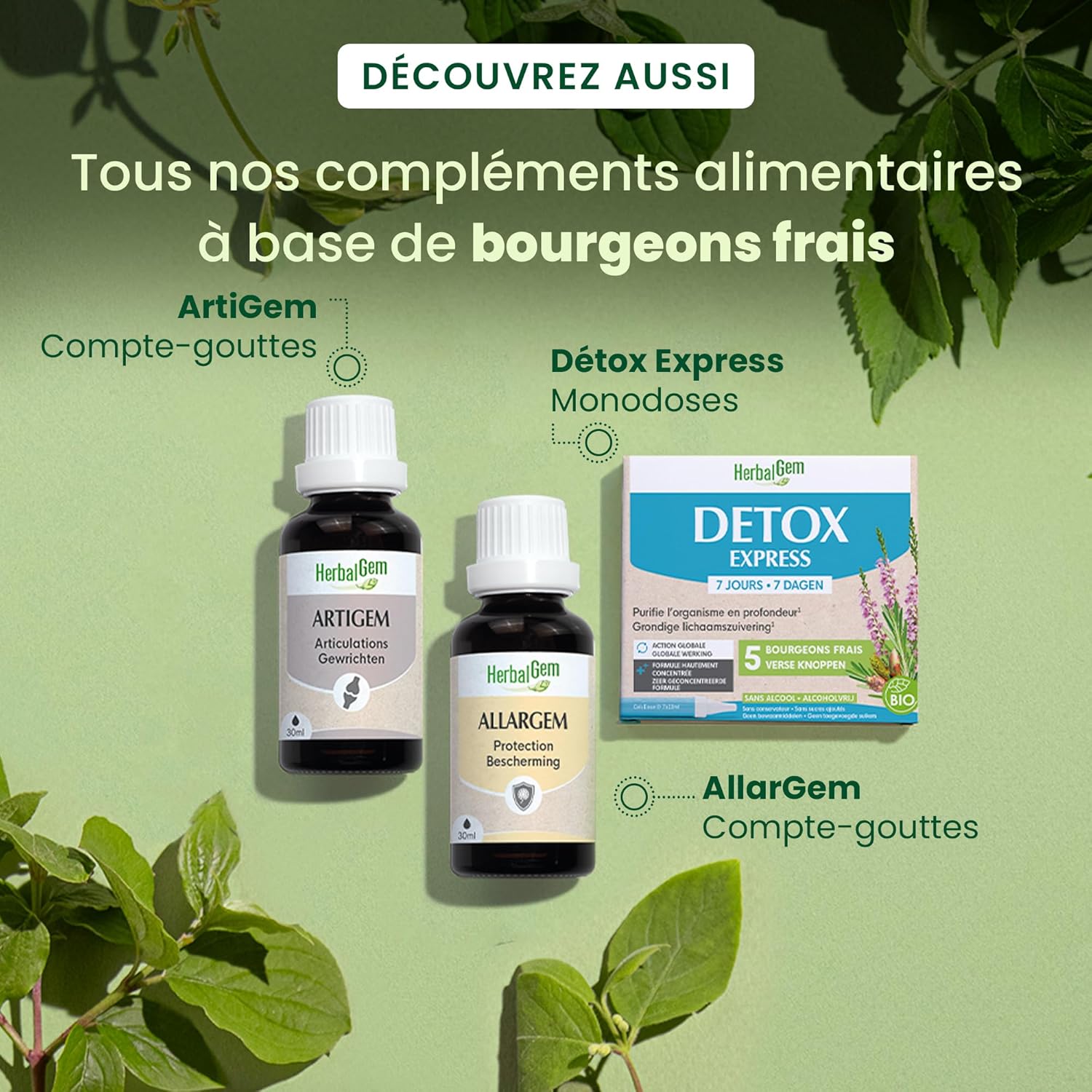 For over 30 years, HerbalGem has been the reference brand for natural solutions based on 100% organic fresh bud macerates. Hand-picked from the brand’s organic cultures, the buds are rich in powers whose use of these buds has given rise to a discipline called gemmotherapy. HerbalGem mothers macerates are suitable for the whole family, from the smallest to the old, and help to maintain good health on a daily basis. This Duo Detox Express is a food supplement formulated to purify your body with ease! This natural detox treatment helps to remove toxins from the body while decongorating and reviving the metabolism to counterbalance periods of overeating, accompanying fasting or purifying the body after intense physical exertion. Thanks to the combined action of birch, rosemary, elm, chestnut and heather, the Duo Detox Express is a complete food supplement to regain vitality and inner well-being in 7 days!