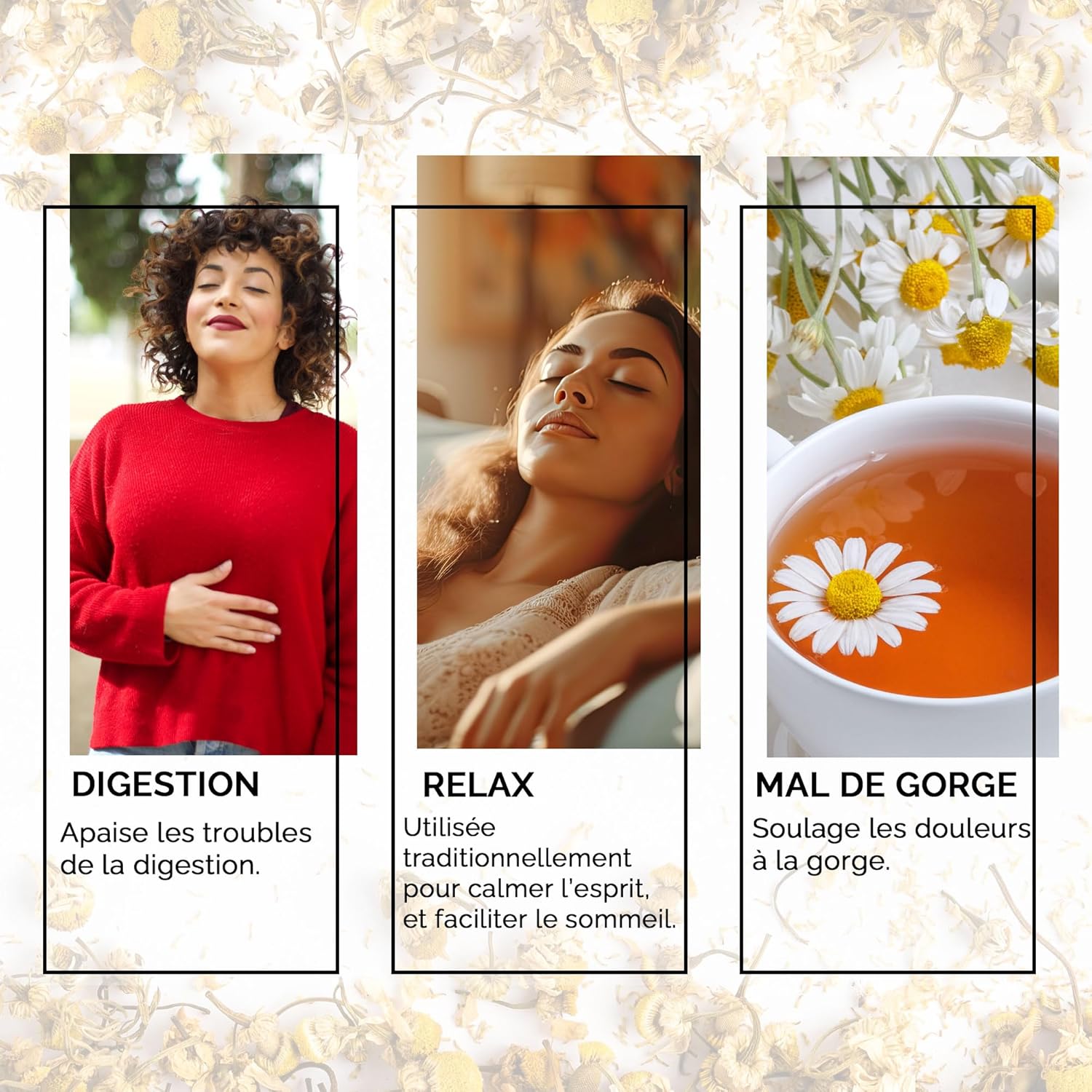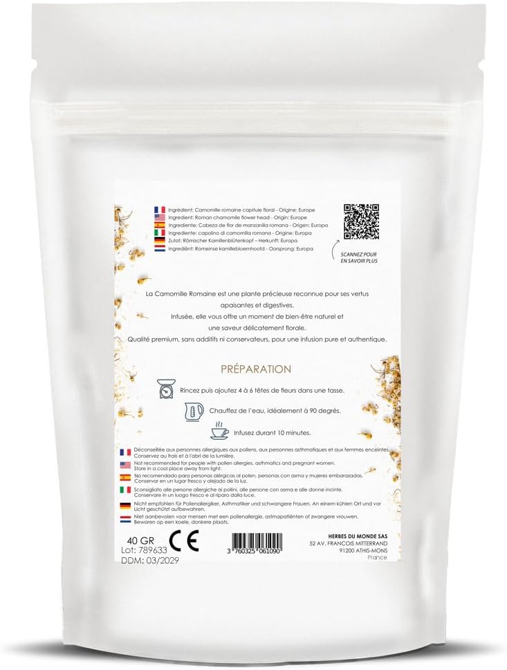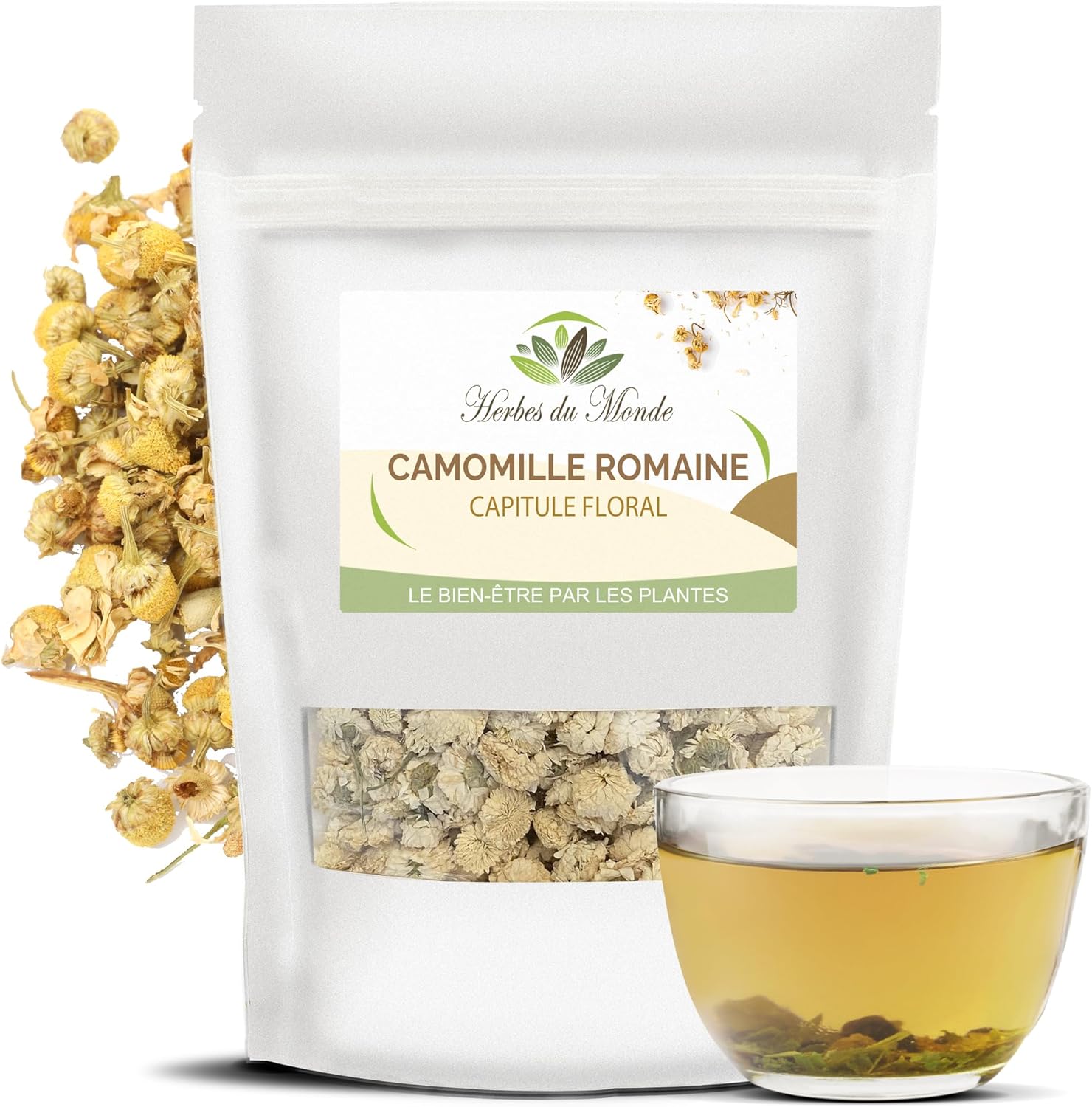 Roman Chamomile – Herbes du Monde Relax with our Roman Chamomile, perfect for soothing the mind and promoting restful sleep. Main Features: Selected Quality: Our Roman chamomile flowers are carefully chosen for their quality and potency, providing exceptional aroma and flavor. Naturally Soothing: Known for its calming properties, chamomile is ideal for a relaxing herbal tea at the end of the day. Versatility: Perfect for infusions, it can also be used in cosmetic applications such as soothing eye compresses or relaxing baths. Benefits: Natural Stress Relief: Helps reduce tension and anxiety, promoting deep relaxation of body and mind. Promotes Better Sleep: Its naturally relaxing effects can improve sleep quality, making it a great option for your bedtime ritual. Skin Benefits: Its anti-inflammatory properties help calm irritated skin and maintain a healthy, soothing appearance. Why Choose Our Roman Chamomile? Our Roman Chamomile is the perfect choice for those looking for a natural solution to improve relaxation and sleep quality. It is also versatile, can be used to enrich your skincare routine or as a relaxing herbal tea at any time. Enjoy the relaxing benefits of our Roman Chamomile. Order now and experience peace and well-being every day!