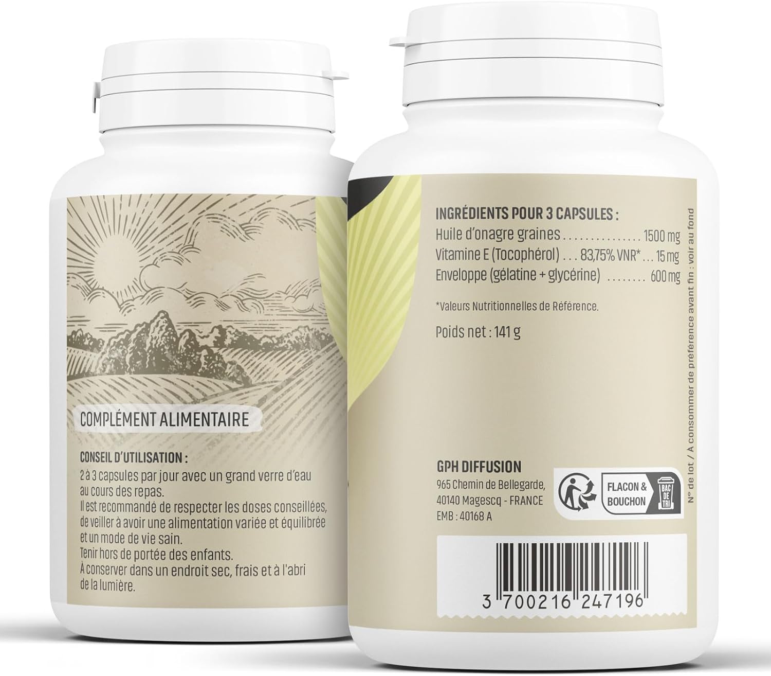 Deux boîtes de produits cylindriques jaunes présentées sous la marque « Herbes & Plantes » avec le texte « Onagie », sur fond naturel brumeuxDeux boîtes de produits cylindriques jaunes présentées sous la marque « Herbes & Plantes » avec le texte « Onagie », sur fond naturel brumeux