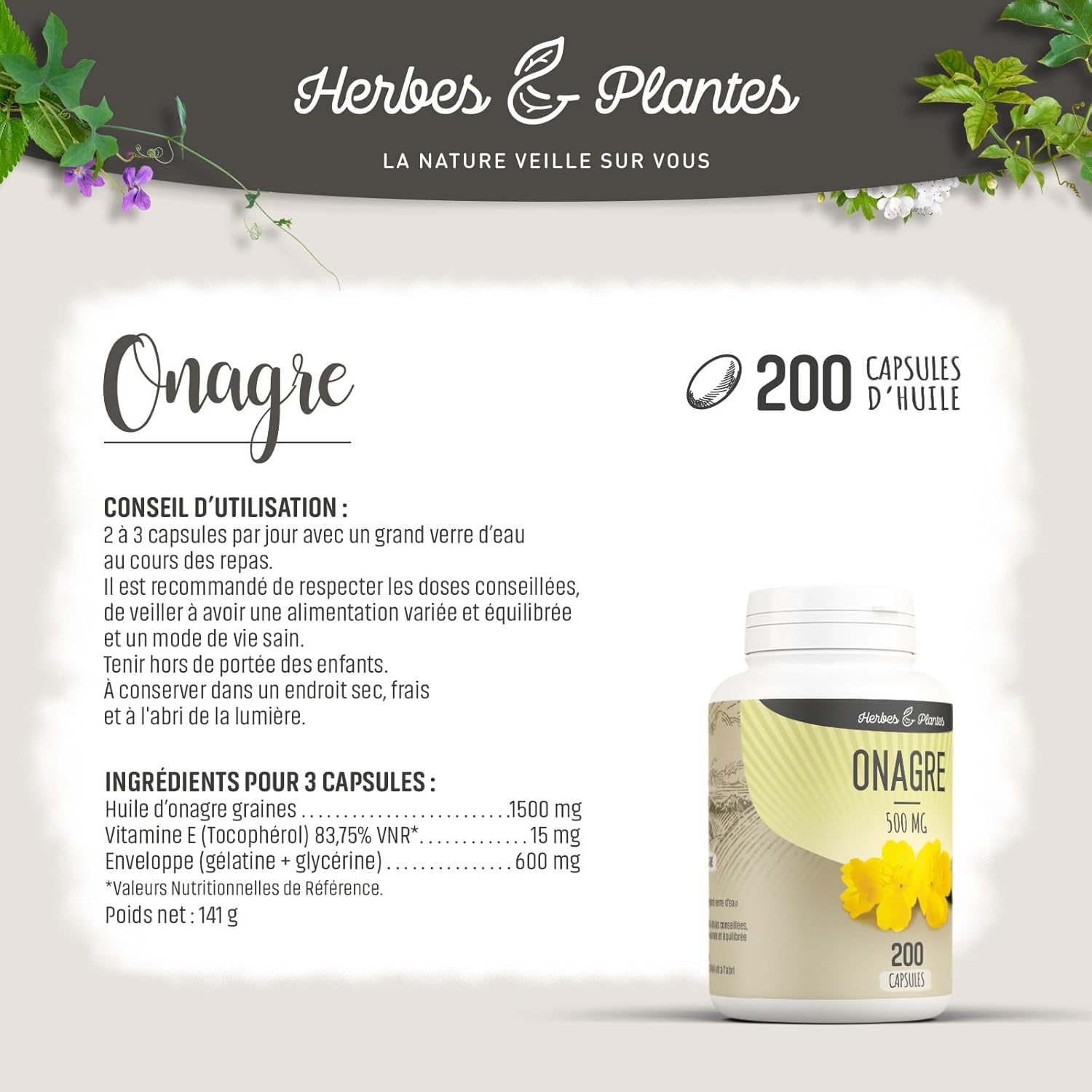 Herbes Et Plantes Evening Primrose 200 Capsules 500 mg
