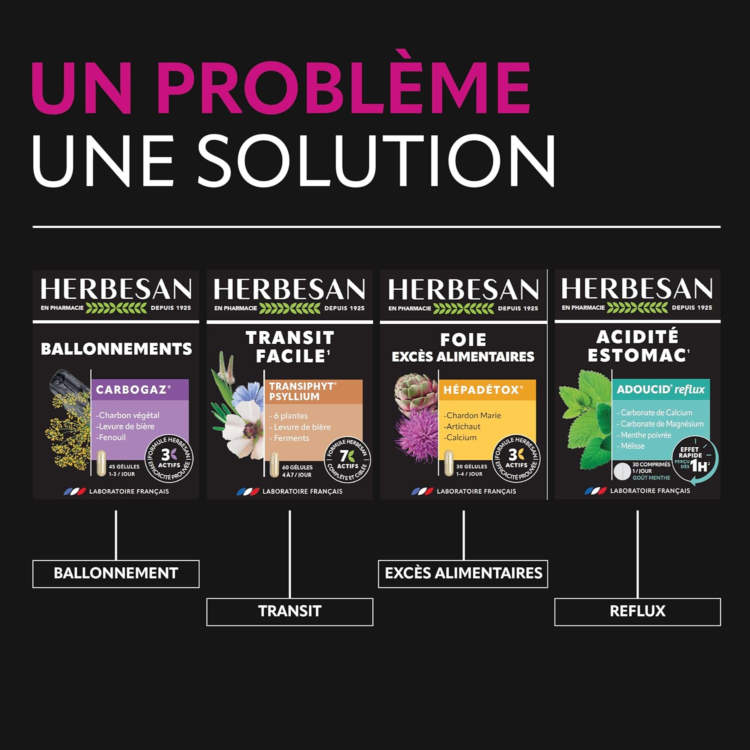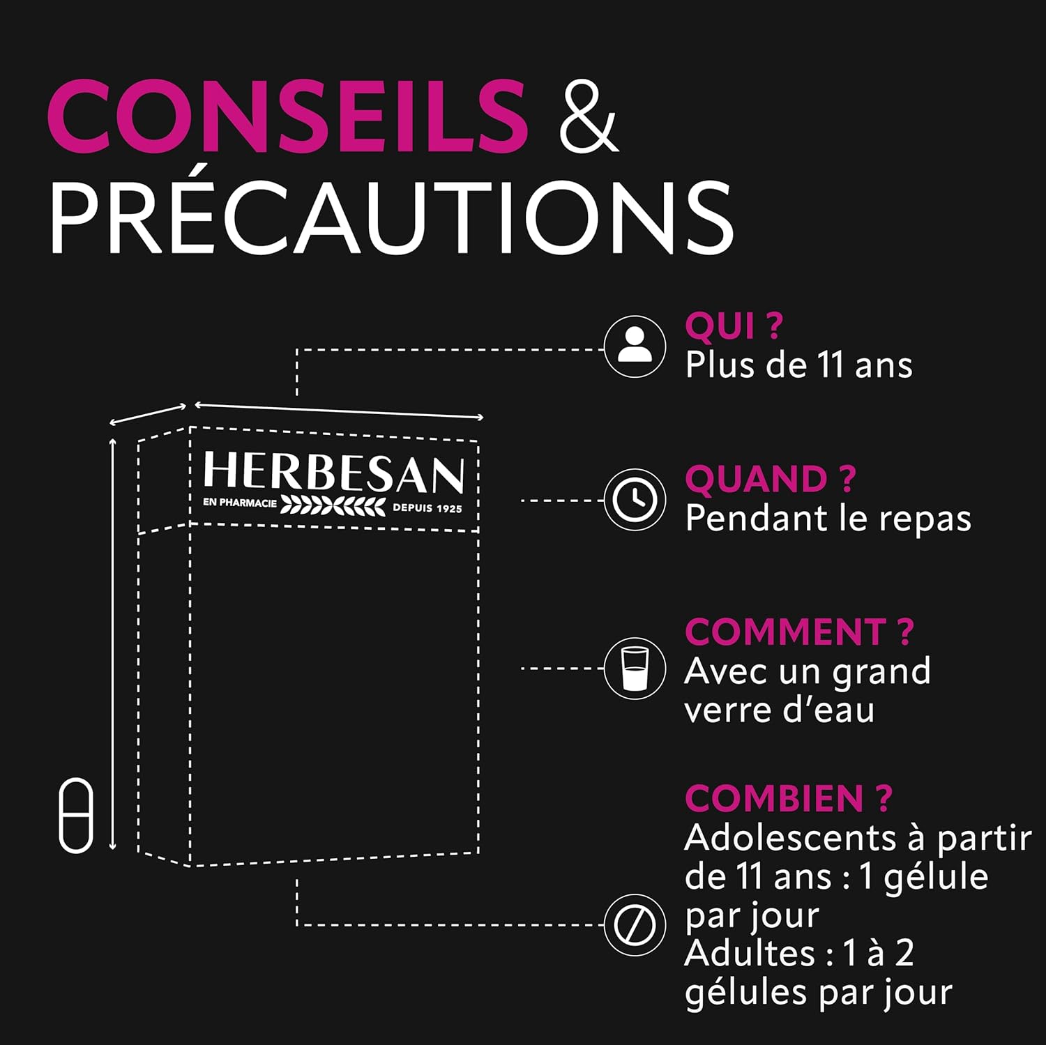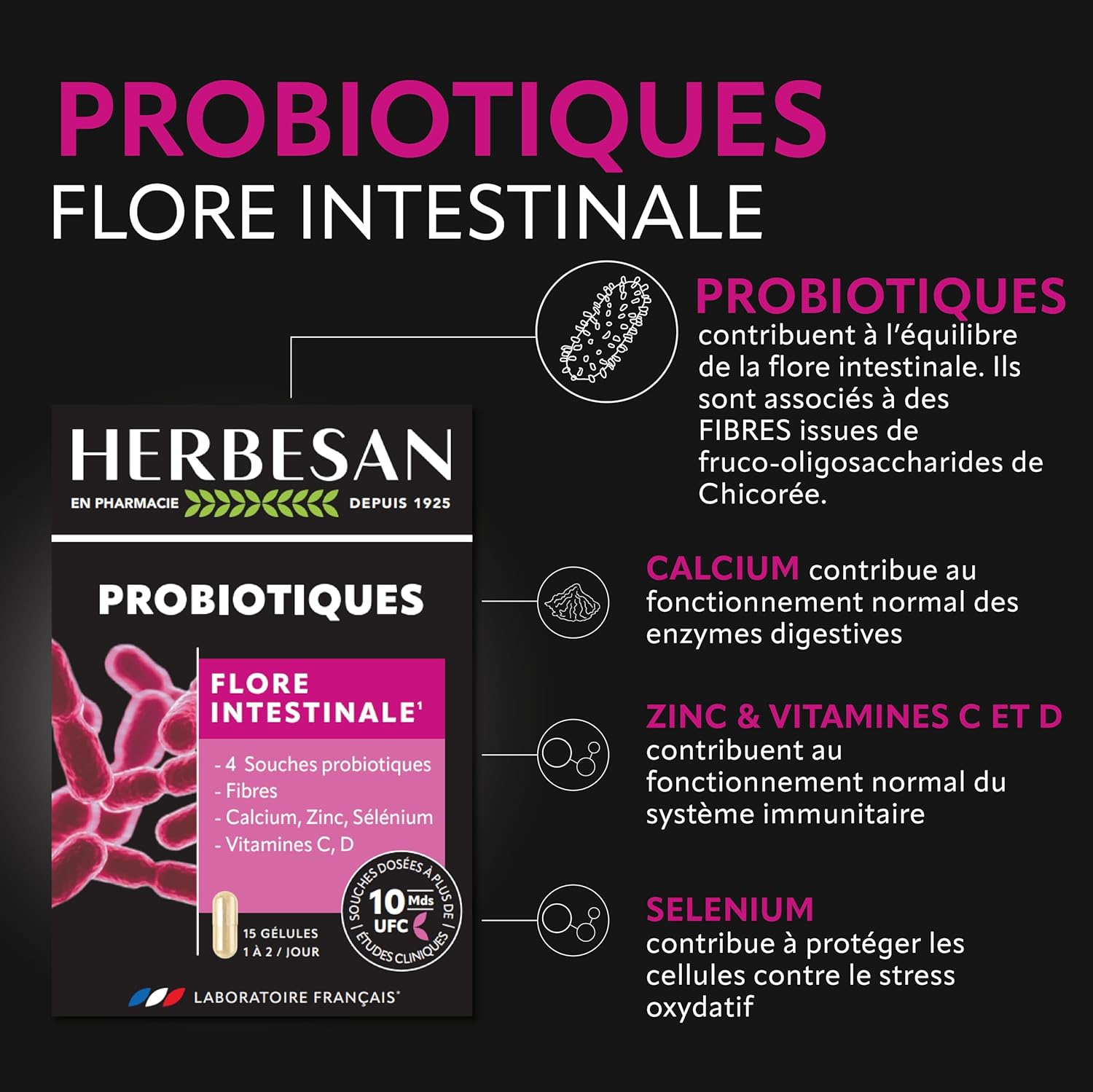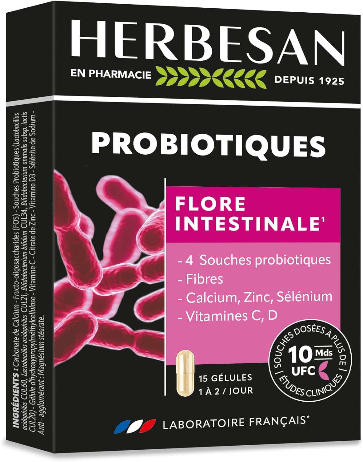 A balanced microbiota is essential for fluid digestion and overall well-being. HERBESAN PROBIOTIQUES combines 4 micro-encapsulated probiotic strains, highly dosed at 10 billion CFU, to help restore the balance of intestinal flora and promote digestive comfort. 1. Microbiota equilibrium: – 4 clinically documented strains: Lactobacillus acidophilus CUL60, Lactobacillus acidophilus CUL21, Bifidobacterium bifidum CUL20, Bifidobacterium animalis subsp. lactis CUL34. – Prebiotic fibres (FOS): Nourish probiotics for enhanced action. 2. Good digestion and good absorption of food so as not to maintain imbalance and inflammation of the flora: – Calcium: Contributes to the normal functioning of digestive enzymes. – Vitamin D3: Facilitates the assimilation of Calcium. 3. Immunity, Protection and Defense of the body to protect the intestinal mucosa from external aggressions: – Selenium: Improves intestinal microbial populations and fights against free radicals. – Zinc, Vitamins C & D: Support the immune system and protect cells from oxidative stress. Directions for use: Teenagers from 11 years: 1 capsule per day – Adults: 1 to 2 capsules per day, to be taken during the meal with a large glass of water.