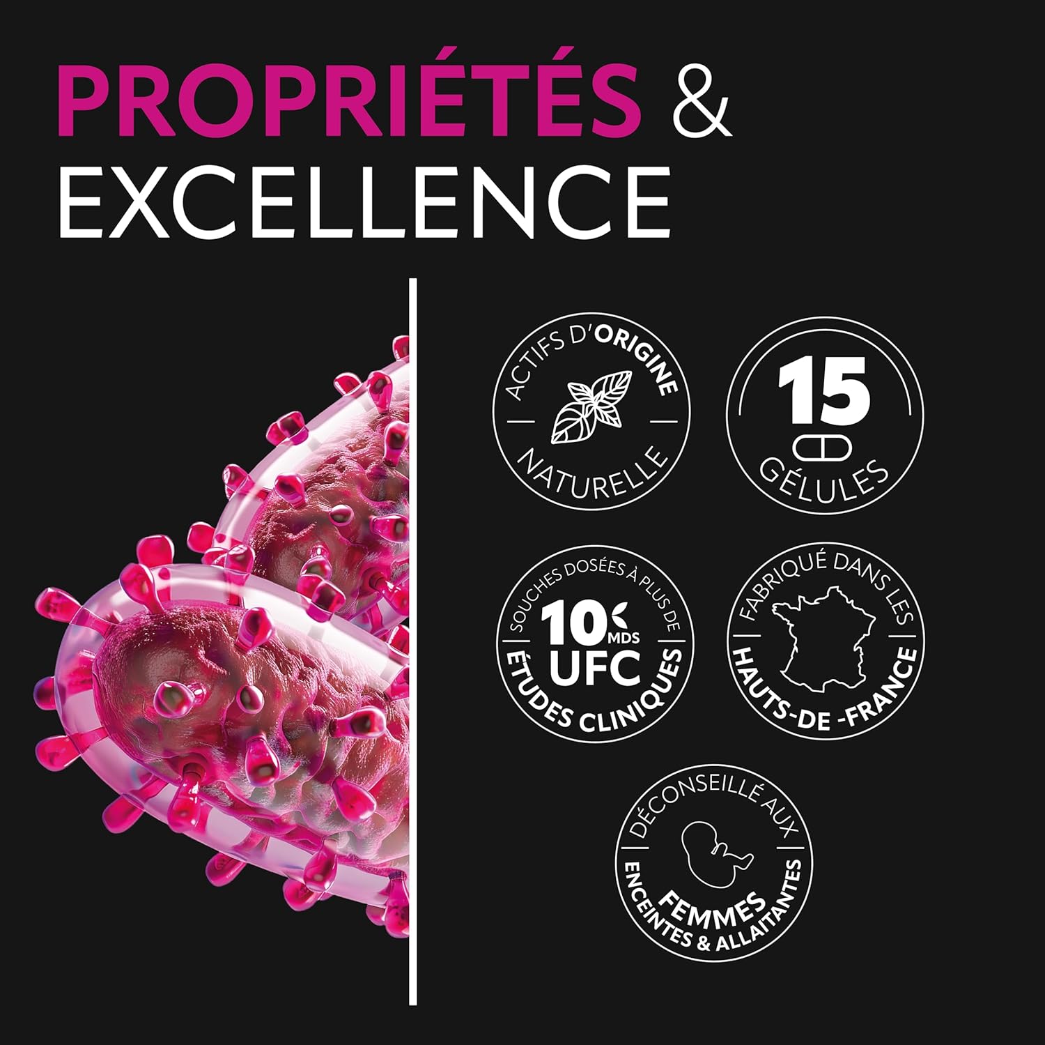 4 HIGHLY DOSED PROBIOTIC STRAINS ✦ Dosage to over 10 billion CFU per capsule. Various strains, validated by clinical studies and micro-encapsulated to protect them from gastric acidity and reach the intestine.