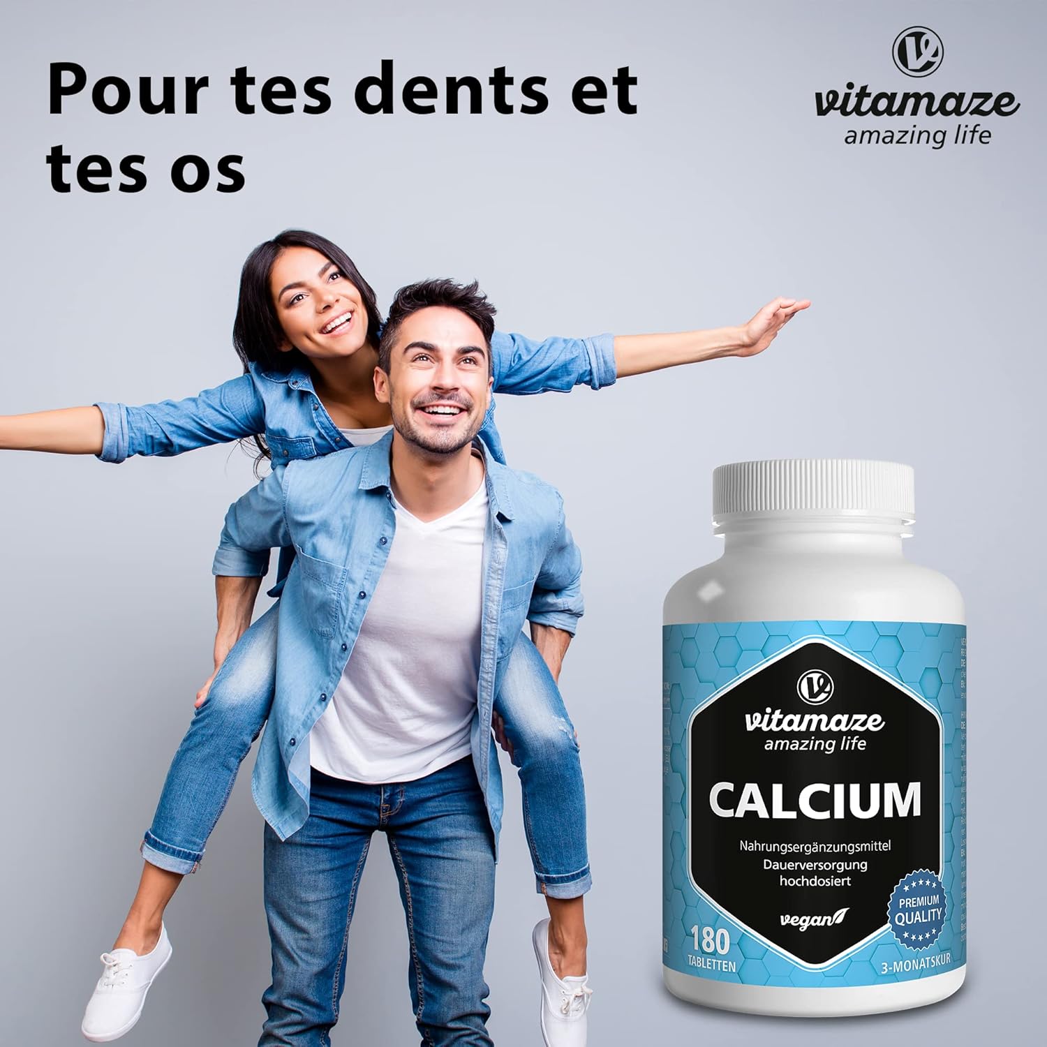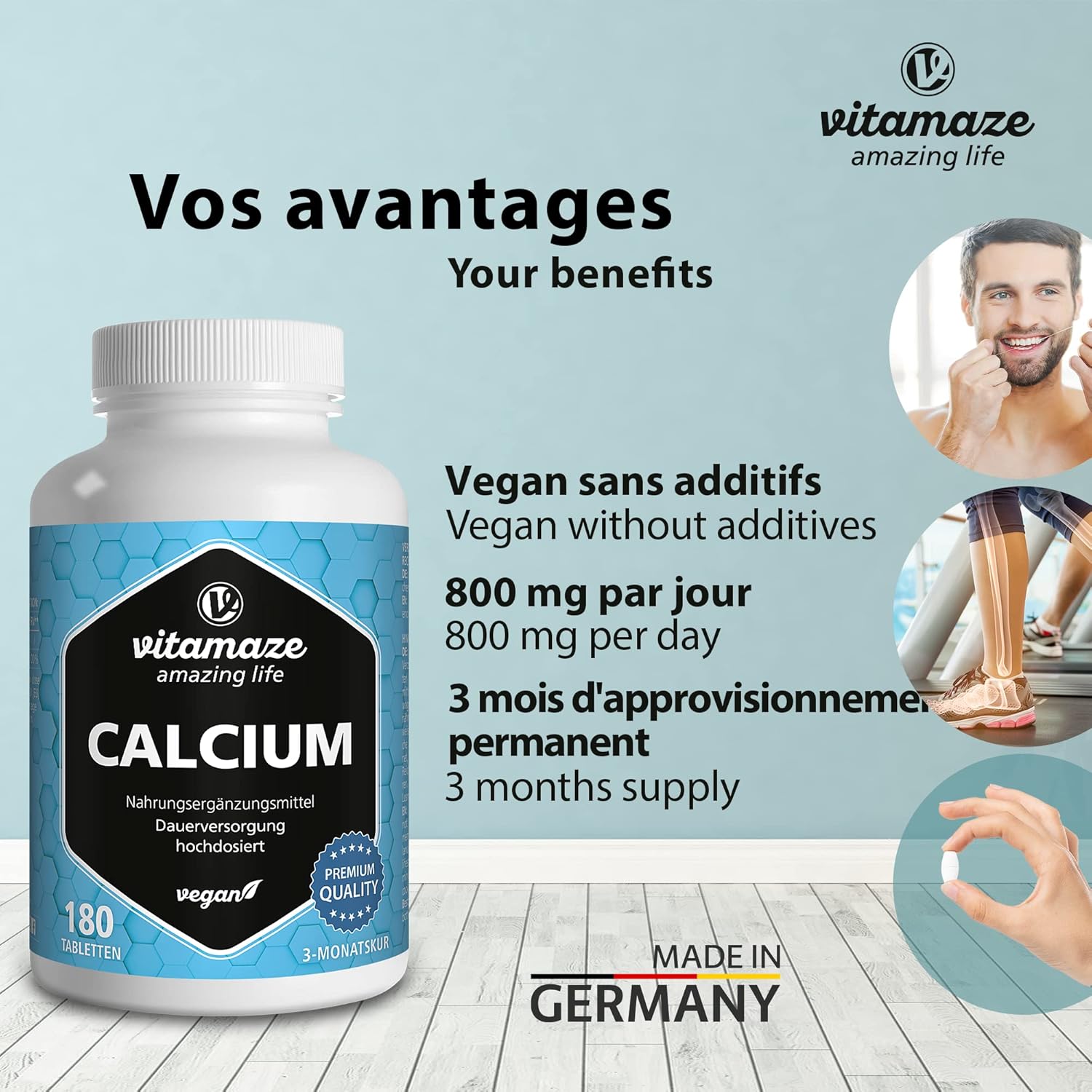 HIGH DOSE: 400 mg of mineral per vegan tablet. With a daily dose (2 tablets), you take 100% of the recommended daily requirement of 800 mg of calcium. Calcium is necessary to maintain normal bones and teeth.