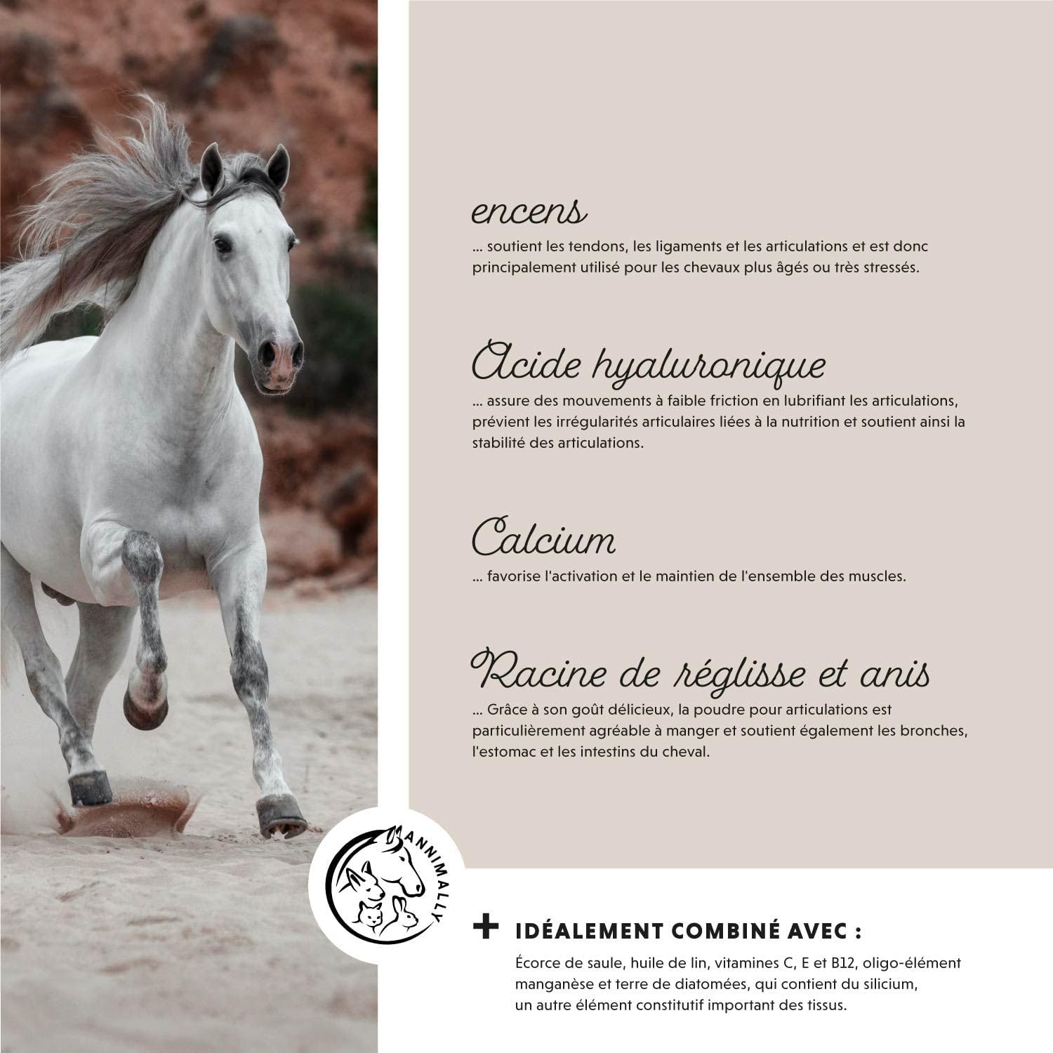 Ingrédients : germes de malt ; levure (saccharomyces cerevisae inactif) ; méthylsulfonylméthane (MSM) 12,0 % ; chlorhydrate de glucosamine 5,0 % ; carbonate de calcium ; hydrolysat de collagène 5,0 % ; oxyde de magnésium ; huile de lin ; racine de curcuma moulue 2,5 % ; Chondroïtine. -Sulfate ; écorce de saule moulue ; fleurs de camomille moulues 1,0 % ; acide hyaluronique Remarque : Ce complément alimentaire ne peut être donné que jusqu’à 10 % de la dose quotidienne en raison de la teneur élevée en oligo-éléments par rapport aux aliments complets. Composants analytiques : Protéines brutes 22,3 %, fibres brutes 4,4 %, graisses brutes 3,2 %, cendres brutes 16,1 %, cendres insolubles à l’acide chlorhydrique 4,1 %, sodium 0,05 % Utilisation : Les chevaux reçoivent 15 g par jour pour un poids corporel de 600 kg. En cas de besoin accru, 30 g (= 2 cuillères à mesurer) peuvent également être donnés. Pour les poneys et les petits chevaux, ajustez le dosage en fonction du poids corporel. Additifs par kg : manganèse sous forme de glycine manganèse – Hydrate 1 470 mg – Vitamine E 10 000 mg – Vitamine B12 100 000 µg – Vitamine C 20 000 mg – Extrait d’encens (Boswellia serrata) 5 000 mg – Extrait de racine de réglisse 20 000 mg Huile d’anis 50 0 mg – Terre de diatomées purifiée 50 000 mg Contenu : Poids : 850 g Rangement : Veuillez stocker le produit au sec, à l’abri de la lumière et ne pas dépasser 25 °C. Fabrication : Fabriqué avec beaucoup d’amour en Allemagne.
