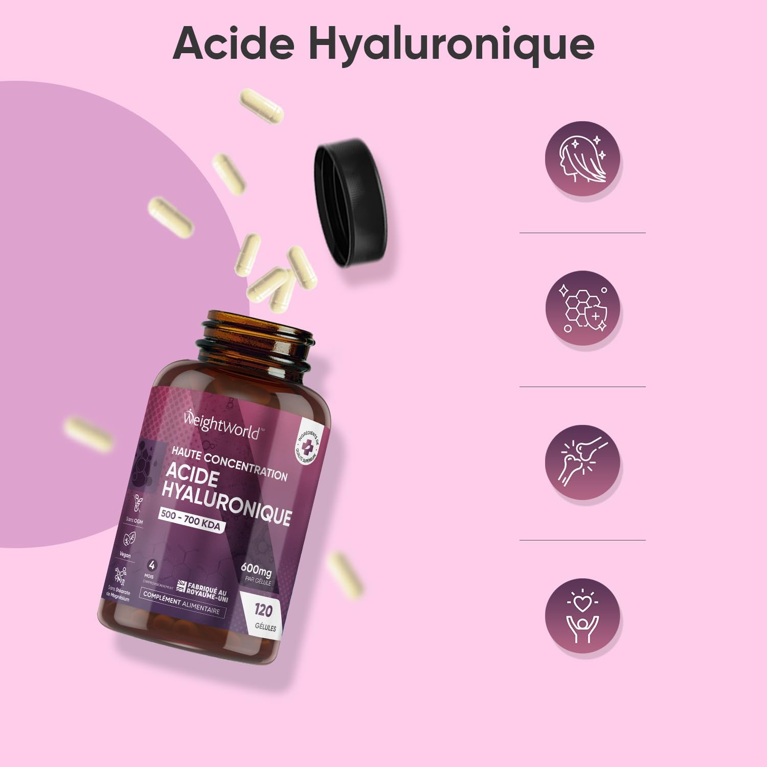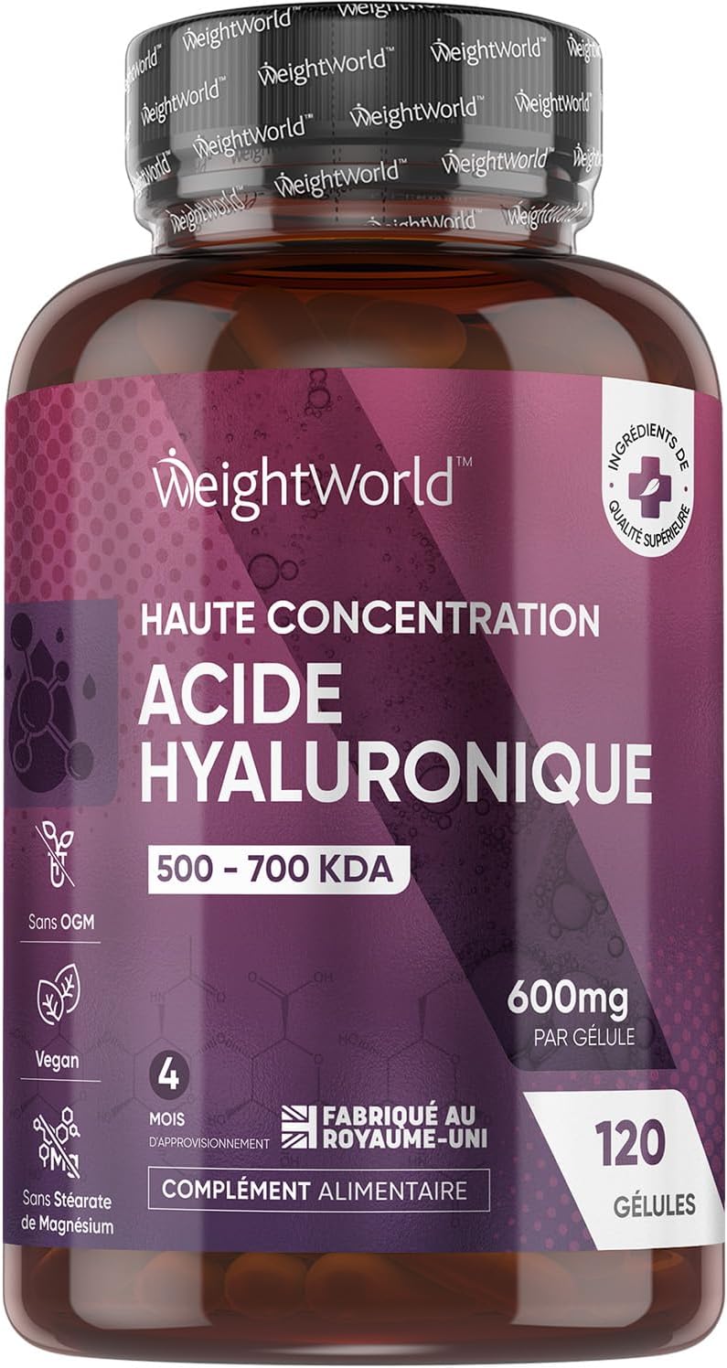 500-700kDa Hyaluronic Acid – KDa (kilodalton) refers to the molecular mass of hyaluronic acid (hyaluronic acid). These hyaluronic acid capsules are made from a low molecular weight kDa. Indeed, the molecular size of these hyaluronic acid capsules is 500 – 700 kDa compared to about 800 to 900 for the others on the market.