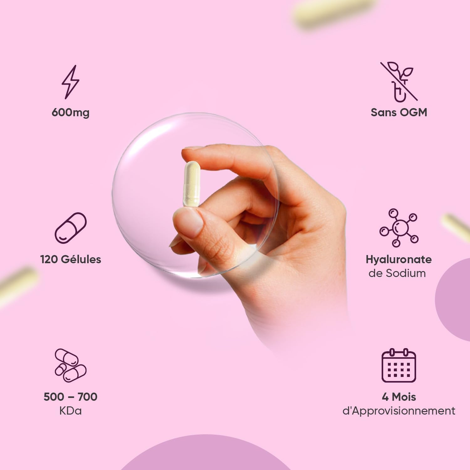 Hyaluronic Acid in capsules for 4 months – This supplement contains a concentrated formula of sodium hyaluronate with a molecular size of 500-700 kDa. With only 1 ingredient this formula is preferred thanks to its stable form of hyaluronic acid. Only one capsule per day, these 120 capsules give access to a supply of 4 full months!