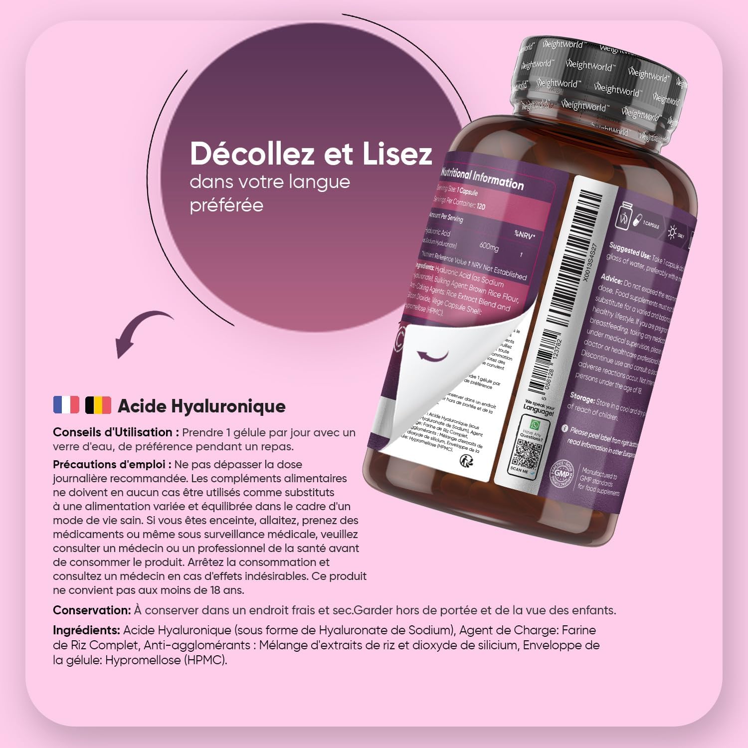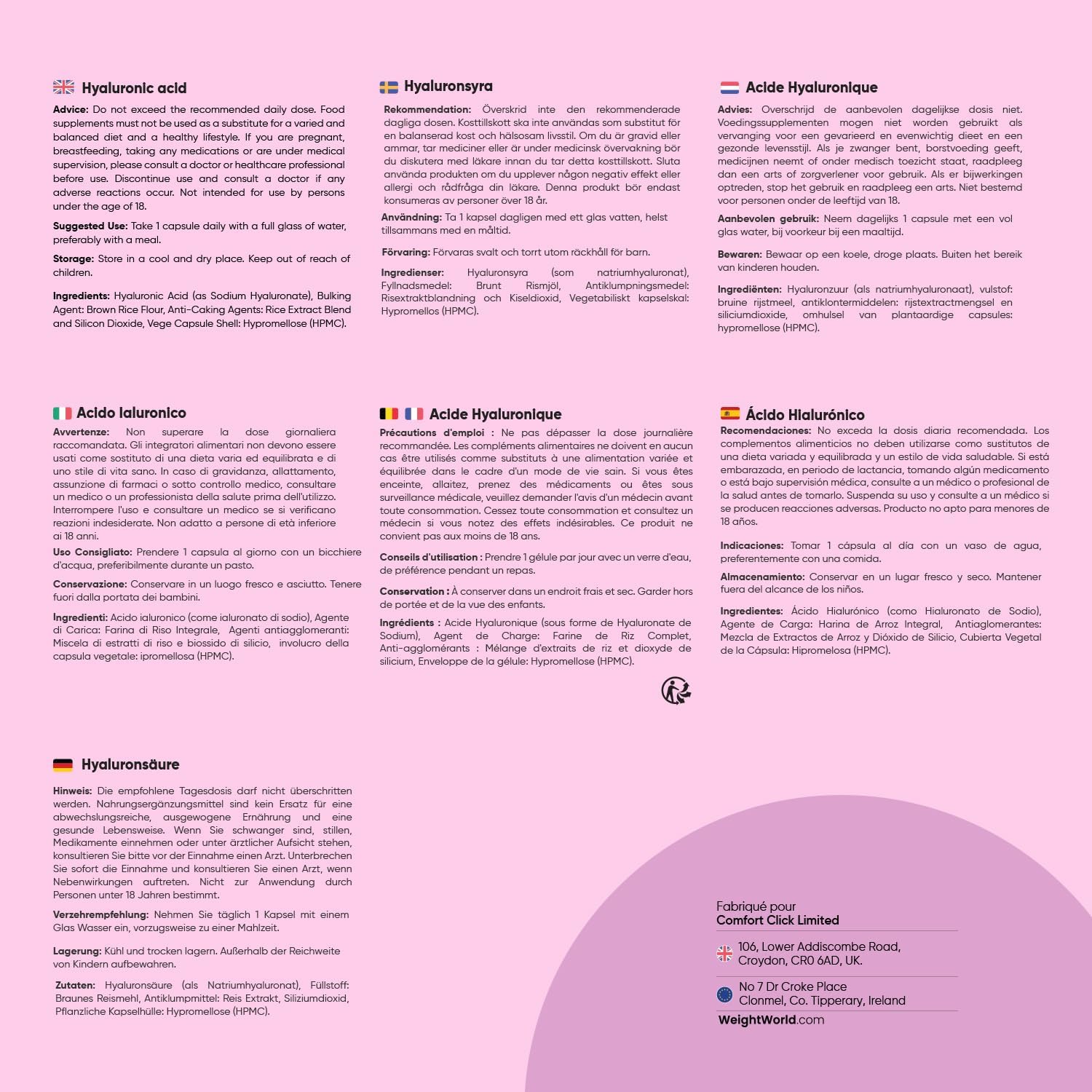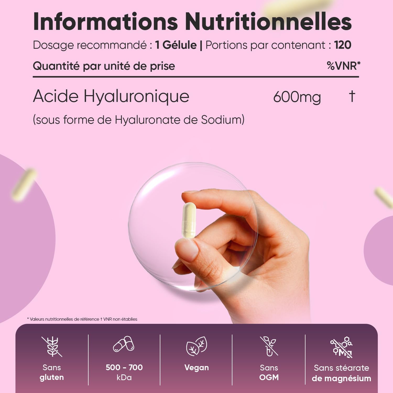 VEGAN, GLUTEN FREE, LACTOSE FREE – These vegan hyaluronic acid 600mg capsules are a convenient alternative made to GMP standards, from naturally derived ingredients without magnesium stearate. They are also suitable for people following a vegan or vegetarian diet and are gluten-free, lactose-free and non-GMO.