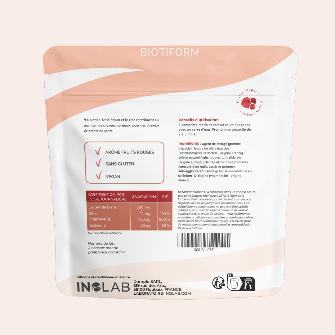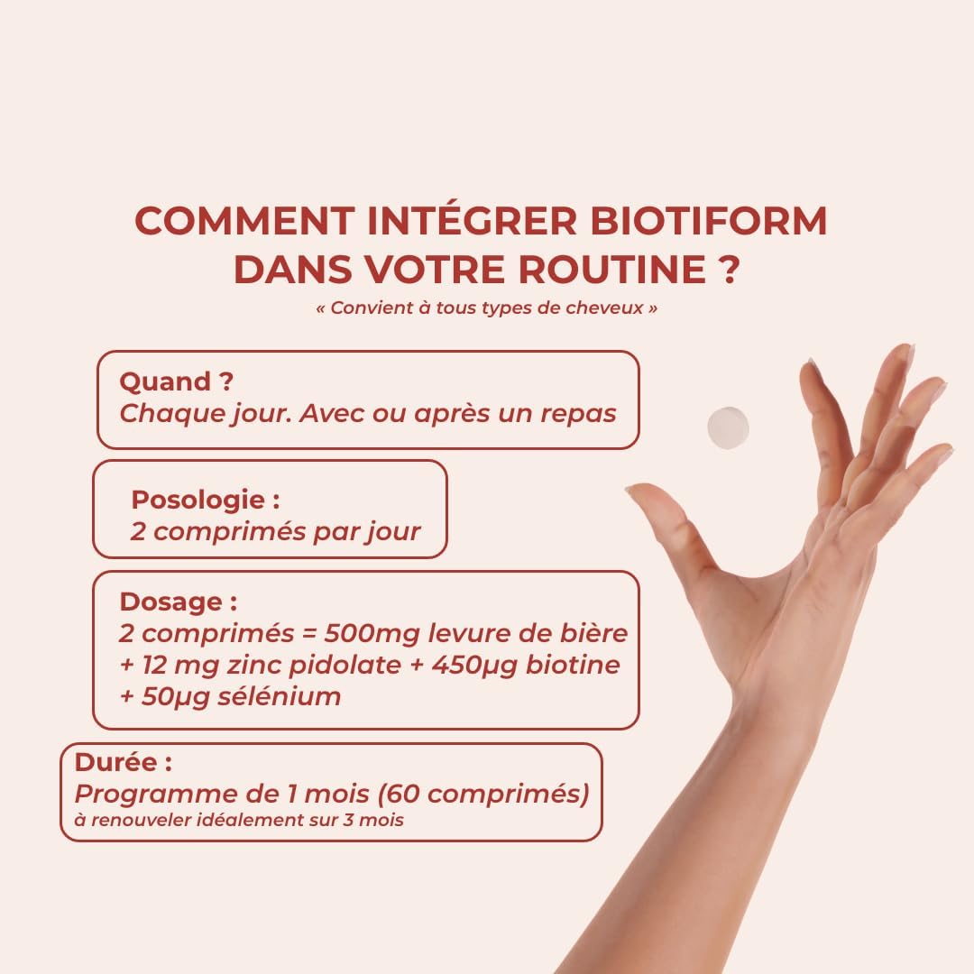 BEAUTY OF HAIR AND NAILS: Tired hair, weakened, slow growth and growth? the beauty of the hair goes through a balanced diet. BIOTIFORM will help you regain healthy hair and nails. Biotin, brewer’s yeast, zinc and selenium contribute to the normal maintenance of hair and nails. Zinc is involved in the normal synthesis of keratin. Keratin is a primary constituent of hair and nails.