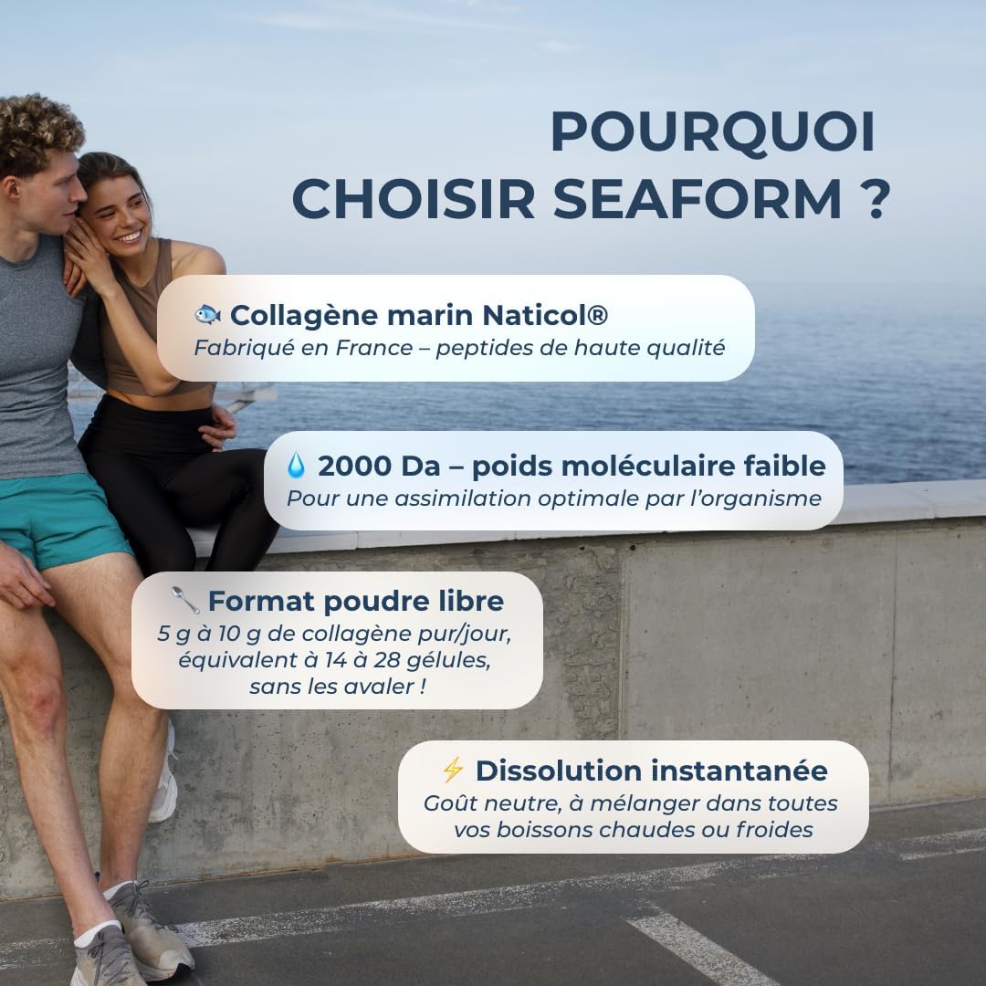 PEPTIDES 2000 Da: Seaform brings you low molecular weight collagen peptides (2000 daltons) for optimal absorption and enhanced efficiency. Reduced in peptides, marine collagen acts both on the skin and on the joints (types 1 2 3). Seaform is the assurance of highly bioavailable collagen for real results.