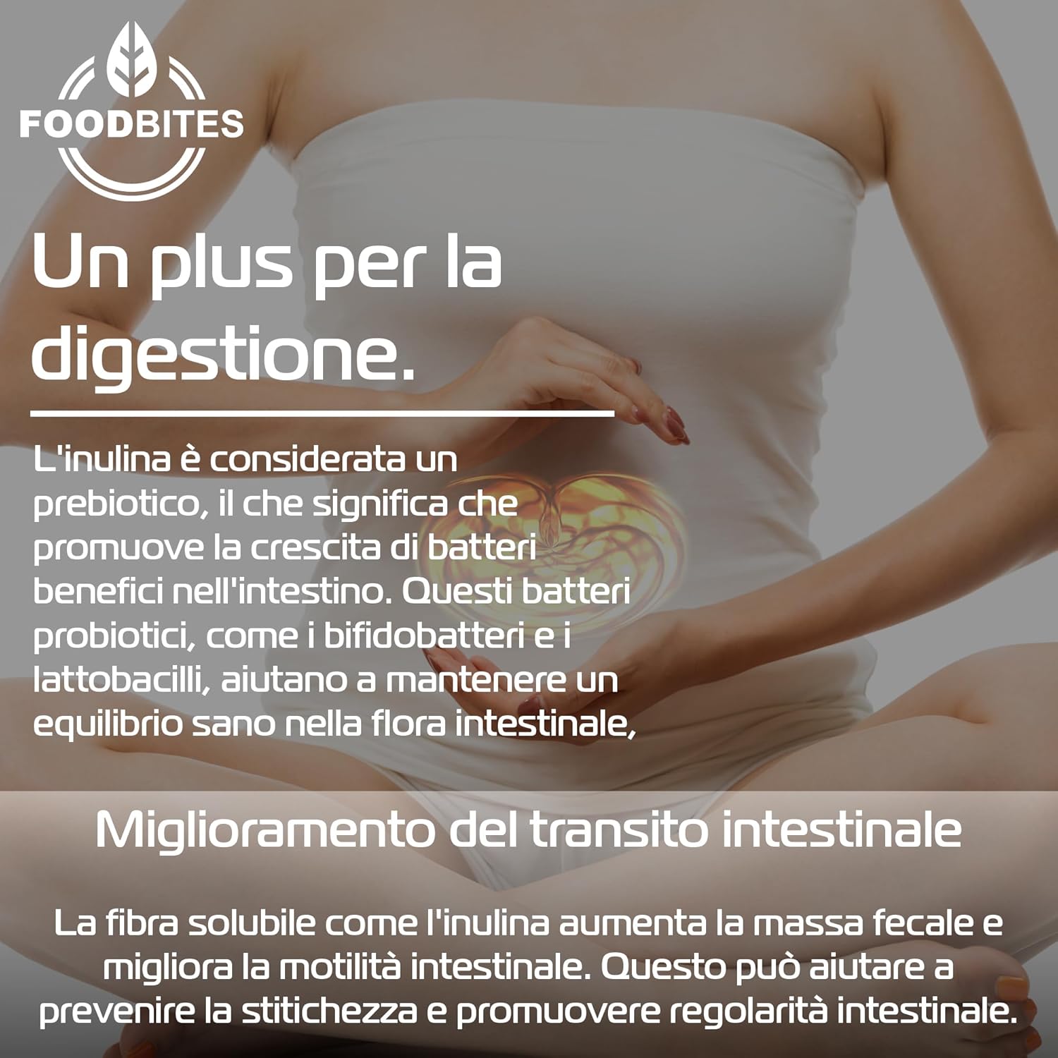 Discover Food Bites premium quality and exceptional purity Inulin: a finely refined product, naturally extracted from chicory roots through a filtration process. Our long-chain inulin is highly reputed on the market, acclaimed by top chefs and organic companies. We guarantee high quality standards with our ISO 9001, HACCP, GMP certifications. This naturally derived plant fibre offers a high content exceeding 90%, ideal for vegans and vegetarians. A water-soluble prebiotic with a slightly sweet taste, it stimulates the activity of intestinal bifidobacteria, thereby helping to strengthen the intestinal flora and reduce bloating. Quick and easy to use, Food Bites Chicory Inulin dissolves easily. Its pleasant taste, different from Jerusalem artichoke, blends perfectly with yogurt, ice cream, hot or cold drinks, for a sweet and healthy alternative. To fully enjoy its benefits, take two daily doses of 2.5/3 g of our inulin excellence, dissolved in your favorite drinks. Experience Food Bites Superior Inulin and take care of your well-being with this natural and organic product, supporting balanced digestion. Choose excellence for a balanced diet every day.