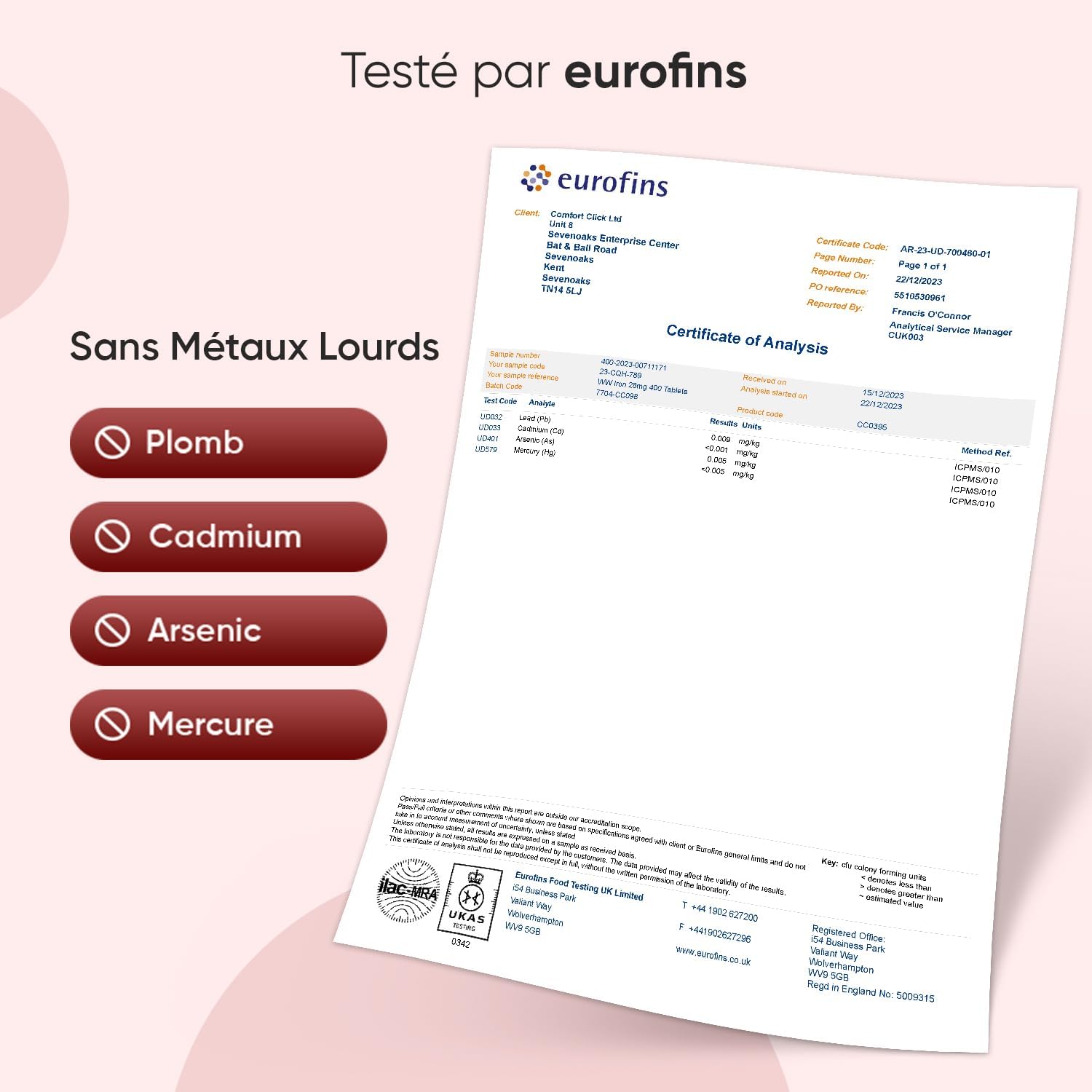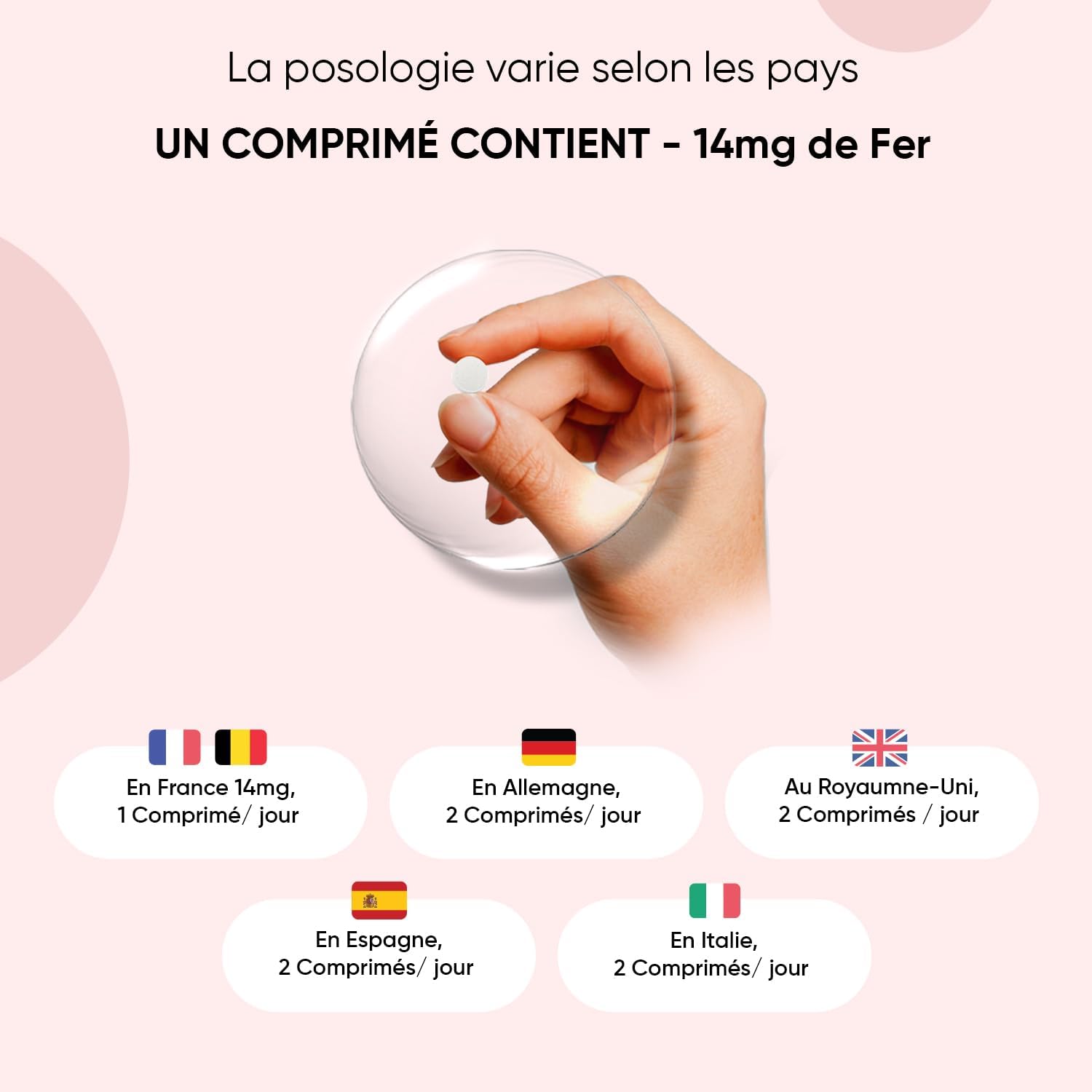 400 micro tablets of iron bisglycinate supplement – These 400 micro tablets have a dosage of 28 mg for 2 tablets, but since the recommended daily dose in France and Belgium is 14 mg, it is best to take only one tablet per day, which corresponds to 14 mg of iron bisglycinate per serving for more than one year of supply. onement.