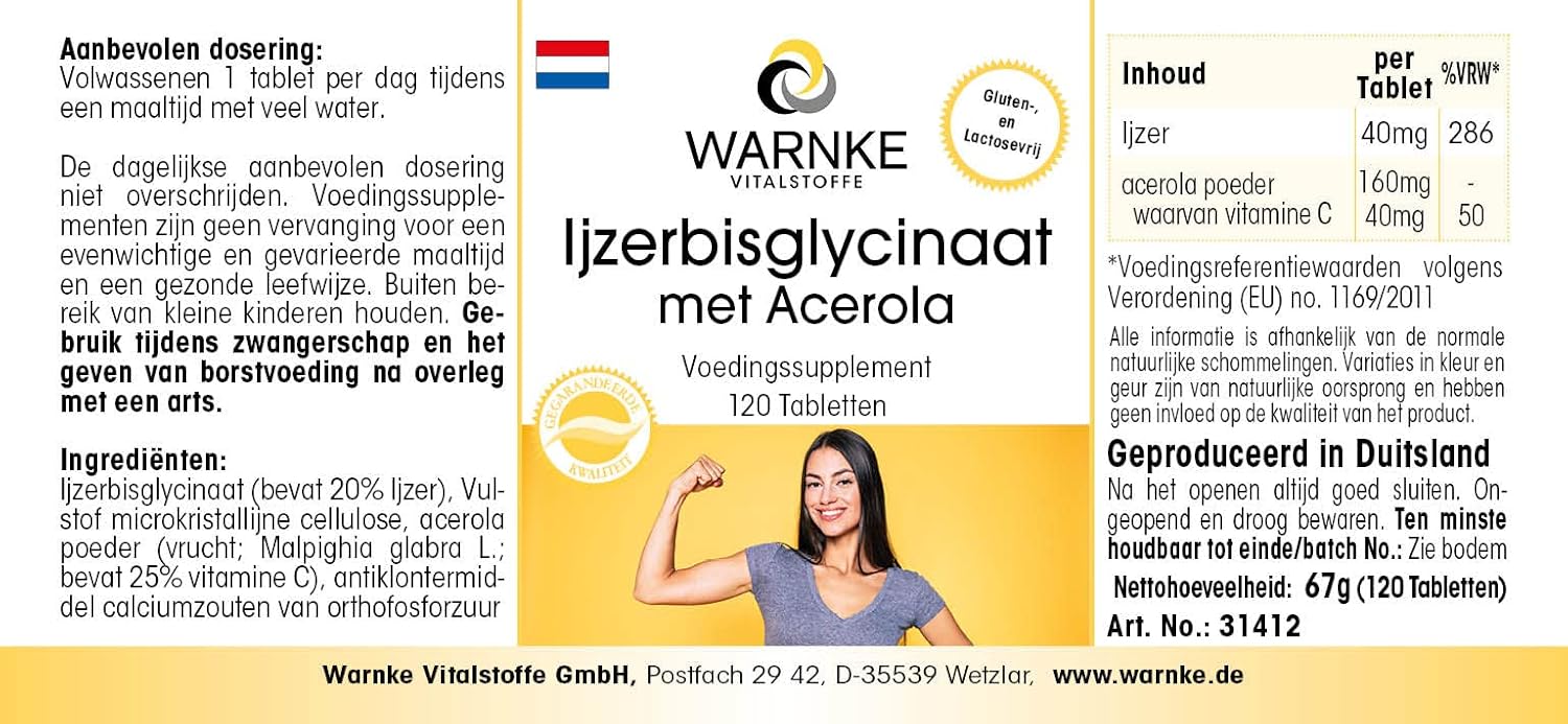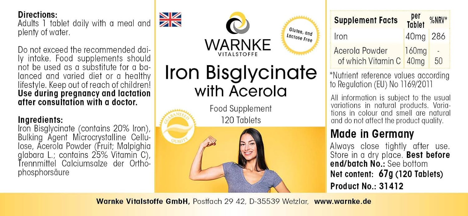 Iron tablets with natural vitamin C from acerola Gluten, lactose and yeast Free Dosage: Adults, 1 tablet per day with a large glass of water. Consult a doctor before using the product during pregnancy and lactation. One tablet contains: iron 40 mg / 286 % acerola powder 160 mg of which 40 mg / 50% vitamin C * NNR: nutritional reference values according to Regulation (EU) No. 1169/2011. Composition: Bisglycine iron sulphate (contains 20% iron), microcrystalline cellulose filler ine, acerola powder (fruit; Malpighia glabara L.; contains 25% vitamin C), anticaking calcium salts orthophosphoric acid Warnke Vitalstoffe Iron bisglycinate with acerola is a dietary supplement in tablet form, made exclusively from high-quality raw materials. Each tablet contains 40 mg of iron in the form of bisglycinate, as well as 160 mg of acerola standardized to 25% vitamin C. The combination of iron and vitamin C is interesting, because vitamin C promotes the absorption of iron. This means that vitamin C improves the body’s absorption of iron. 120 iron bisglycinate tablets with acerola. Produced without magnesium stearate. Highly dosed