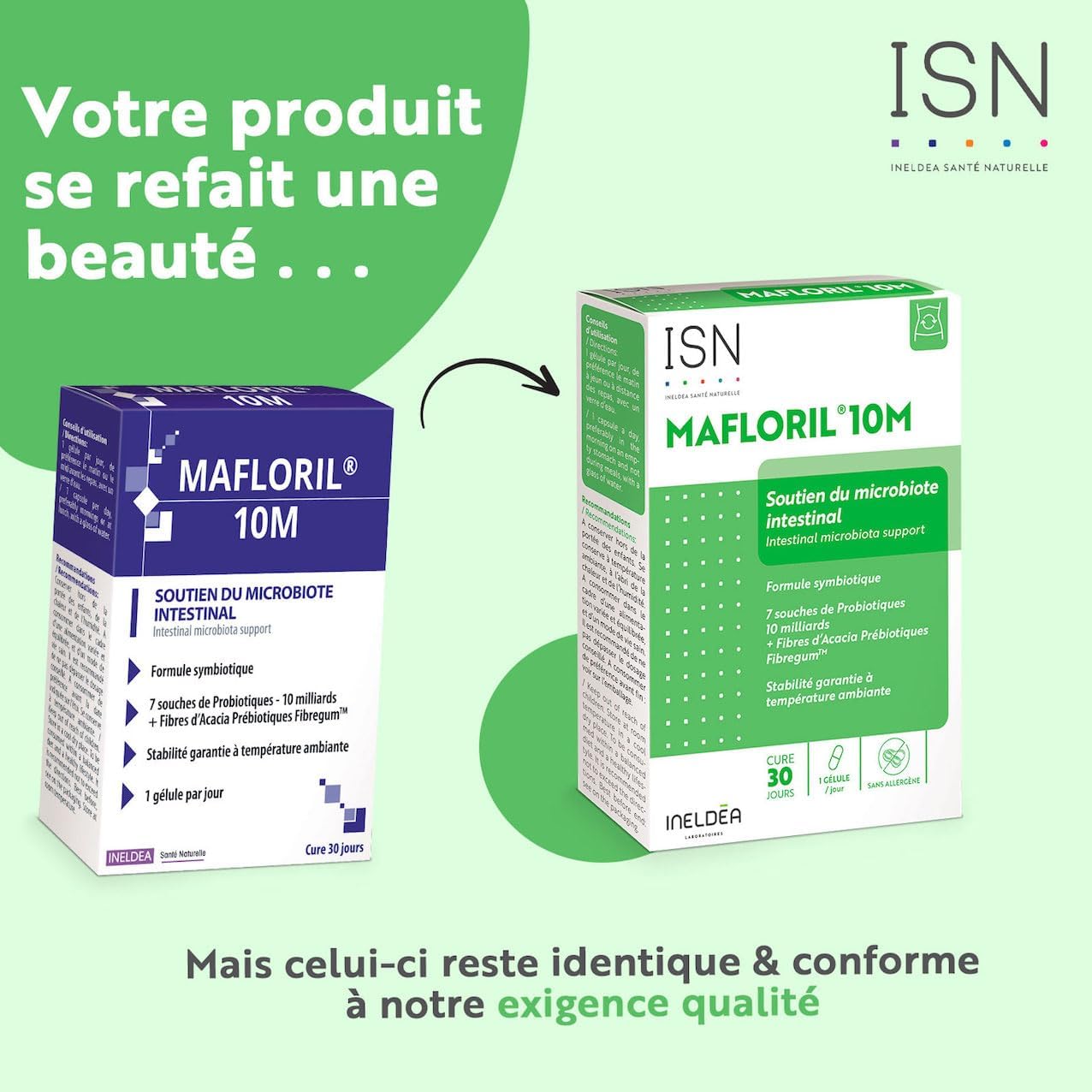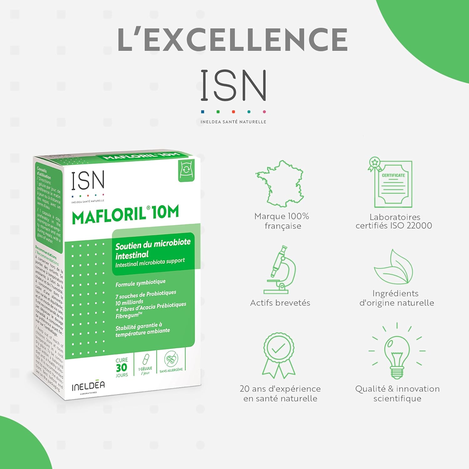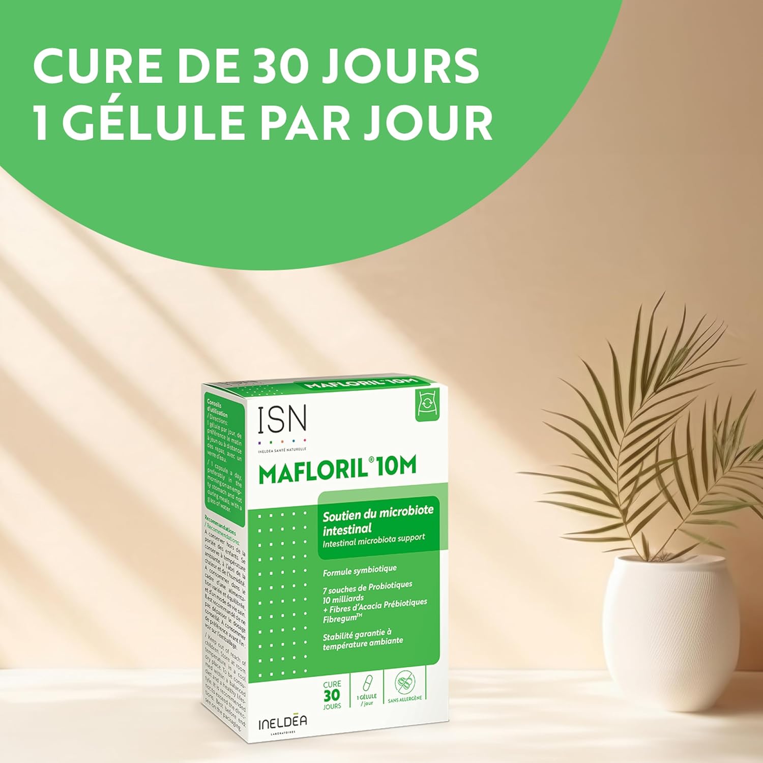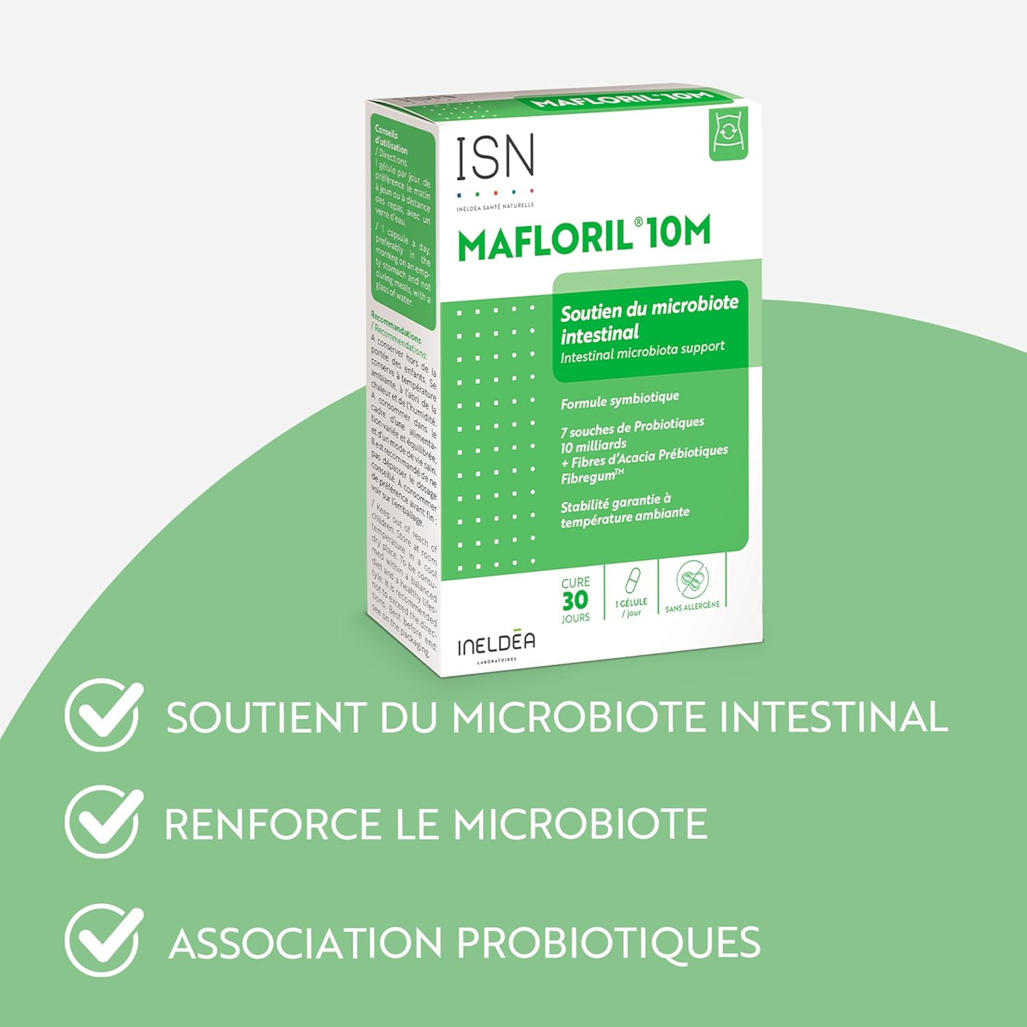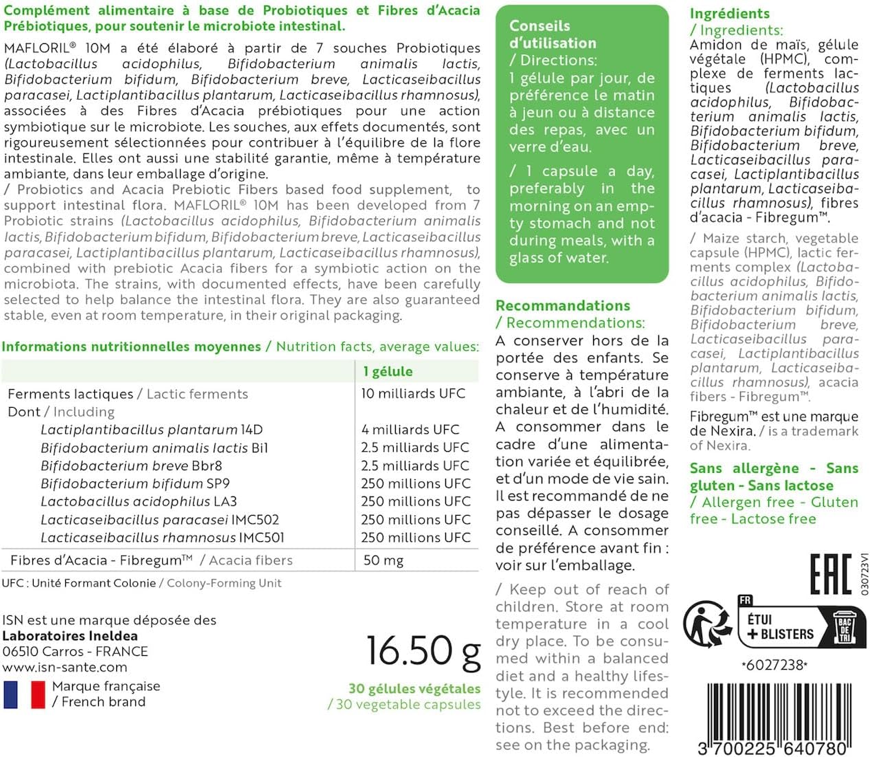 ISN – Mafloril 10M – Dietary supplement based on probiotics and prebiotic acacia fibres – 7 probiotic strains + prebiotic fibres – Support the intestinal microbiota – 30-day cure