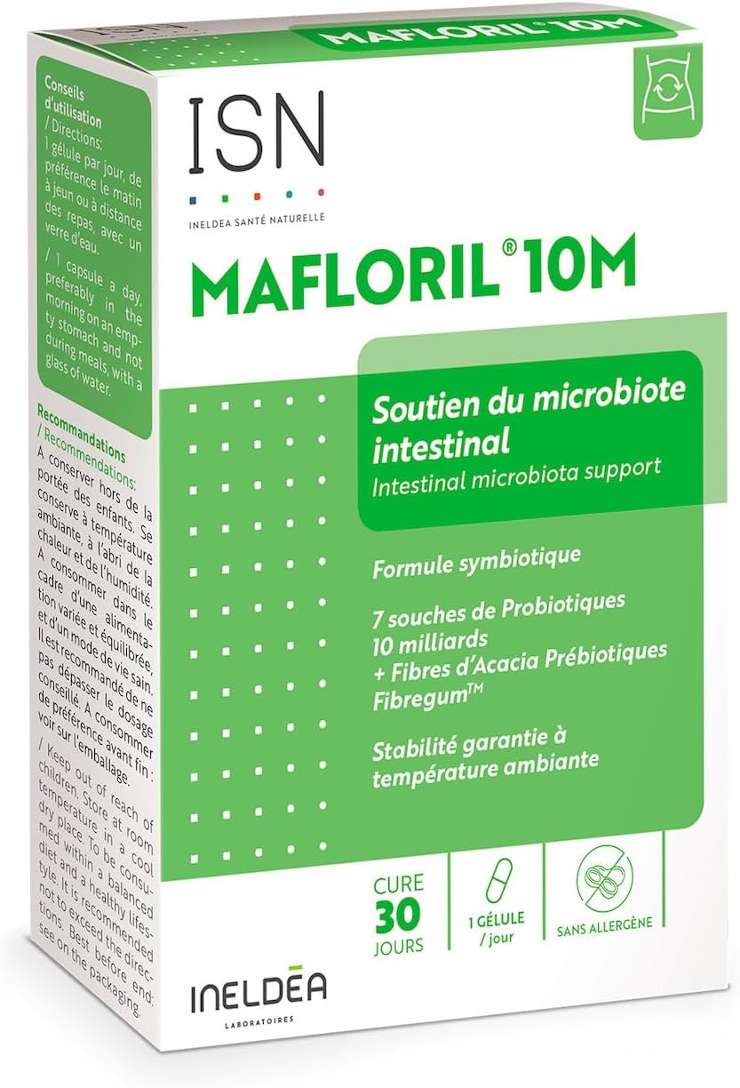 INTESTINAL MICROBIOTE SUPPORT: Digestive disorders, intestinal discomfort, fatigue ‘ Mafloril 10M food supplement offers a symbiotic formula combining probiotics and prebiotics. These are 7 strains of lactic ferments (Lactobacillus acidophilus,Bifidobacterium animalis ssp. Lactis, Bifidobacterium longum, Bifidobacterium breve, Lactobacillus paracasei, Lactobacillus plantarum, Lactobacillus rhamnosus) which have been carefully selected to help support the balance of intestinal flora.