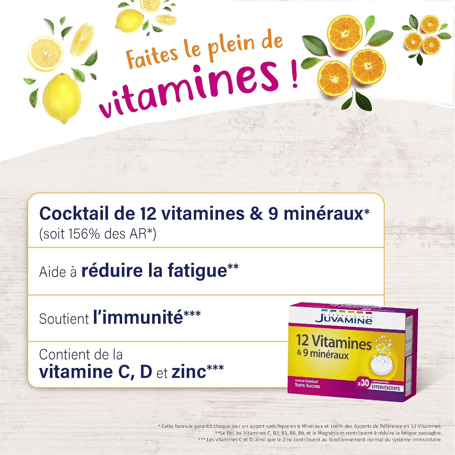 JUVAMINE 12 Vitamins & 9 Minerals, Fatigue, Stress, Vitamins C, B2, B3, B6, B9 and Iron, 30 Day Program, 30 Effervescent Tablets, Tropical Flavor, Made in France