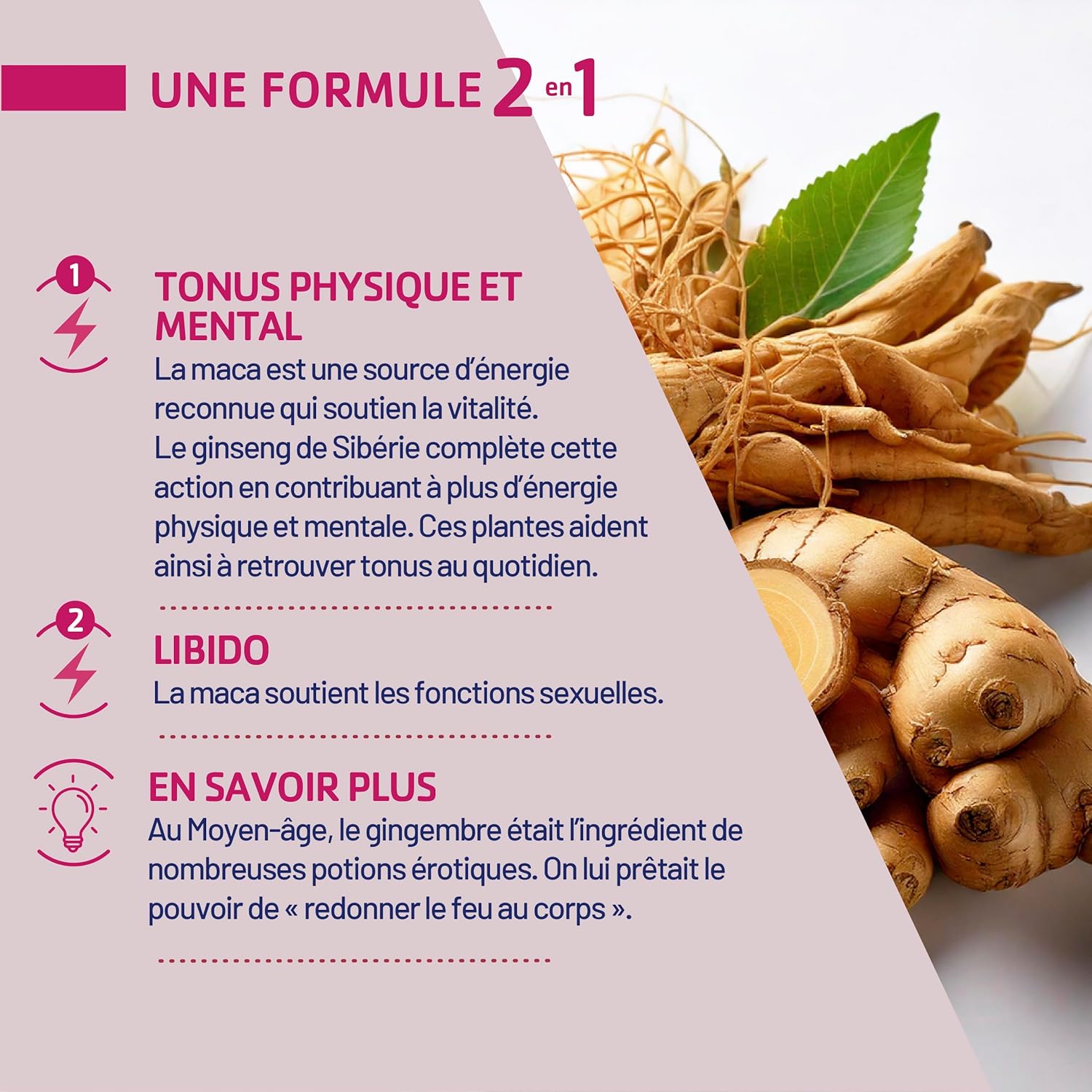 SUPPORTS PHYSICAL AND MENTAL ABILITIES: Maca is a tuber traditionally recognized for its stimulating, toning and revitalizing properties. Siberian Ginseng is a plant also called Eleutherococcus. It is known for its physical and intellectual toning properties, in case of fatigue.