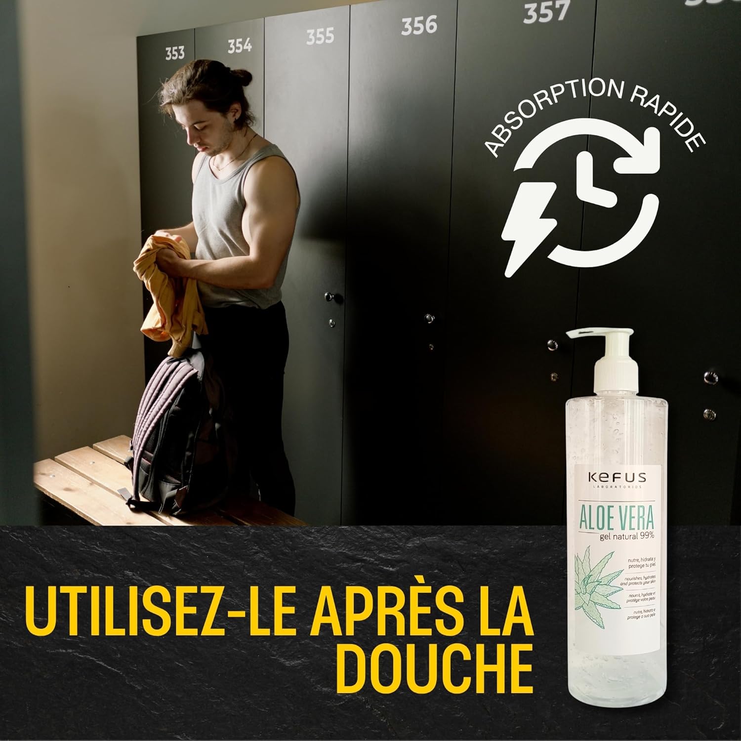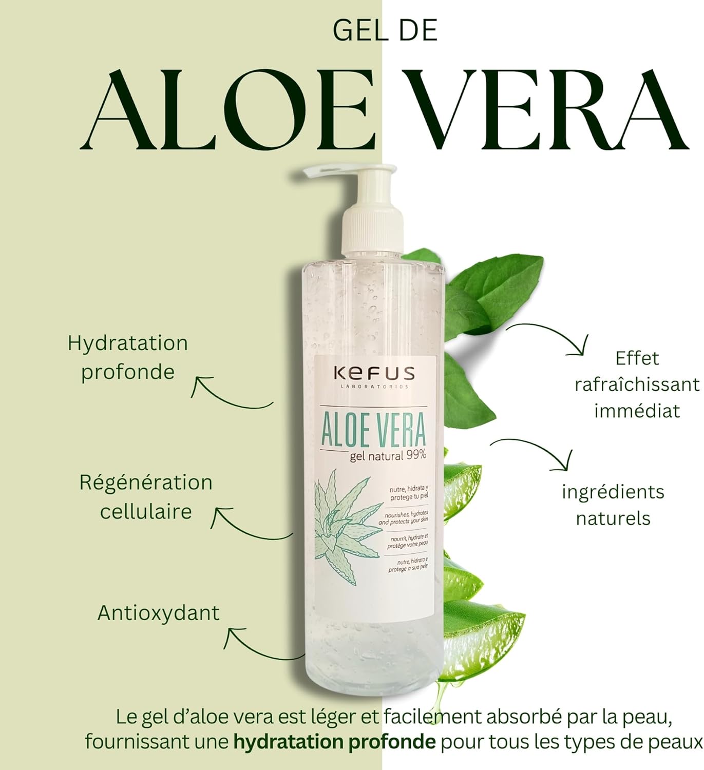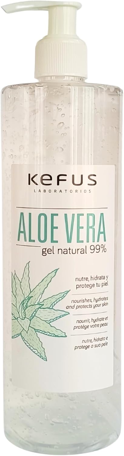 KEFUS Aloe Vera Gel is a multifunctional product that offers deep hydration and cellular regeneration for all skin types, especially the most sensitive. Its formula, rich in calming and restorative properties, makes it an ideal ally to relieve irritated, dry or damaged skin. Thanks to its high concentration of pure Aloe Vera, it provides an immediate cooling effect, being perfect for use after sun exposure, sunburn, insect bites, superficial wounds or after hair removal and shaving. Aloe Vera is known for its powerful anti-inflammatory and regenerative properties. Its regular use promotes healing of the skin, reducing redness and inconvenience. In addition, it helps prevent skin dryness, keeping skin hydrated and soft throughout the day. This gel is ideal to apply as a daily moisturizer, improving skin texture and elasticity, while fighting irritation and premature aging. Suitable for all skin types, even the most delicate, this gel acts not only as an effective moisturizer but also as a cellular regenerator. Its lightweight, fast-absorbing texture makes it a comfortable product to use on face, body and hair, without leaving sticky residue or greasy feeling. In addition, it is an excellent treatment for hair, helping to moisturize and restore, leaving soft and shiny. Its daily use provides constant hydration and promotes skin elasticity, making it healthier, fresh and rejuvenated. With antioxidant and nourishing properties, this gel also fights the signs of aging, restoring skin vitality and promoting a brighter and radiant appearance. With its high concentration of essential nutrients, Aloe Vera works in harmony with the skin to keep it hydrated, revitalized and protected from environmental damage.