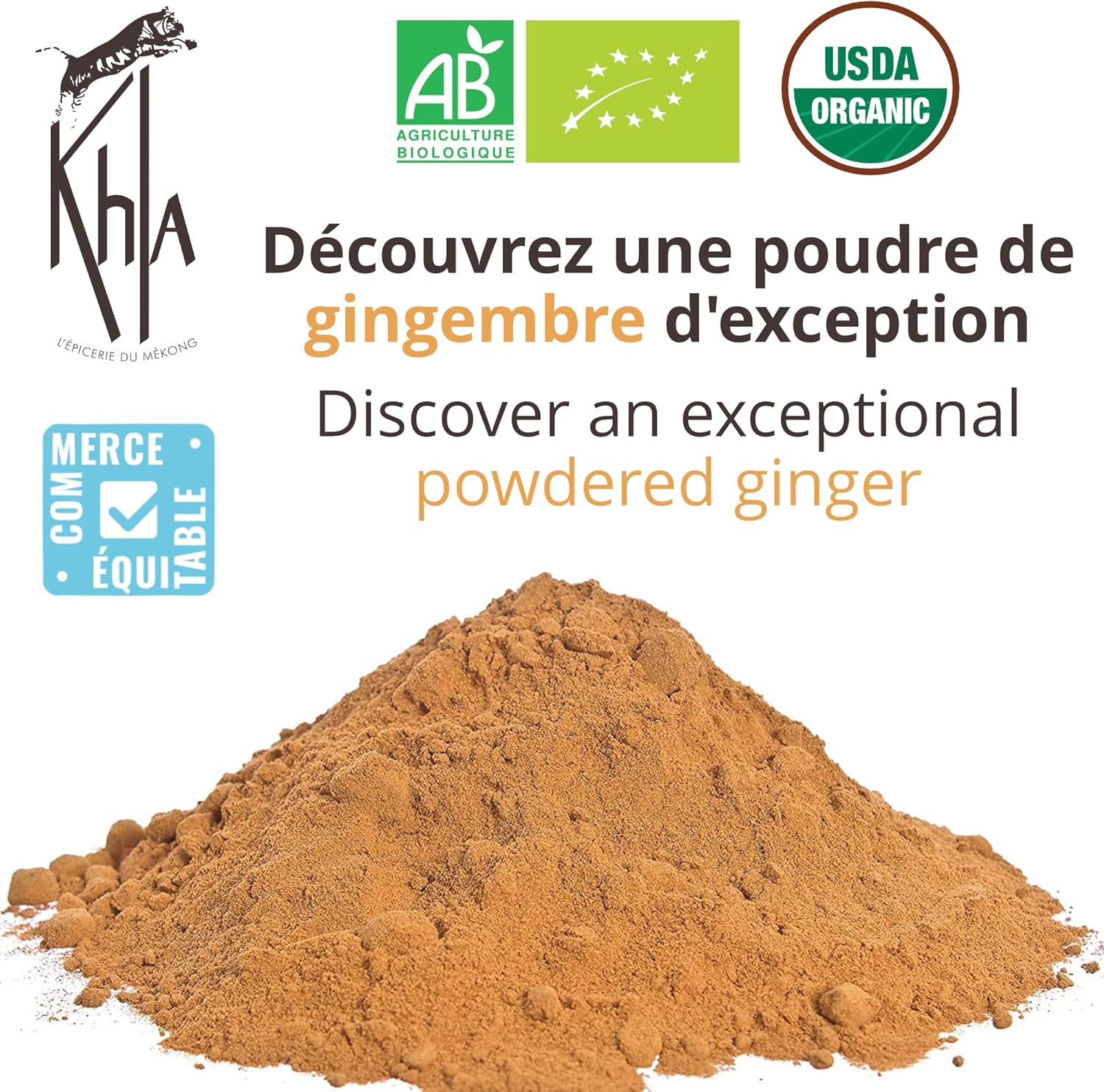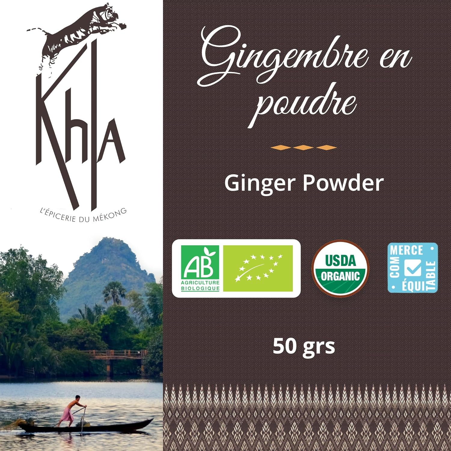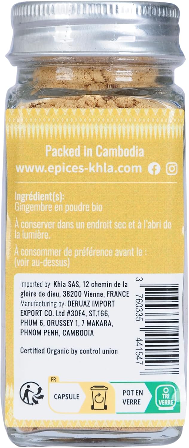 ✅ ORGANIC GINGER POWDER – Discover ginger powder, an exceptional spice for your cooking and baking recipes. From Vietnam, Khla ginger is a spice to use in your cooking recipes, for its fresh and powerful aromas, but also its many health benefits. ✅ AN EXCEPTIONAL GINGER – Our ginger powder is sourced from a small organic producer in Vietnam that respects our ethical charter. Dried ginger rhizomes are harvested and then carefully ground before being packed in our workshops in Cambodia. Widely used in Asian medicine, this spice has many energetic, antioxidant properties, while helping to relieve muscle pain and fever. ✅ SUBLIME YOUR RECIPES – Ginger can be used in cooking to bring a lemony and pungent flavor to your savory preparations: white and red meats, fatty meats, fish, vegetables, woks, curries, sushi, Asian dishes… It is also a must to enhance your sweet recipes based on fruit: pies, compotes, fruit salads, crumbles… or chocolate. Finally, it is ideal in your hot drinks, such as teas, infusions or hot chocolate. ✅ FRESHNESS GUARANTEED – Our ground ginger is packaged in a 50g resealable jar that guarantees its freshness. Practical packaging for everyday use while ensuring excellent product storage. Recyclable bag made from recycled materials. ✅ FRENCH BRAND – Khla (“le tiger” in Khmer), a Franco-Cambodian family business based in Kampot and specialized in exceptional delicatessen. Exotic flavors, PGI certifications and fair trade, we source our products directly from local producers and pack them in our workshops
