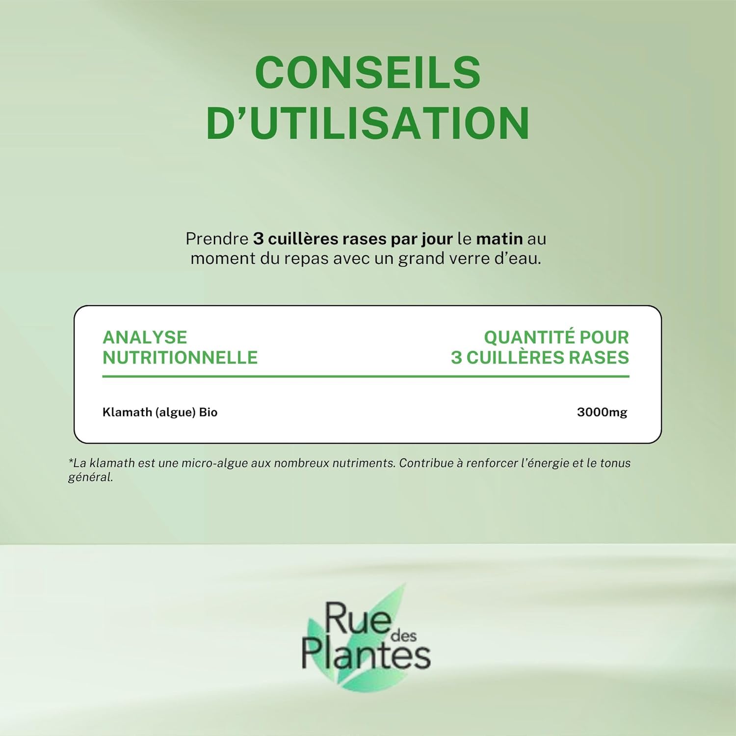 Directions for use: Mix 3 flat spoons (about 3g) of organic Klamath powder into a smoothie, juice or yogurt, preferably in the morning. Cure about 1 month with 100g or 5 months with 500g. To be consumed as part of a varied and balanced diet.