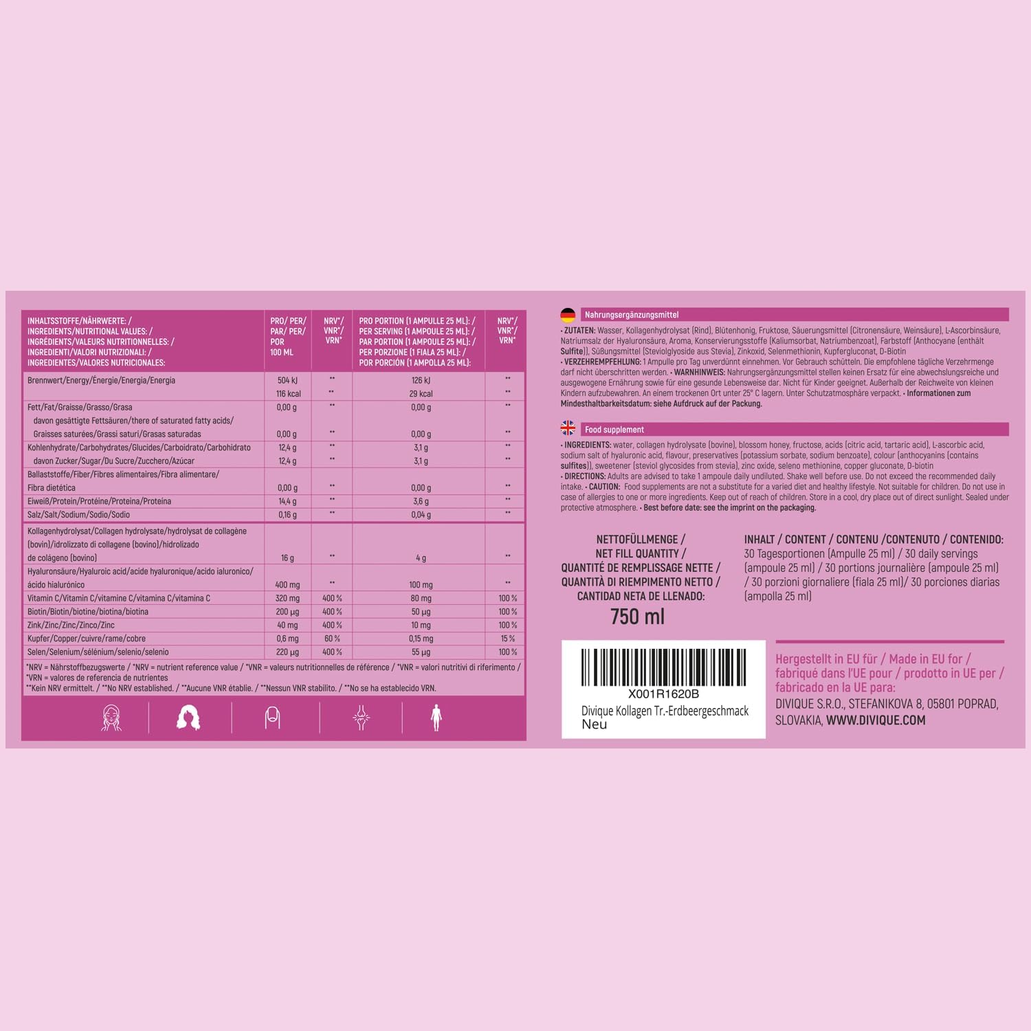 A delicious strawberry taste: Let yourself be seduced by the rich strawberry taste of the Divique Collagen drinking bulbs. The delicate sweetness of flower honey combined with a touch of stevia makes each dose a special moment of pleasure, which you will look forward to every day.