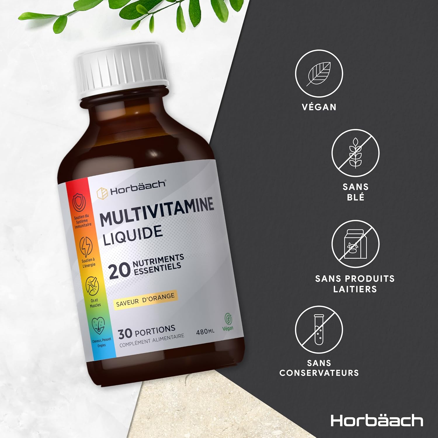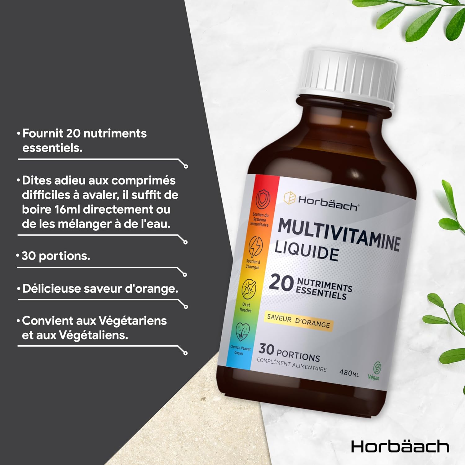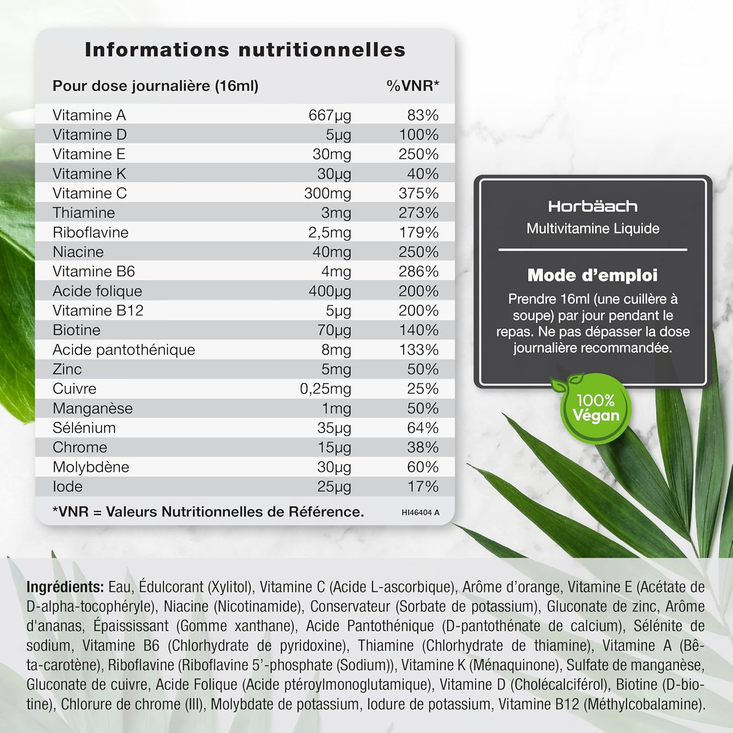 Horbaach’s multivitamin and mineral supplement has been expertly formulated to support your overall health and well-being. Each serving contains a powerful blend of 20 essential vitamins and minerals, carefully selected to meet your daily nutritional needs. A single dose of 15 ml (one teaspoon!) provides a robust mix of nutrients.