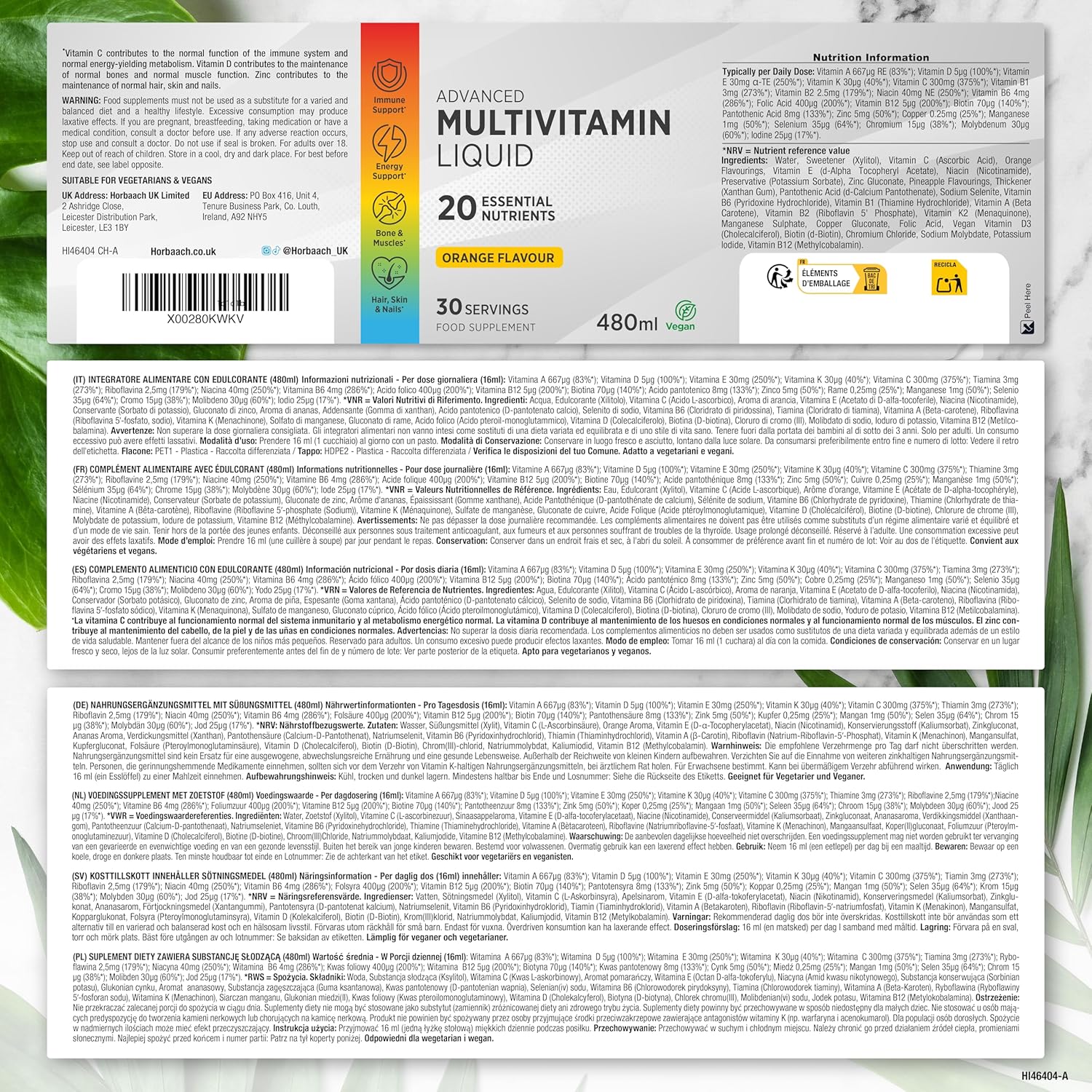 Liquid Multivitamin | 480ml | Vegan Food Supplement With 20 Essential Nutrients | Vitamin C, A, D, B6, B12 and Folic Acid and More | Men and Women | Multivitamin Liquid | by Horbaach