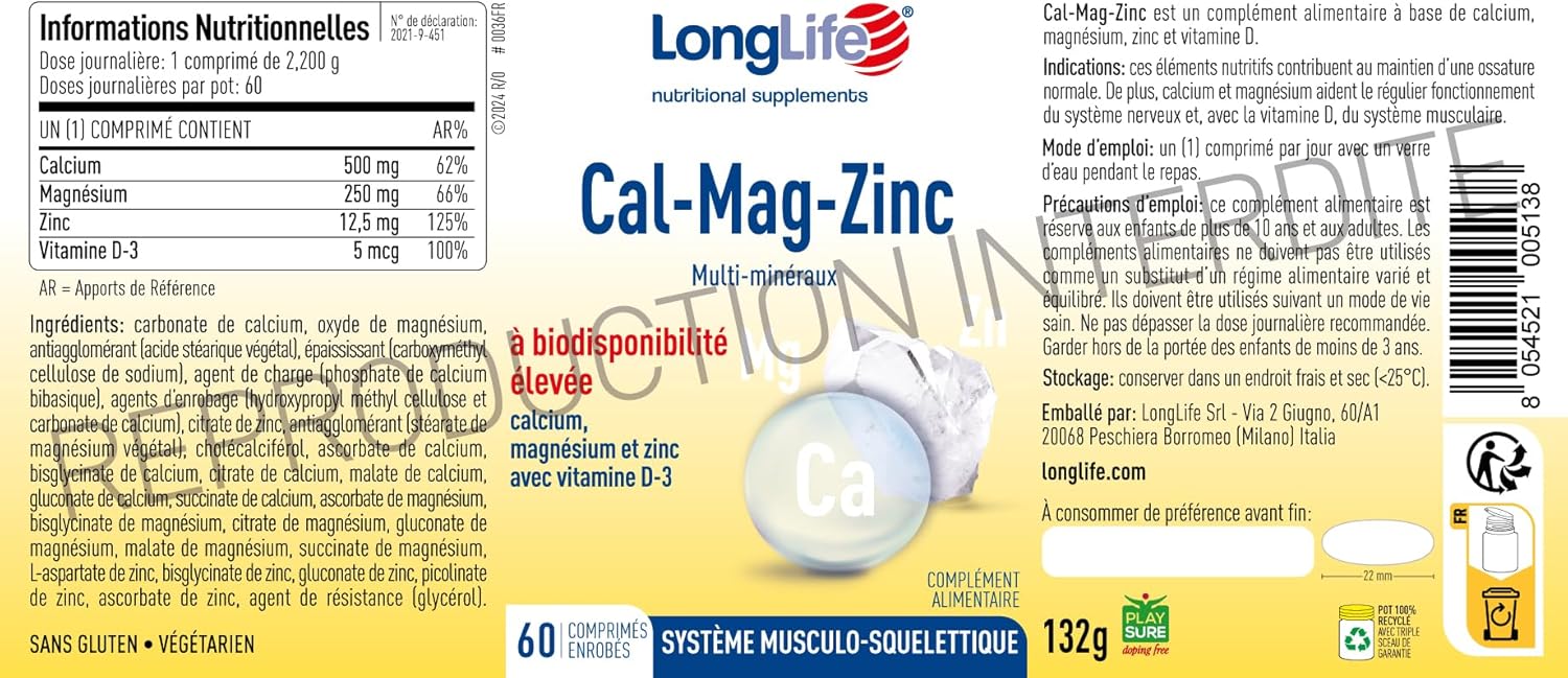 VEGETARIAN AND EASY TO SWALL: Cal-Mag-Zinc Longlife is formulated with 22mm coated tablets, easy to swallow. This supplement is ideal for vegetarian diets and is gluten-free. It is advisable to take one (1) tablet daily with a glass of water during the meal.