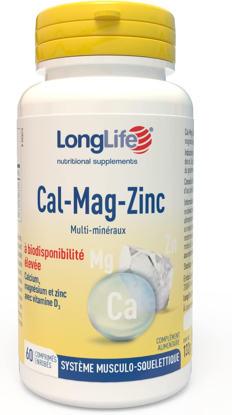 LongLife Cal-Mag-Zinc | Calcium Magnesium & Zinc with Vitamin D | High Bioavailability | Helps Nervous System & Bone Health | 60 Tablets | Vegetarian & Gluten Free