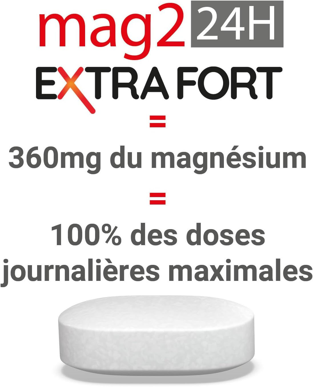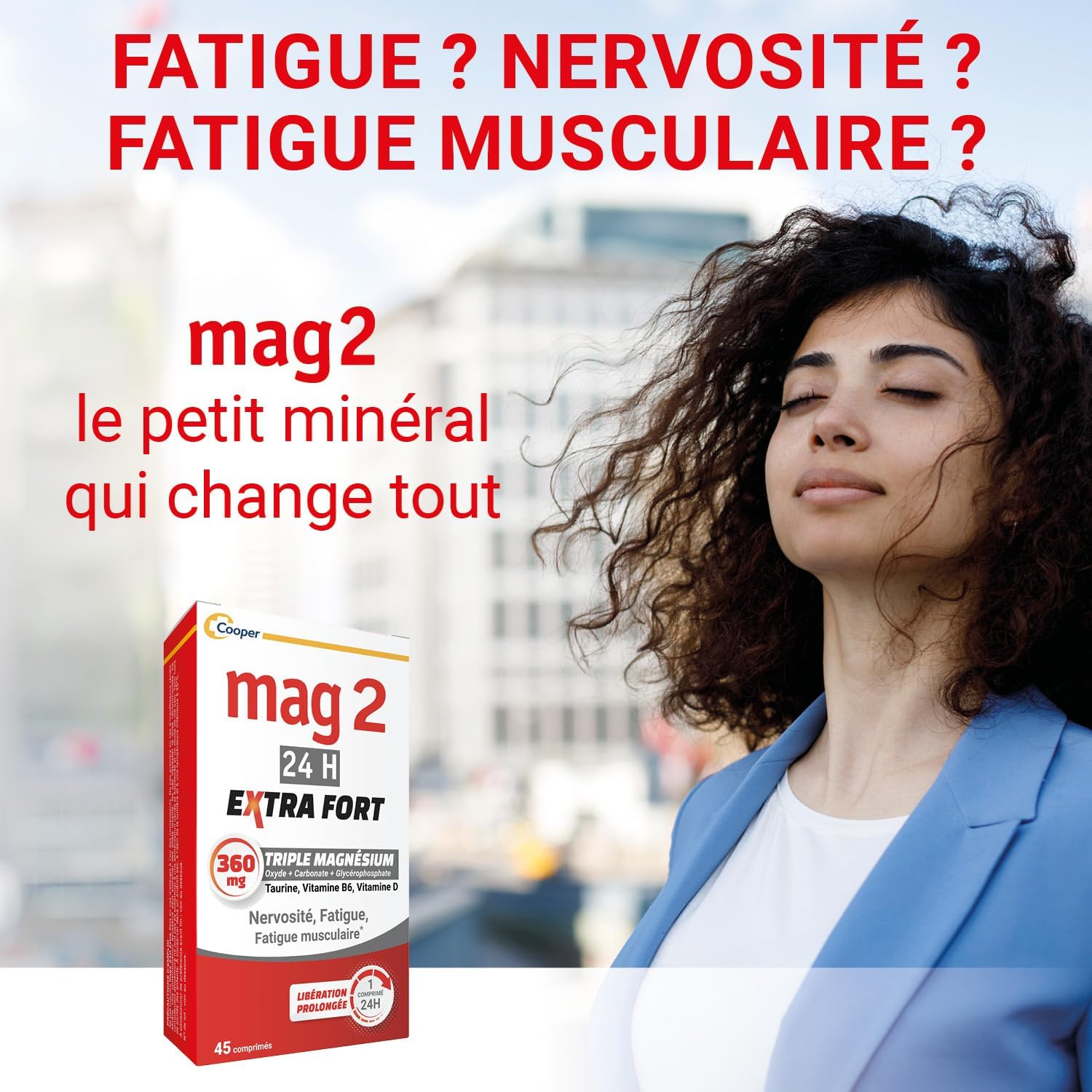 ANTI-NERVOSITY AND ANTI-FATIGUE FOOD SUPPLEMENT: MAG 2 24 h Extra Strong contains magnesium, vitamin B6, vitamin D and taurine to help you fight nerve and muscle fatigue. Magnesium and vitamin B6 contribute to the reduction of fatigue and contribute to the normal functioning of the nervous system. Magnesium and vitamin D contribute to normal muscle function. THREE SOURCES OF MAGNESIUM FOR BETTER ABSORPTION: MAG 2 24h Extra Strong Food Supplement contains 3 different sources of magnesium (magnesium oxide, magnesium glycerophosphate and magnesium carbonate). Thanks to the prolonged release of the tablet, all three forms of magnesium are gradually diffused in the body. This allows a better absorption, more sustained over time. FORMULA – 100% OF MAGNESIUM DAILY NEEDS: Provides the maximum recommended daily dose of magnesium (360mg). MAG2 The expert brand in magnesium. Mag2 supplements provide the necessary dose of magnesium to reduce fatigue and nervousness. With a complete range for the whole family, Mag2 accompanies you in your daily well-being.