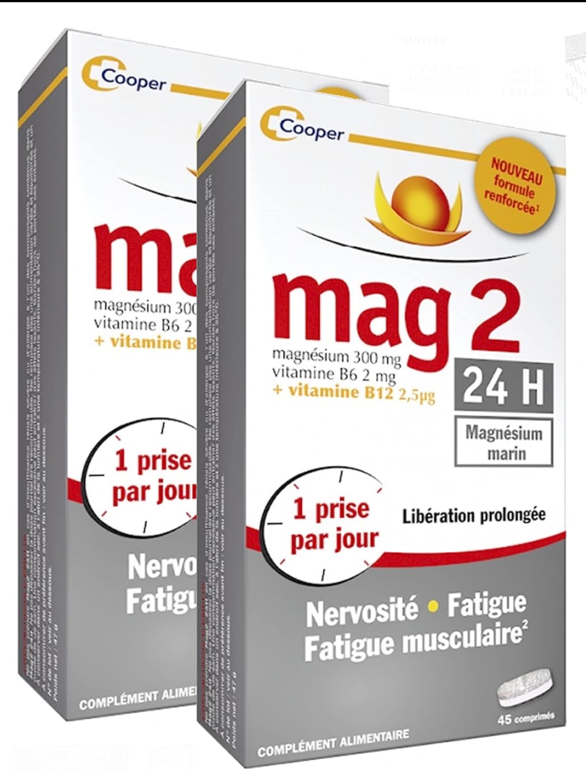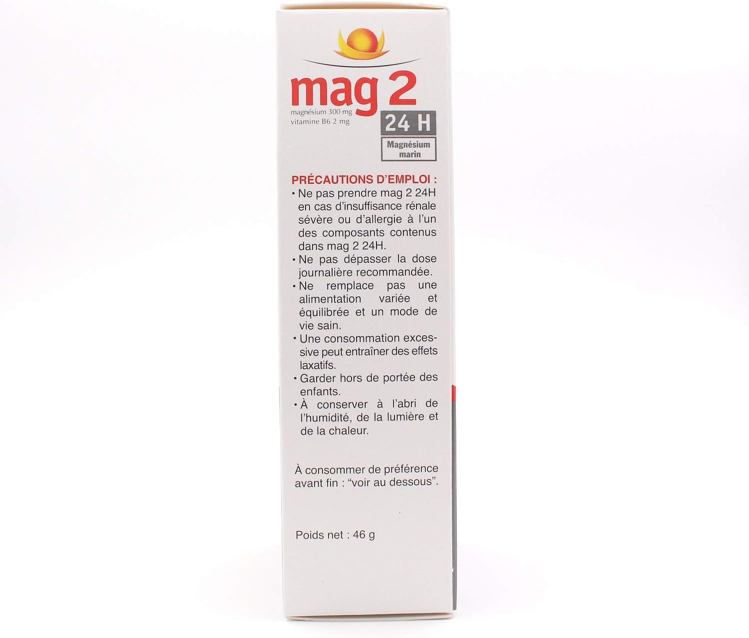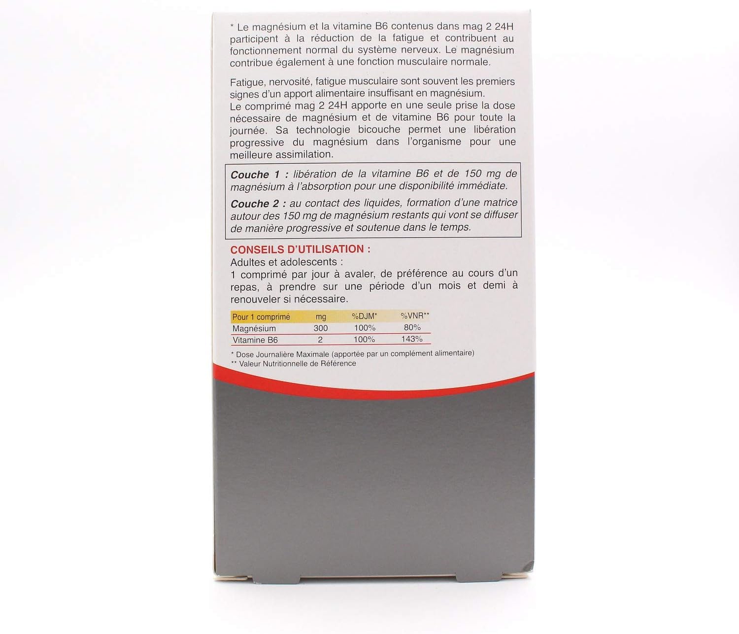 Description: MAG 2 24H is a food supplement based on magnesium and vitamin B6. The magnesium and vitamin B6 contained in MAG 2 24H contribute to the reduction of fatigue and contribute to the normal functioning of the nervous system. Magnesium also contributes to normal muscle function. Fatigue, nervousness, muscle fatigue are often the first signs of insufficient magnesium intake of food. The MAG 2 24H tablet provides the necessary dose of magnesium and vitamin B6 in a single dose for the whole day. Its bi-layer technology allows a gradual release of magnesium into the body for better assimilation. This dietary supplement is not a substitute for a varied and balanced diet and a healthy lifestyle.