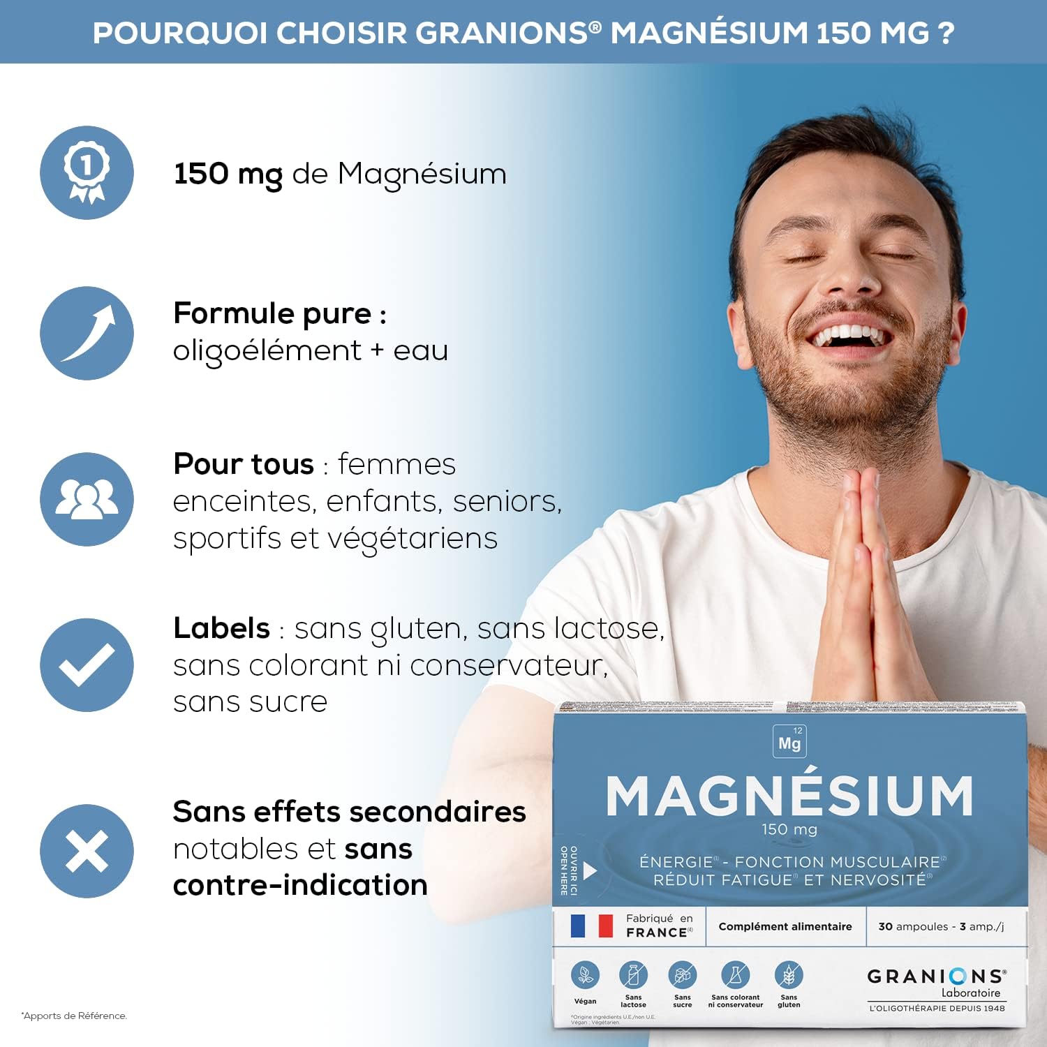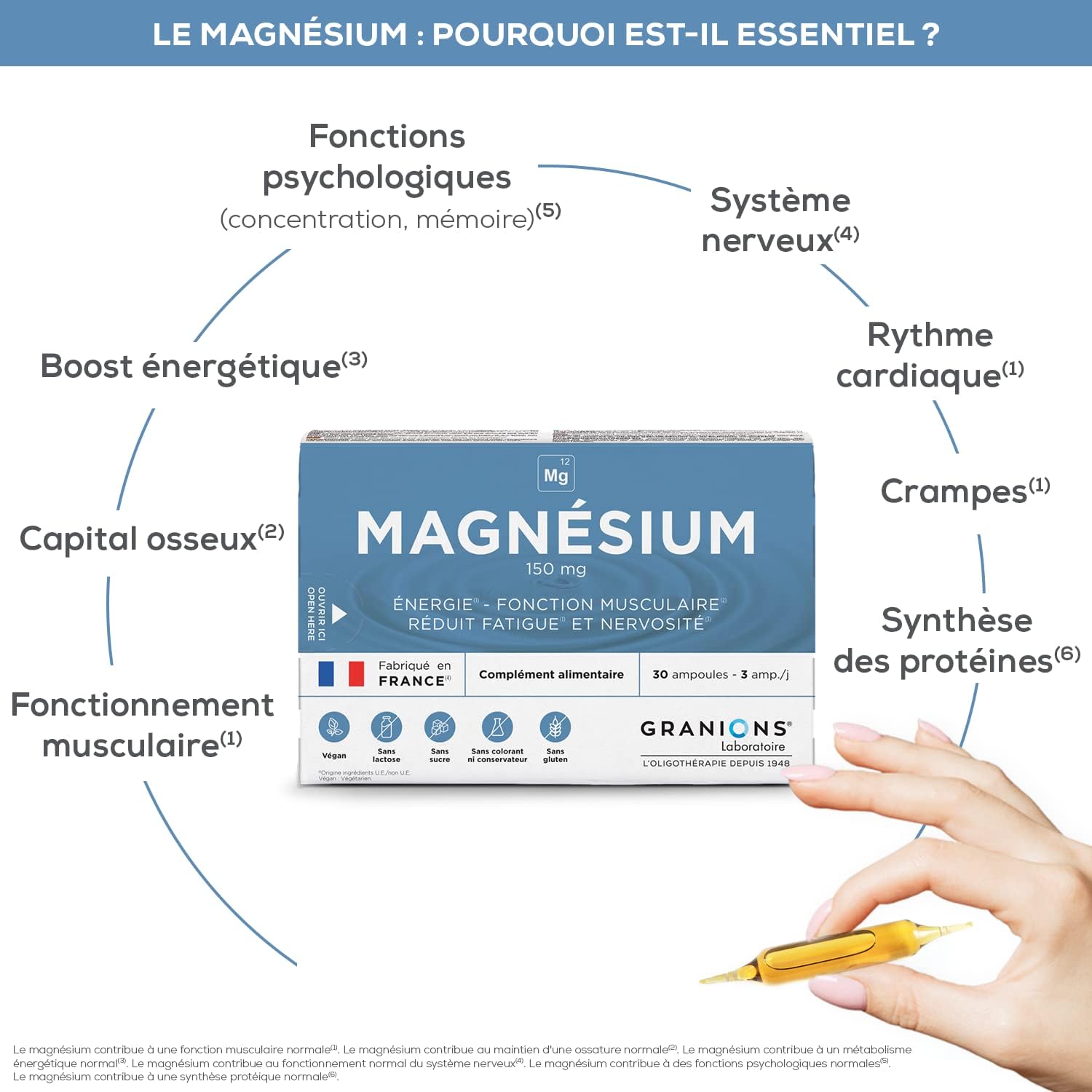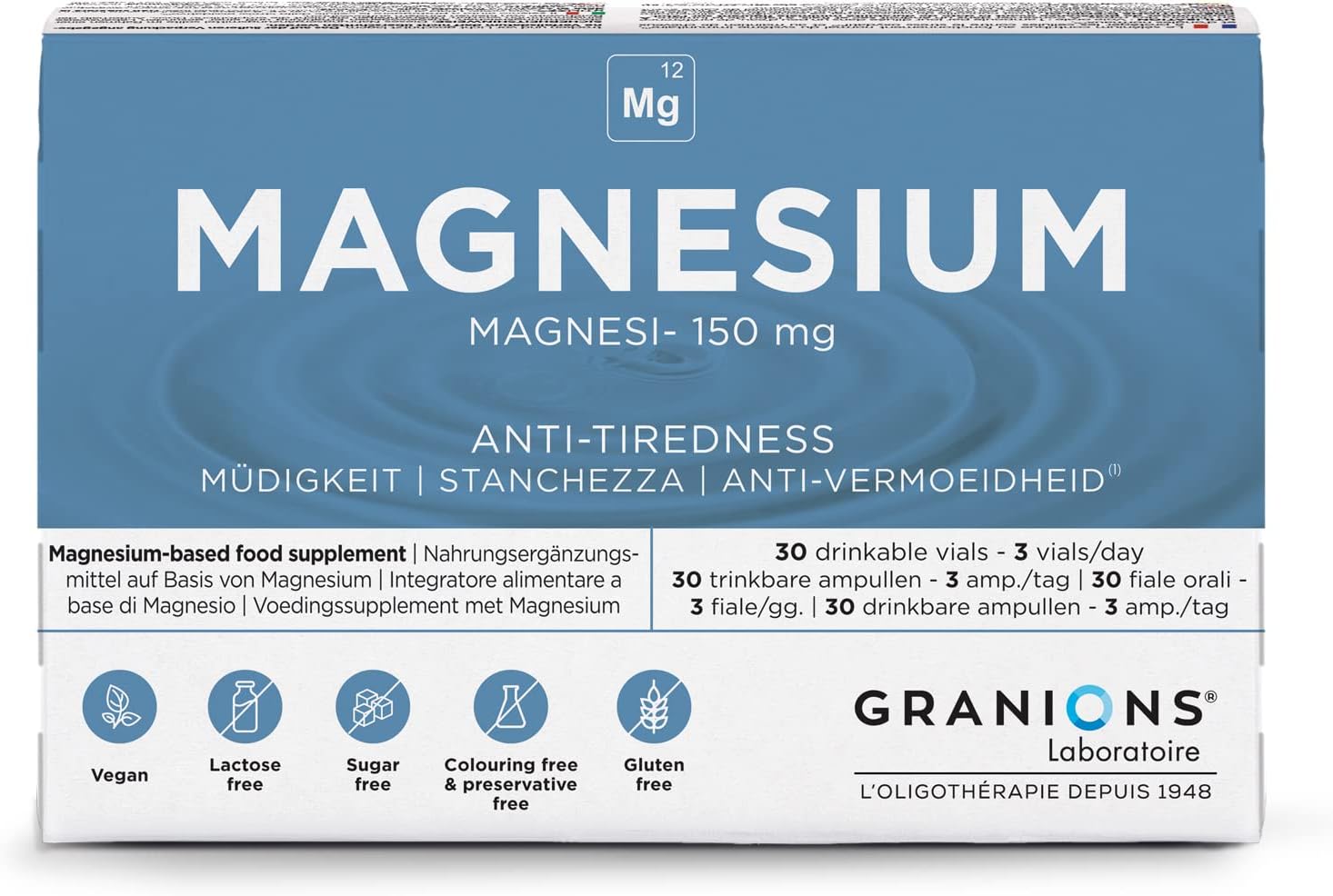 Magnesium Ampoules 150 mg – GRANIONS – Made in France – Energy – Muscle Function – Fatigue – Nervousness – 150 mg Magnesium – 30 ampoules = 10 DAYS