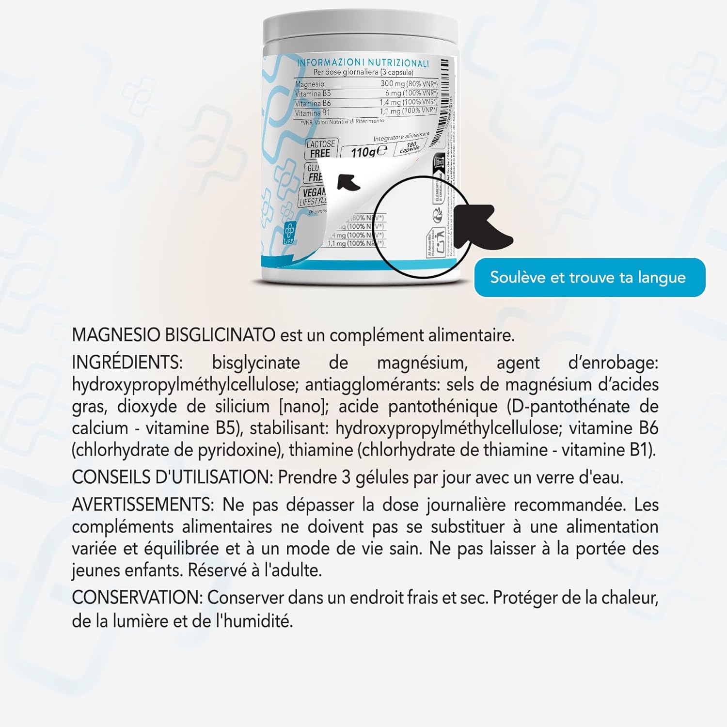 The addition of vitamins B1, B6 and B5 to the supplement magnesium glycinate amplifies its benefits. Vitamin B1 supports energy and nervous metabolism, while vitamin B6 promotes and regulates mood. Vitamin B5 is involved in energy production. Together with natural magnesium, these vitamins work synergistically to promote muscle relaxation