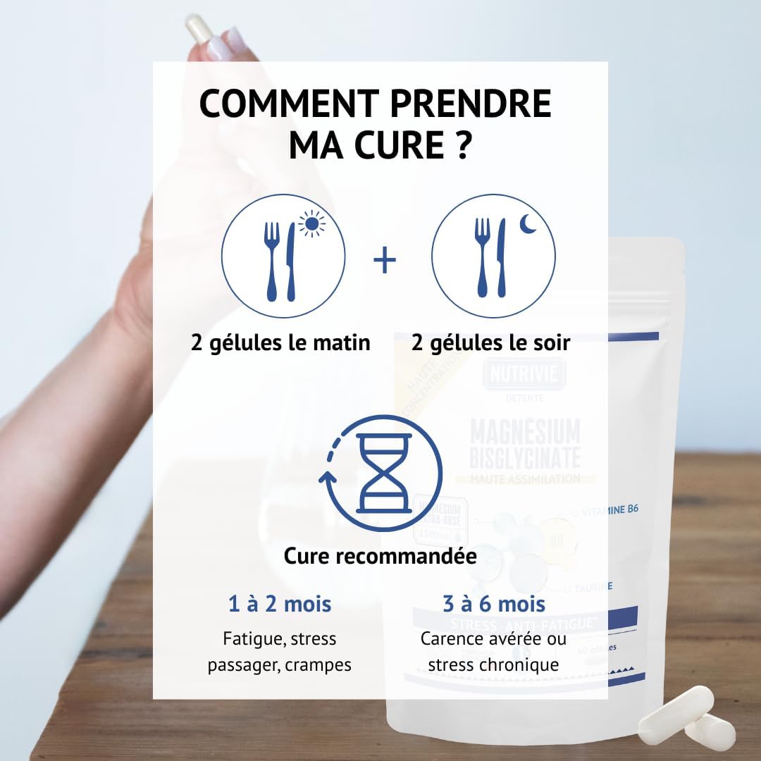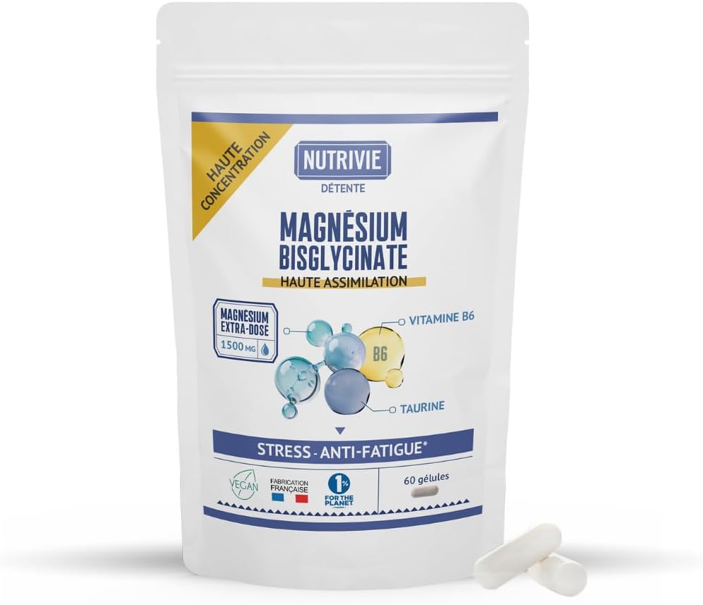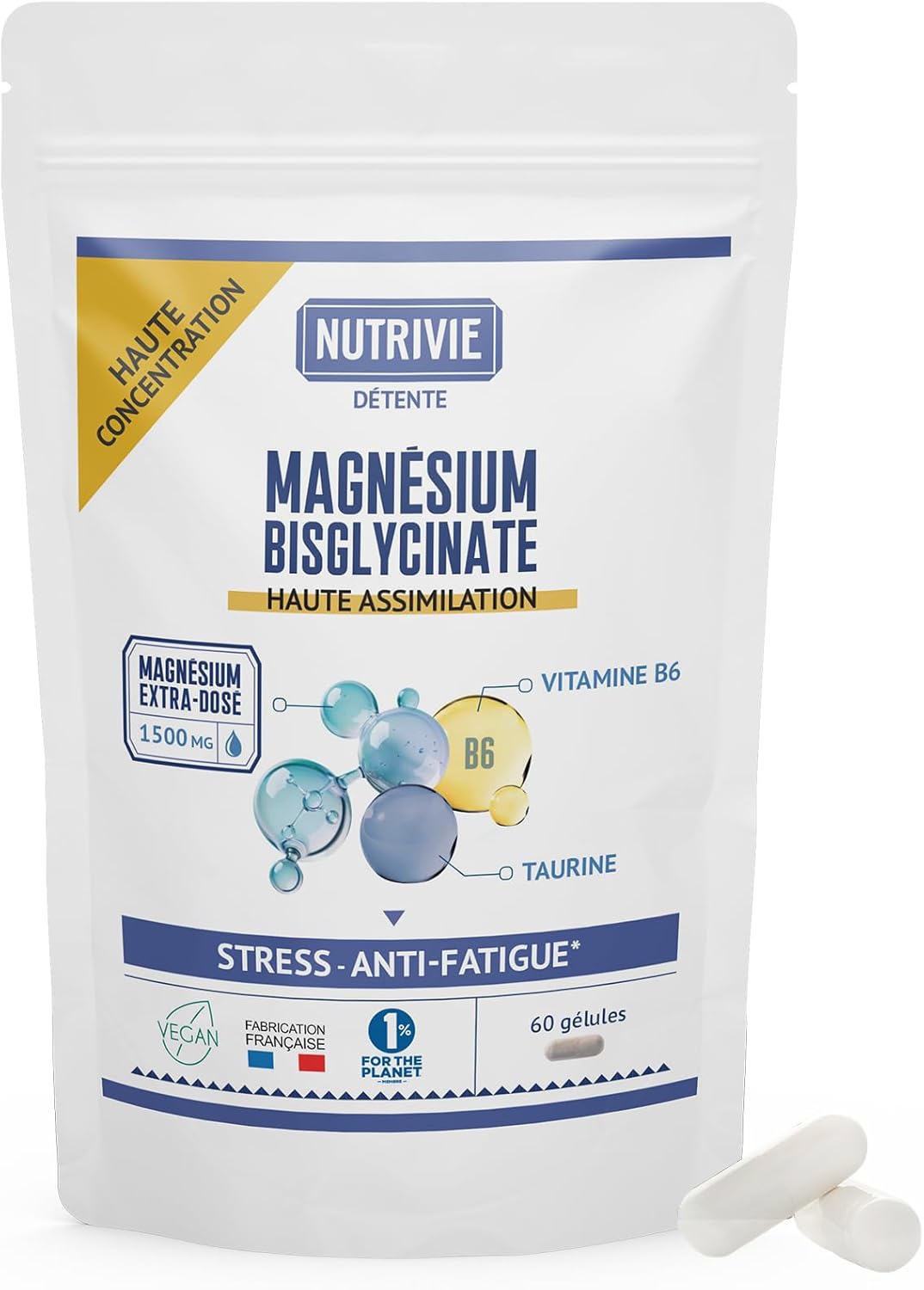 Magnesium Bisglycinate 1500 mg – Vitamin B6 & Taurine – Stress, Fatigue & Sleep – High Absorption & High Concentration – 60 Capsules – Made in France – Nutrivie