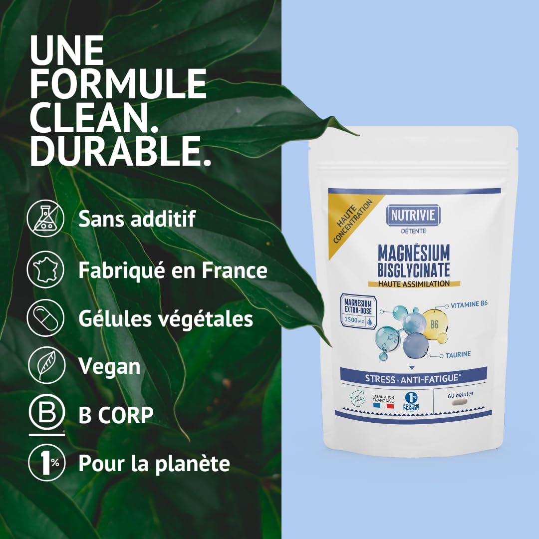 Discover Magnesium Bisglycinate Nutrivie, the most assimilable form of magnesium, combined with vitamin B6 and taurine for optimal efficiency. This dietary supplement helps reduce fatigue, promote relaxation and support the proper functioning of the nervous and muscular system. Made in France, without additives or preservatives, it offers a highly bioavailable and gentle formula for the digestive system. Ideal for times of stress, overwork or low energy.
