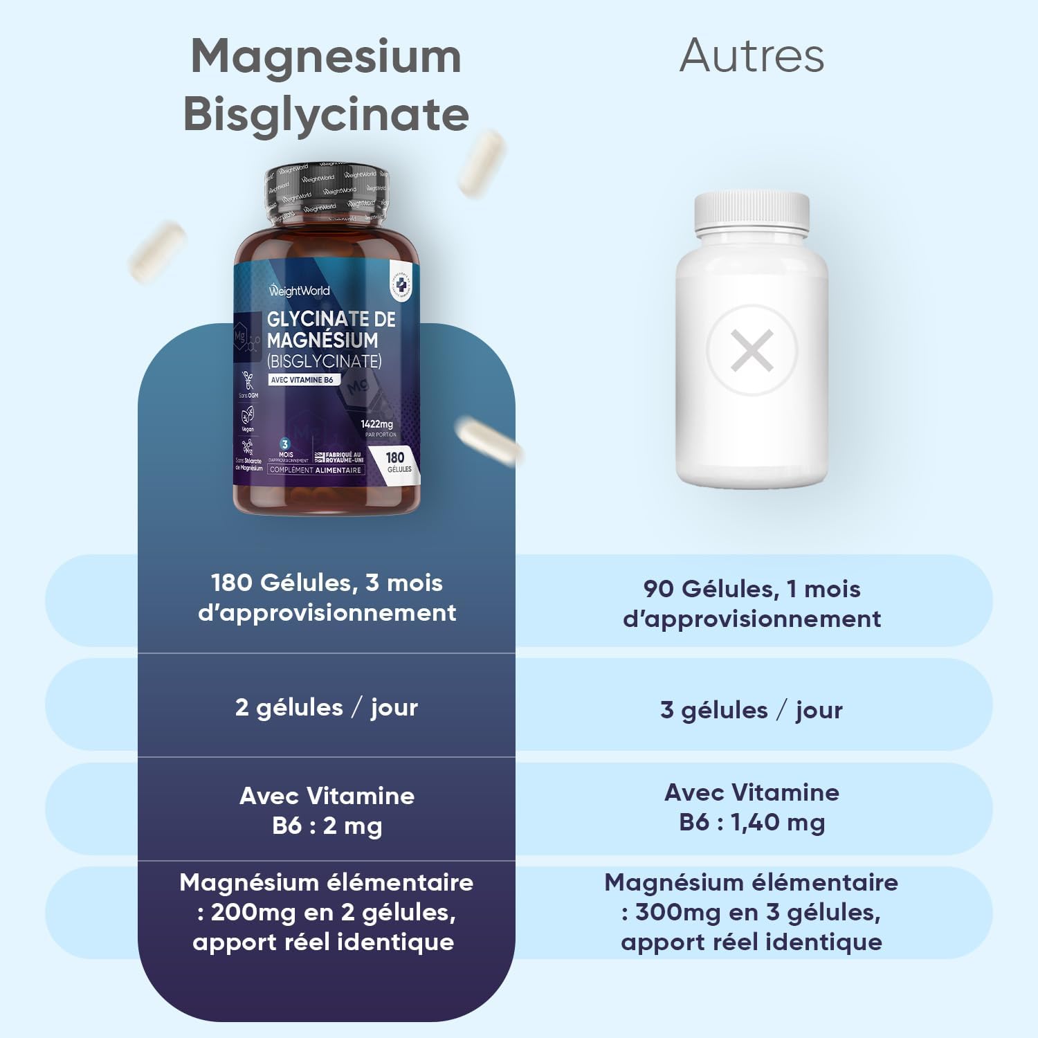 Generous 3 Month Supply – Each serving of 2 capsules provides a total of 1,422 mg, including 1,420 mg of magnesium bisglycinate (magnesium glycinate) and 2 mg of vitamin B6 (as pyridoxine hydrochloride). This formula provides 200 mg of elemental magnesium per serving, for a complete and sufficient routine for 3 months.