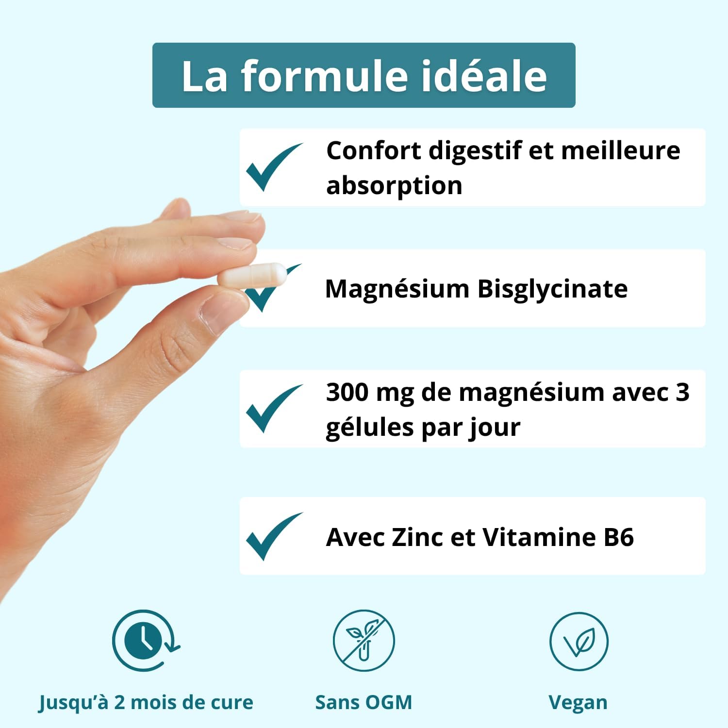 ✅ MAXIMUM EFFICIENCY WITH BISGLYCINATE ●● We have selected exclusively Magnesium and Zinc Bisglycinate, renowned for their superior assimilation by the body. Unlike other forms (oxide, citrate, chloride, marine magnesium), this formulation ensures better tolerance and avoids digestive discomfort.