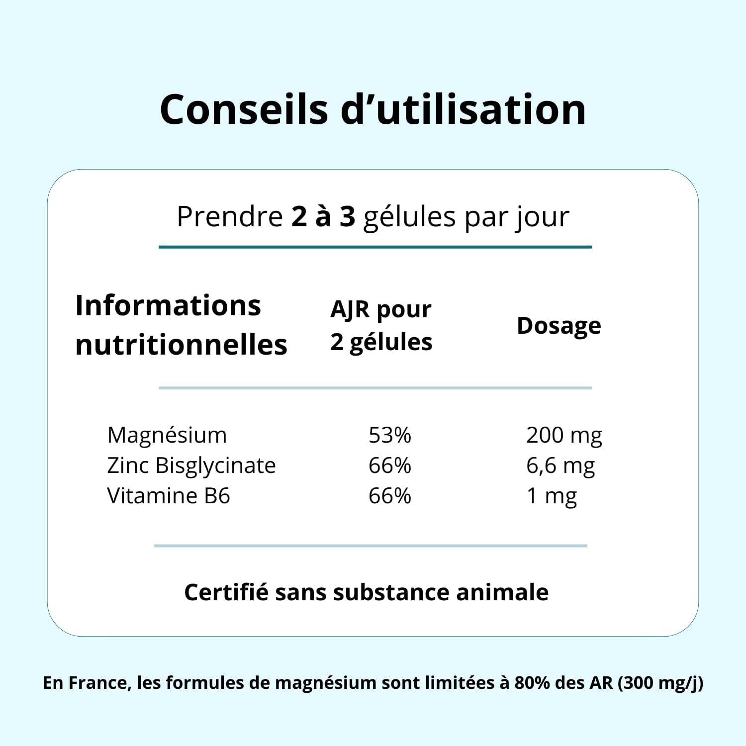 ADAPTABLE DOSAGE ●● Each capsule provides a synergistic amount of zinc magnesium to meet all needs. For moderate stress or mild fatigue, take 2 capsules daily (1 for breakfast, 1 for dinner). In case of stress or intense fatigue, switch to 3 capsules (1 with each meal).