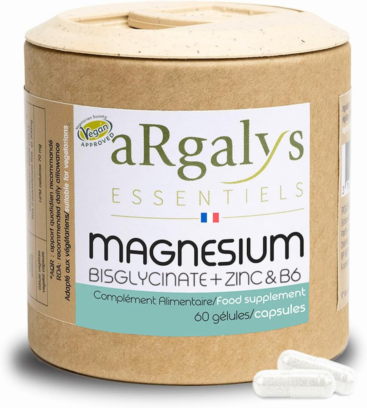 Magnesium Bisglycinate & Zinc Bisglycinate + Vitamin B6, High Content 300mg /d, Combat Fatigue – Stress, Bioavailability, 60 Capsules – Vegan, ZMA, Made in France, Argalys Essentiels