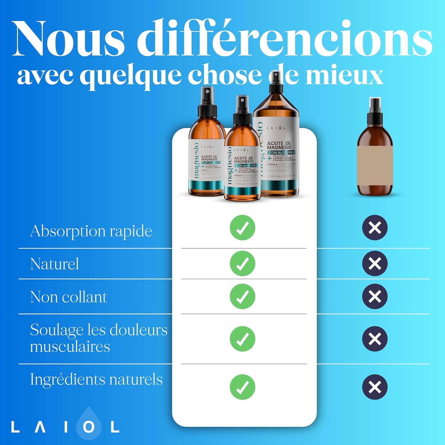 Enhanced sleep – Laiol bio magnesium spray is your nighttime ally. Apply before sleep and enjoy a deep, restful sleep thanks to its relaxing formula that soothes body and mind.