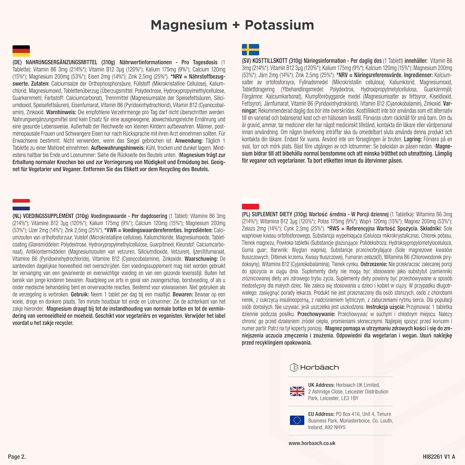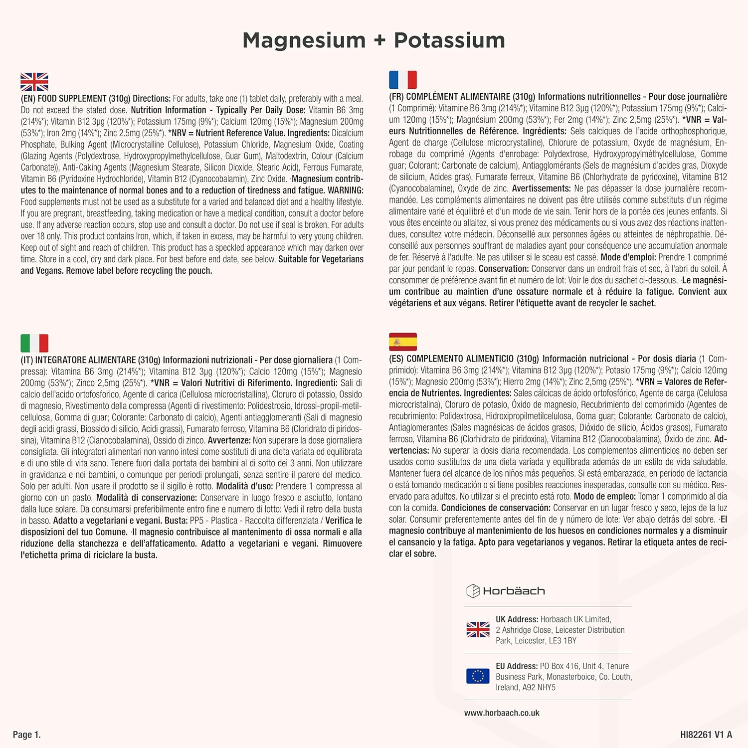 SUITABLE FOR: Horbaach Magnesium Potassium Complex contains no artificial colours, flavors or preservatives. It is the perfect formula for adult women and men at the best price.