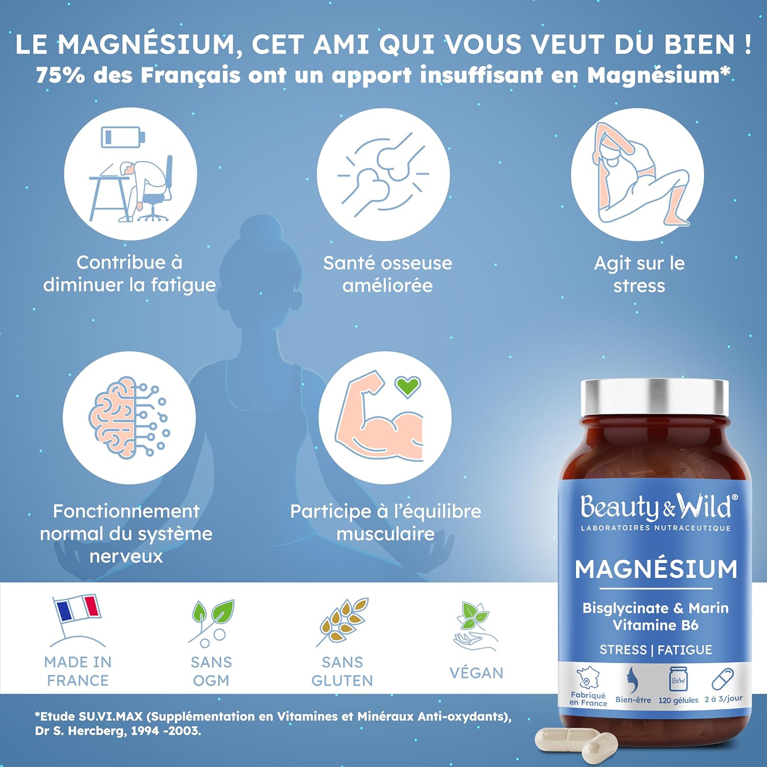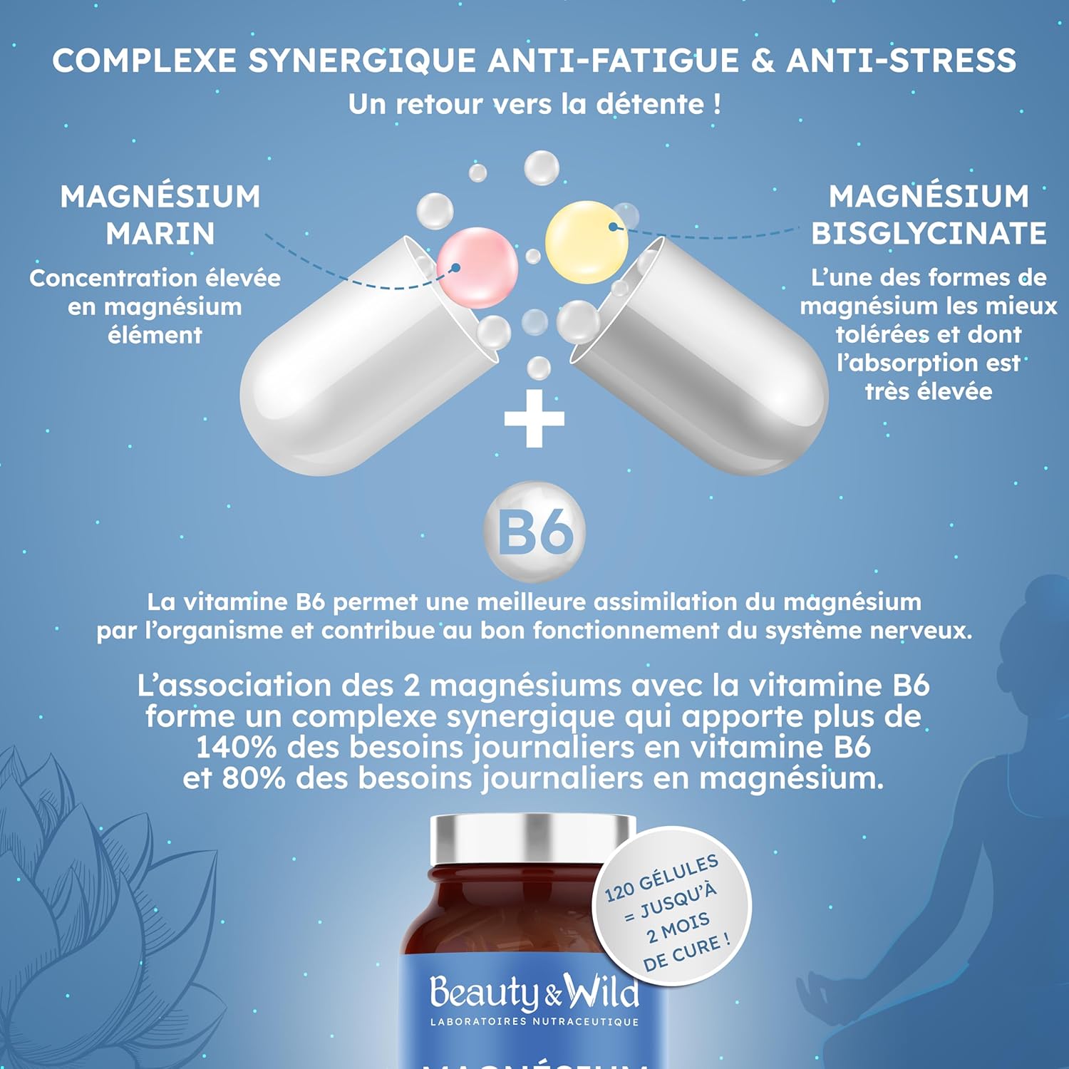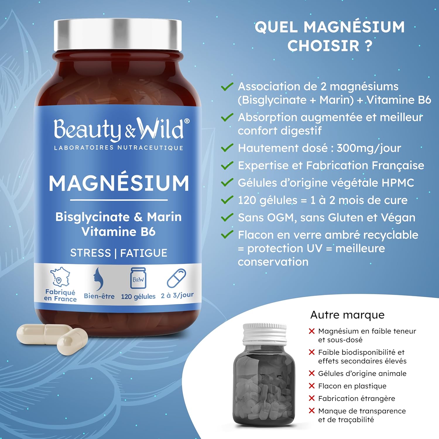 Magnesium + Vitamin B6 | Magnesium Bisglycinate, Marine Magnesium | Anti-Stress, Fatigue, Cortisol | High Content & Absorption | 300mg/day | 120 Capsules | Made in France | Beauty & Wild